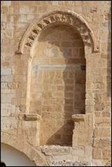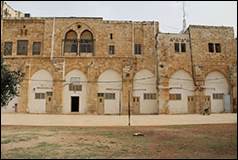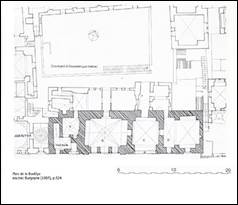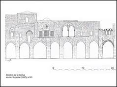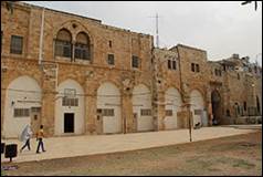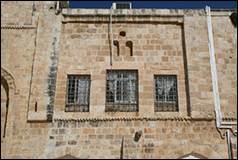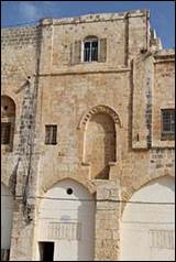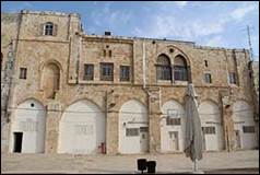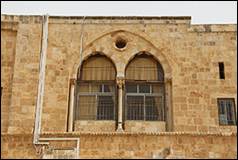 La partie de l’édifice, avec la façade ornée et ses ouvertures, est élevée sur le portique nord et en avant du khânqâh al-Dawâdârî (695/1295), elle prolonge la façade de la madrasa al-Aminîya construite depuis 730/1329 (ill.1-4), ces doubles ouvertures à arc brisé avec vue sur le Haram (ill.6) ont déjà été expérimenté à la madrasa al-Manjakîya (761/1359), à la madrasa Is’ardîya (770/1368) et sur la future madrasa al-‘Uthmanîya (840/1437). Les autres structures sont construites sur le toit de la Dawadarîya et au niveau de la rue. L’accès se faisait en traversant la cour de la Dawâdârîya en contrebas (ill.1). Depuis le Haram un escalier construit contre le portique offrait un second accès indépendant (ill.7, 8).