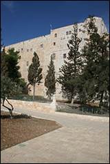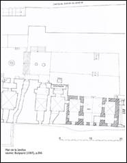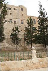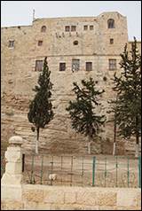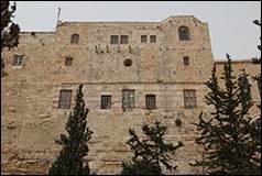 L’édifice s’appuie sur le Rocher d’Antonia qui domine le Haram (ill.1-2), du coup le mur a été travaillé pour recevoir des ouvertures et une façade en ablaq. Anciennement ce site accueillait la Chapelle du Repos[2] et la tombe du shaykh Ayyûbide Darbas al-Kurdî al-Hakkarî[3], ces édifices étant inclus dans l’enceinte de la madrasa. En 832/1429 elle est probablement réorganisée en palais du gouverneur (Dâr al-Niyâba) par le gouverneur de Jérusalem Shujâ’ al-Dîn Shâhîn, elle gardera cette fonction jusqu’en 1870.[4] Une loggia sur le modèle cairote servant aux réunions de la cour est rajoutée par le gouverneur Khidrbak en muharram 892/28.XII.1486-26.I.1487.