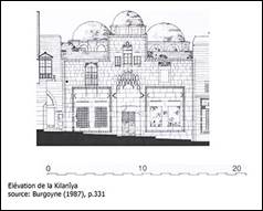 L’édifice est limité à l’ouest par la salle voûtée d’un édifice Croisé et à l’est par un édifice antérieur à la place duquel sera élevée la madrasa Tazîya (762/1361), il se compose de deux salles à coupole reliées entre elles par un corridor et un portail (ill.1, 2), ce type d’aménagement symétrique est courant dans les tombeaux Mamluk à Damas. La façade, symétrique, présente un portail à muqarnas (ill.2, 8-10) encadré par des doubles ouvertures délimitées par des moulures (2, 4-7). Deux autres ouvertures plus petites et trois ouvertures au-dessus du portail complète la façade sur rue, qui n’offre aucun décor.