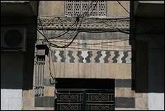 Un encadrement de porte en ablaq, typique de la période Mamluk, réutilisé comme entrée d’un immeuble moderne, sans plus de précision.