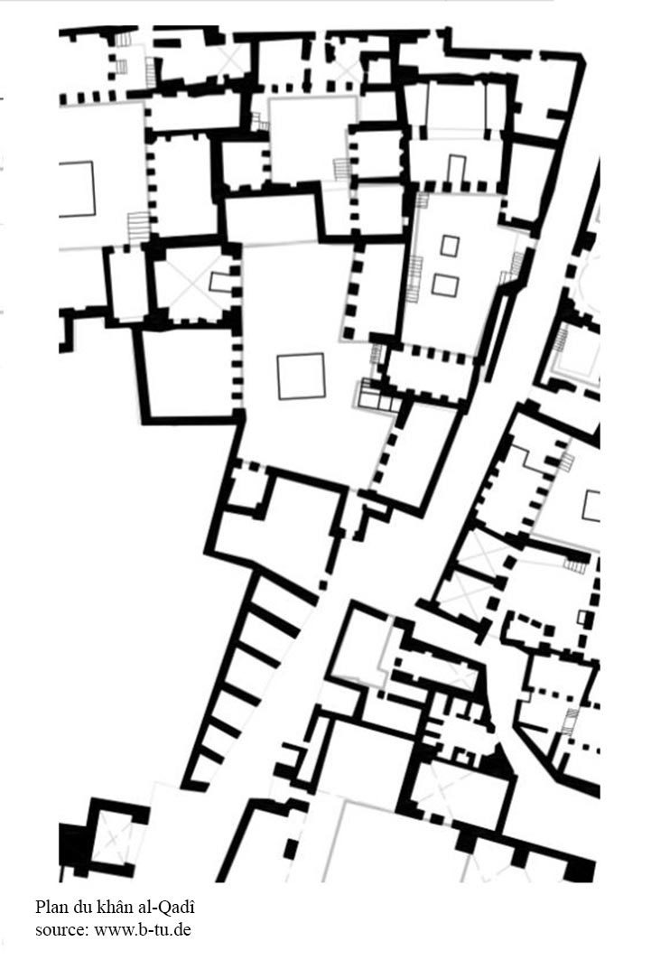 L’édifice est d’abord une madrasa construite, face au bimaristan Arghûn, par Kamâl al-Dîn al-Ma’arrî à proximité de son habitation, la convertion en khân a lieu avant l’année 845/1441, date du décret gravé sur le portail.