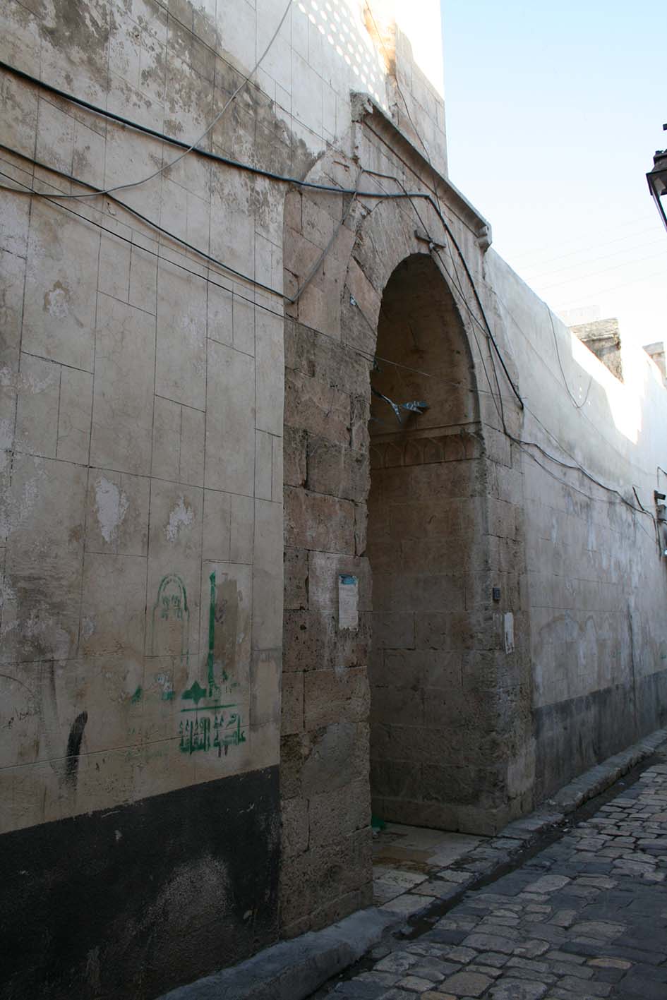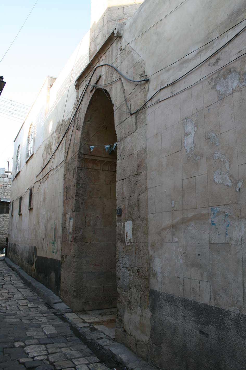 La façade sur rue ne présente aucun décor ; le portail d’accès présente une baie à arc brisé avec une frise à muqarnas, il est couronné d’une corniche et est surmonté d’un petit minaret octogonal avec un balcon soutenu par des muqarnas. Cette association se retrouve aussi à la mosquée Biza, située au nord de Bâb al-Maqâm.