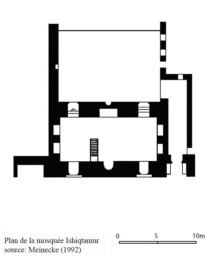 La mosquée du gouverneur Sayf al-Dîn Ishiqtamûr est construite vers 773/1371 lors de son 2e mandat (du 15 dhu’l-hijja 770/21.VII.1369 à 773/1371).[1] Une fontaine le sabîl Ishiqtamûr, jadis située à l’ouest de la mosquée, portait une inscription de fondation datée 771/1369.[2] Elle apparaît donc antérieure à la construction de la mosquée. Le gouverneur a aussi fait construire un khân (avec four, pressoir et magasins)[3], une école (maktab)[4], un hammam[5] et un tombeau[6] à proximité de Bâb al-Maqâm, aujourd’hui il ne reste rien de ces édifices.[7]