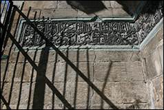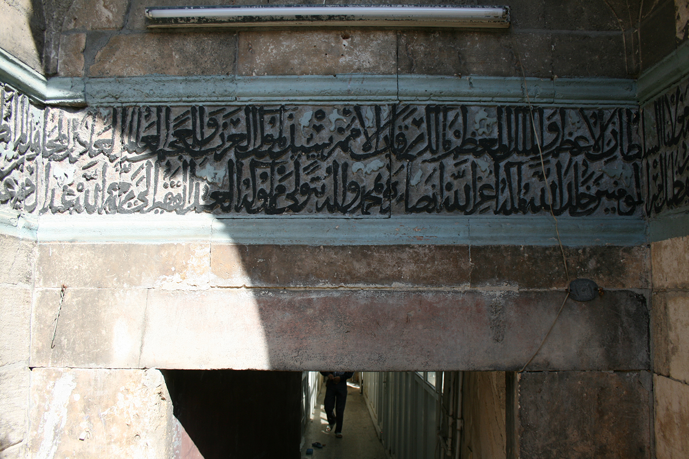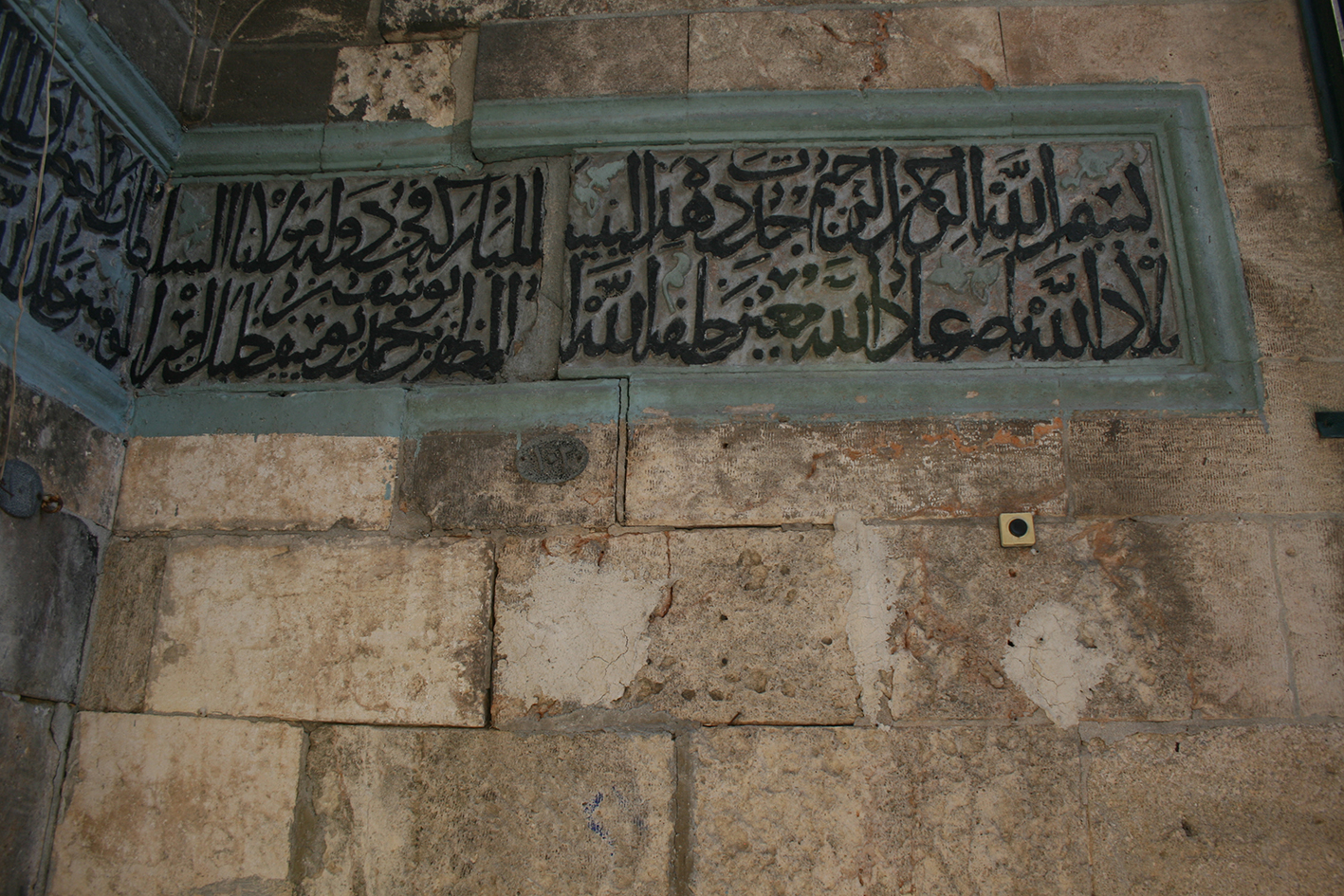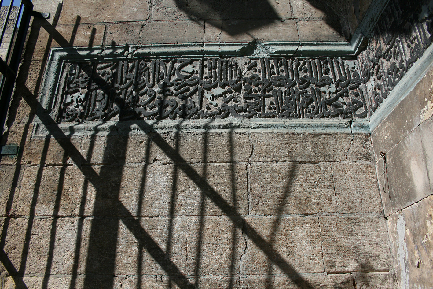 L’inscription de construction, qui s’étend sur les trois côtés de la baie du portail (ill.6-8), indique vraisemblablement la re-consécration d’un édifice existant. Le texte nomme le sultan ayyûbide al-Nâsir Yusuf II (r.634/1237-658/1260) comme régnant, un superviseur des travaux avec un titre détaillé, « 'Abd al-Rahîm ibn al-'Ajamî » et la date 654/1256. D’après ibn al-‘Ajamî, cet édifice antérieur pourrait être le masjîd al-Muhassab[1], dont l'établissement est supposé dès le début de l’Islam ou bien du khanqâh al-Shamsîya.[2] Il n’y a pas d’informations probantes sur cette mosquée jusqu’à sa restauration en 654/1256.