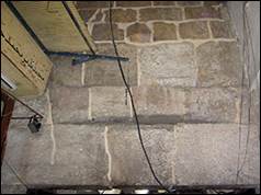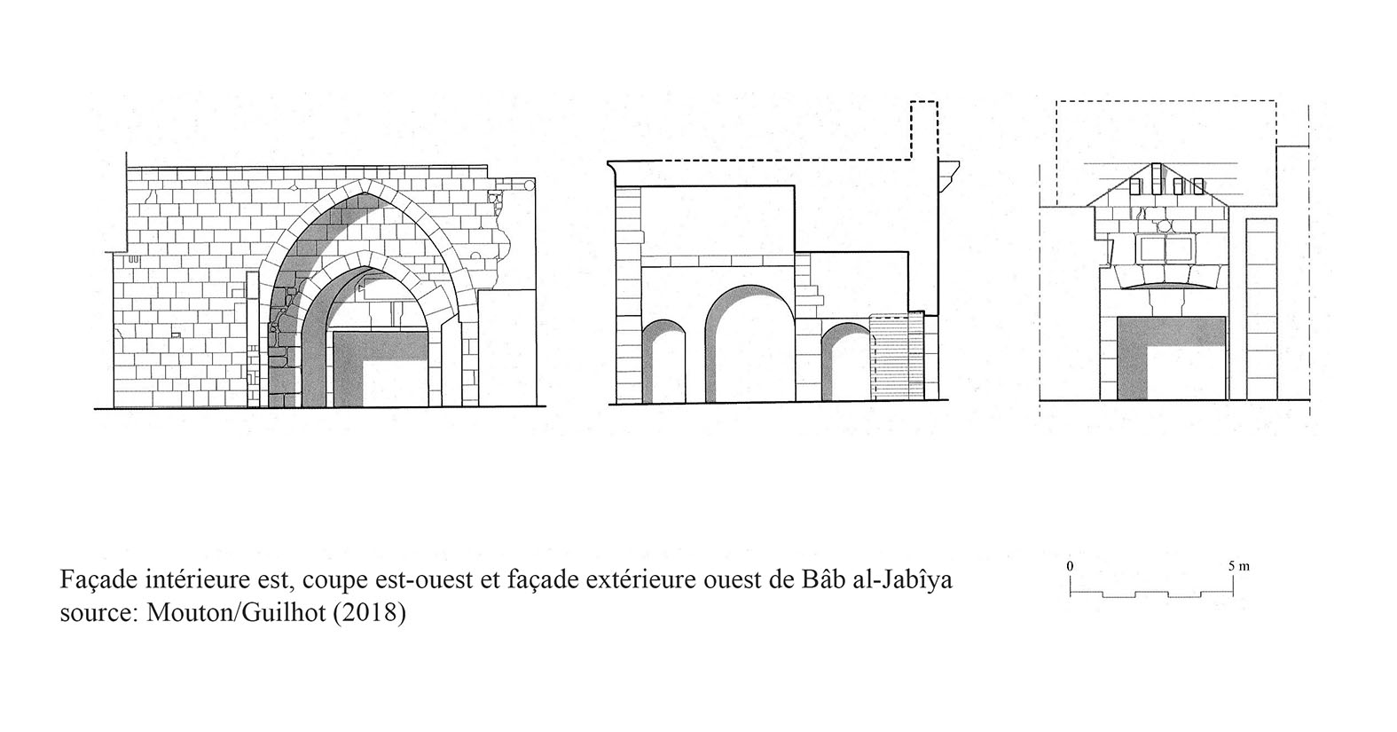 Elle a été reconstruite par Nûr al-Dîn (r.541/1146-569/1174) en 560/1164[1] qui l’a équipée avec une barbacane (bashura), et a de nouveau été réparée comme l’atteste une inscription, sur le côté extra-muros du Bâb al-Jabîya au-dessus de l’arc de décharge, qui nomme Saladin et la date de safar 589/16-25.II.1193 (ill.4). Elle indiquait probablement une restauration de la porte ; les bretêches au-dessus du portail peuvent provenir de cette phase de travaux.