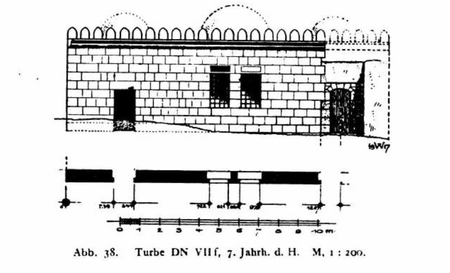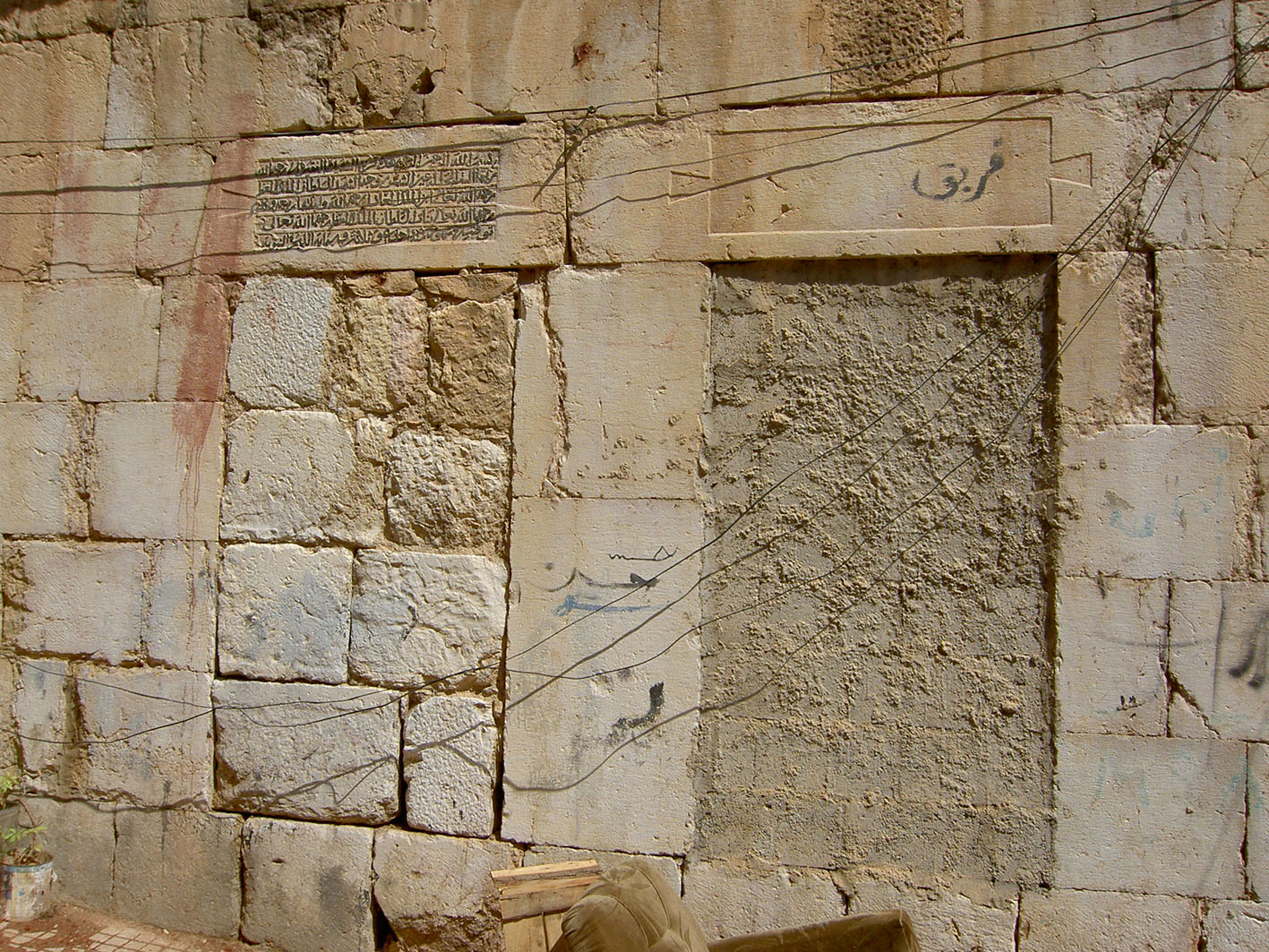 Seule une partie de la façade avec la tombe à l’arrière est conservée (ill.2, 3). D’après l’inscription sur le linteau de la double ouverture nord (ill.5), l’épouse du sultan d’al-Mu’azzam ‘Isa (r.615/1218-624/1227) ‘Ain al-Shams (m.631/1233) est inhumée ici avec ses filles Rabi’a et Kulthûm.