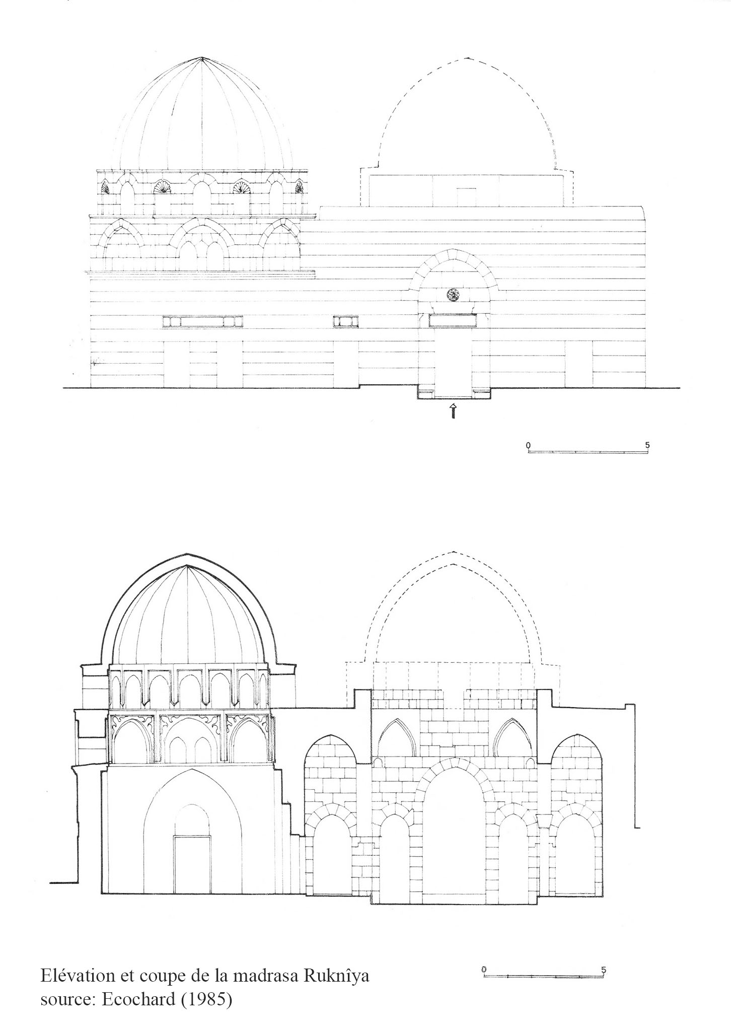 La madrasa se caractérise par une cour surmontée d’une coupole (ill.1) et encadrée par trois portiques (riwaq) avec une salle de prière au sud. Le mausolée adjacent, typiquement damascain, présente une zone de transition exécutée en pierres de taille (elles sont habituellement en briques, ill.5), tout comme le tombeau du turba Takritîya (699/1299) à al-Salihîye.