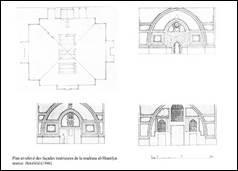Certaines parties de l’édifice, qui devaient se trouver autour de la cour, ont aujourd’hui disparus ; il reste une salle de prière jouxtant la chambre funéraire à l’est et un portique (riwaq) plus tardif (ill.3), il qui relie ces deux éléments.