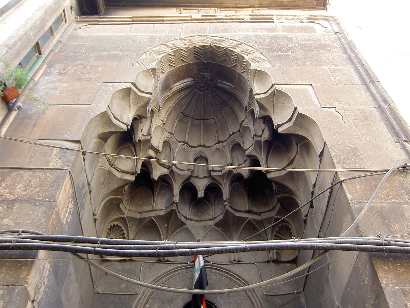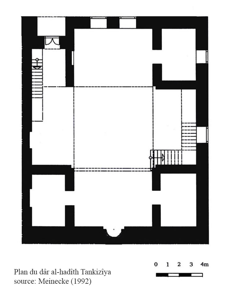 La madrasa du gouverneur Sayf al-Dîn Tankiz (en fonction de 712/1312 à fin 741/juin 1340)[1], est construite entre 728/1327 et 739/1338-1339 à l’emplacement d’un ancien bain connu sous le nom de hammam al-Suwayd, puis organisée en Dâr al-Hadîth et Dâr al-Qur’an. L’inscription de fondation du portail mentionne Aidamur al-Mu’înî comme surveillant des travaux (ill.6). Ce portail présente des similitudes avec le portail du tombeau Ji’anîya (740/1340) construit dans le Midan.
