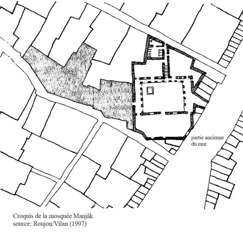 La mosquée est construite en 769/1368 par le gouverneur Saif al-Dîn Manjak al-Yûsufî (en fonction de jumada I 769/février 1368 à ramadan 775/février-mars 1374)[1] en bordure de la route du hajj.
