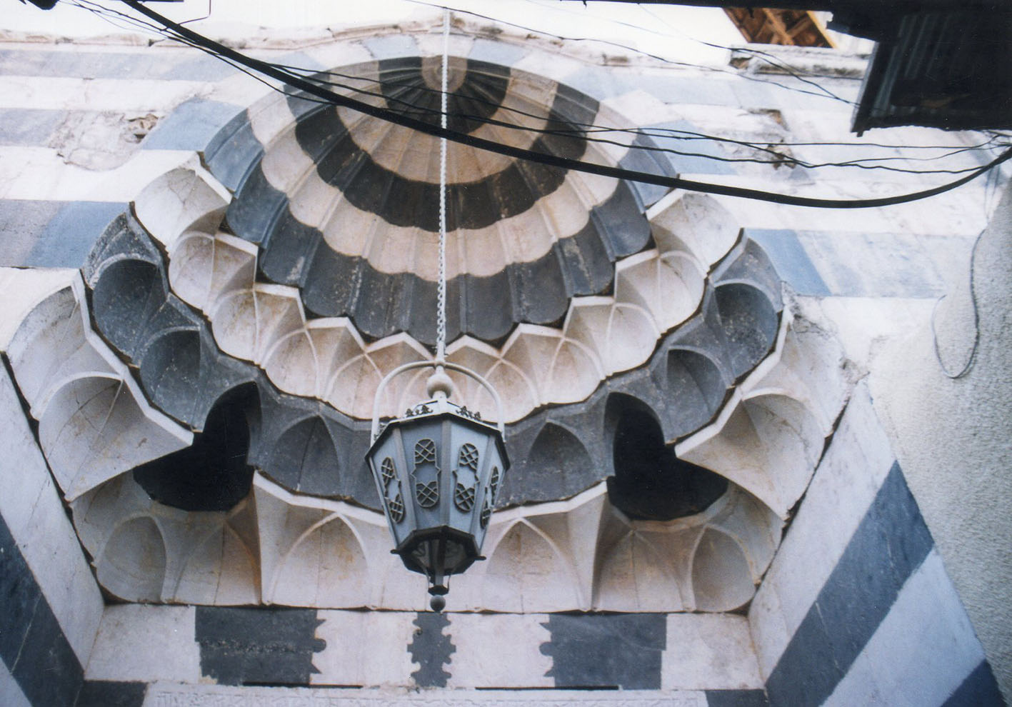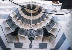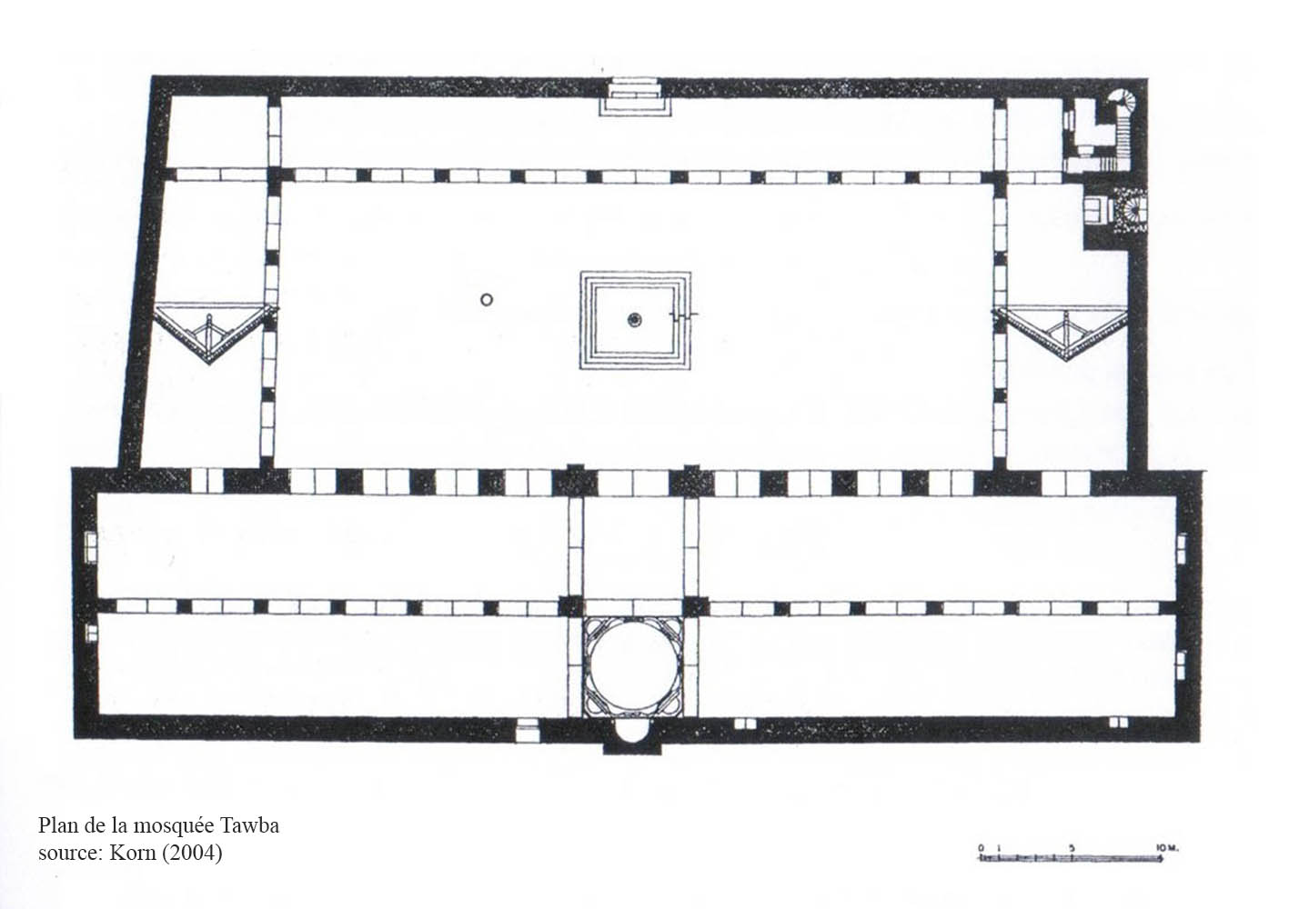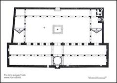 Le type de construction représente une image réduite de la mosquée des Omeyyades (ill.1) ; la salle de prière est réduite à deux travées de treize baies, le changement de supports dans les arcades de la cour au profit de piliers octogonaux uniformes a été abandonné. L’angle nord-est est occupé par le minaret (ill.2) ; au sud, le portail avec ses trois rangées de muqarnas et sa conque cannelée (ill.3, 4).