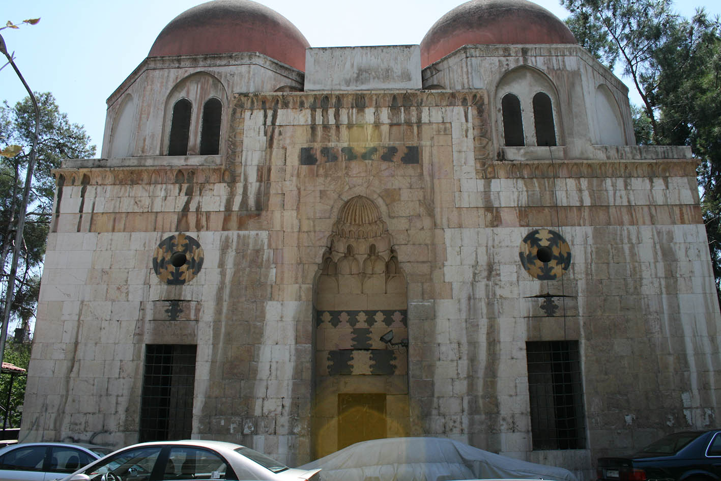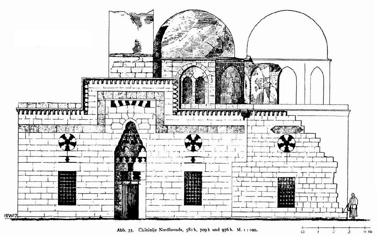 L’édifice consiste en deux salles reliées entre elles par un corridor et présente une façade richement ornée (ill.4, 6, 10) avec un portail à muqarnas (ill.6-9). C’est le modèle type du tombeau double à Damas (ill.1) que l’on retrouve au tombeau Kaukaba’îya (730/1330), à la madrasa Rashidîya (768/1367) et au tombeau Taynabîya (797/1394).