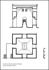 Sa forme carrée surmontée d’une voûte croisée, l’écarte du modèle habituel du mausolée à coupole (ill.1). Le linteau de l’ouverture ouest reçoit une tabula ansata avec une inscription de construction, encadrée de rosaces et d'un contour tressé (ill.5). Les inscriptions sur les façades ouest et sud et sur le cénotaphe portent la date de construction 621/1224 ainsi que les noms, titres et événements de la biographie du défunt.
