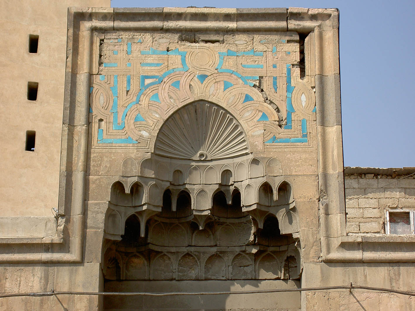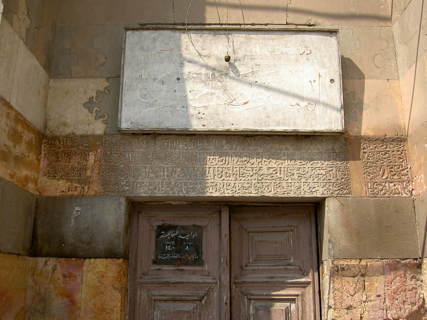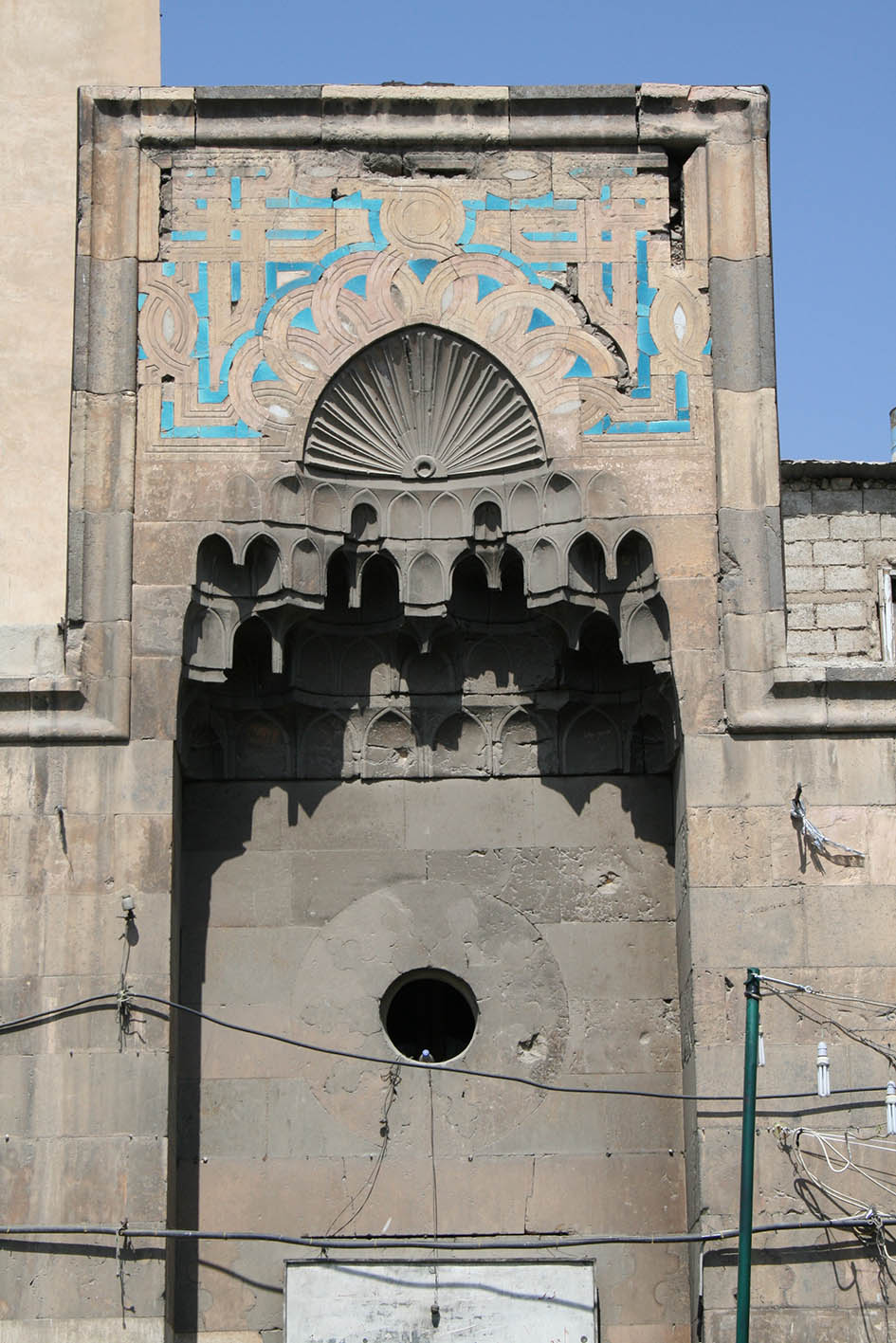 La façade en ablaq est surmontée d’une corniche à gorges (ill.2, 5) et présente un biseau à muqarnas à ses extrémités (ill.3-5) ; le portail d’accès à muqarnas (ill.7, 9) porte une inscription qui mentionne une dotation en faveur de l’édifice (ill.6), ce portail présente un panneau géométrique couleur lapis-lazuli dépassant largement la hauteur de la façade (ill.2, 7, 8)[1], il est flanqué d’une ouverture de chaque côté (ill.5) qui sont surmontées d’un médaillon circulaire géométrique (ill.10).