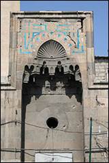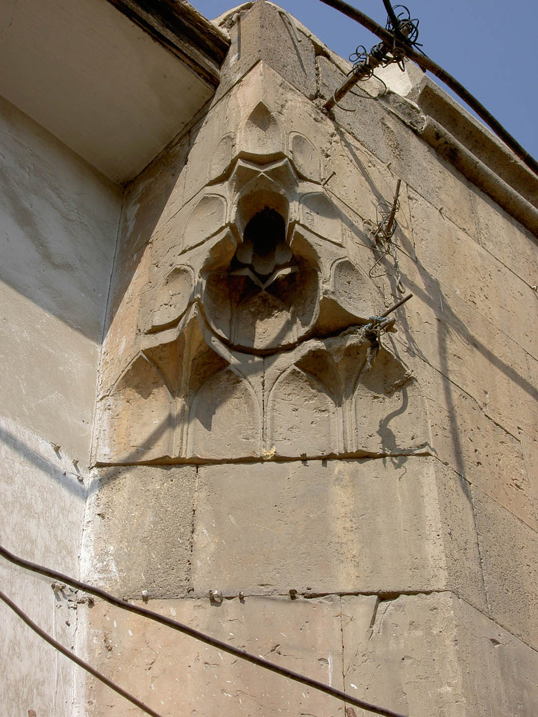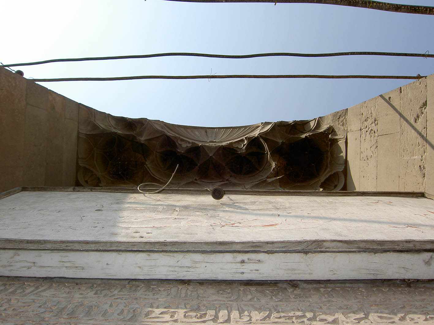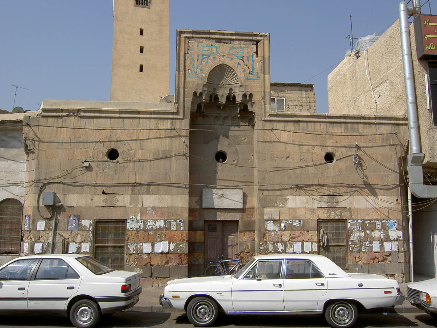 La façade en ablaq est surmontée d’une corniche à gorges (ill.2, 5) et présente un biseau à muqarnas à ses extrémités (ill.3-5) ; le portail d’accès à muqarnas (ill.7, 9) porte une inscription qui mentionne une dotation en faveur de l’édifice (ill.6), ce portail présente un panneau géométrique couleur lapis-lazuli dépassant largement la hauteur de la façade (ill.2, 7, 8)[1], il est flanqué d’une ouverture de chaque côté (ill.5) qui sont surmontées d’un médaillon circulaire géométrique (ill.10).