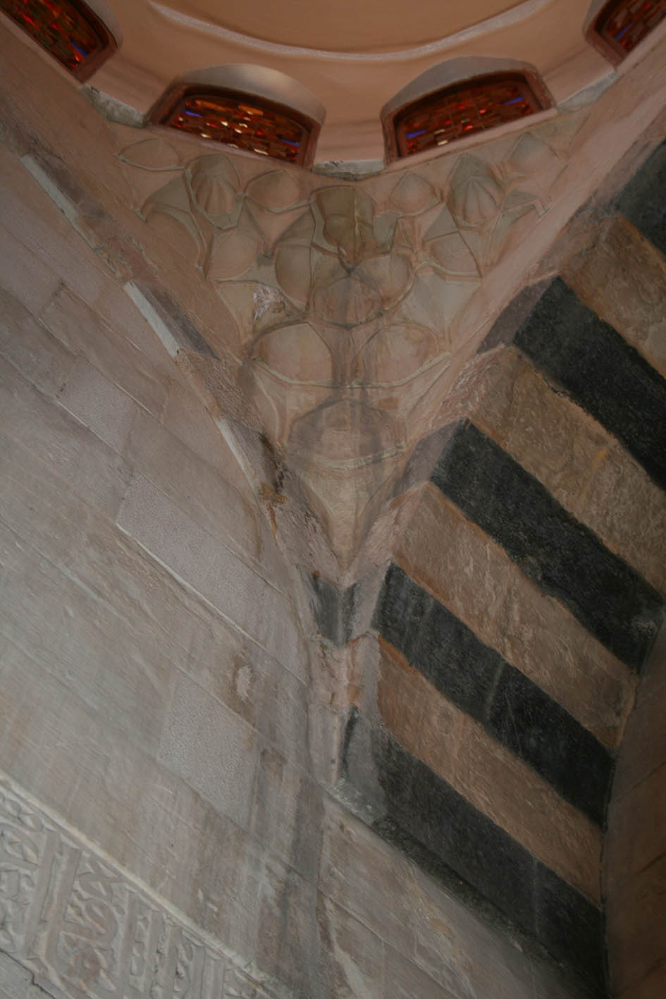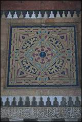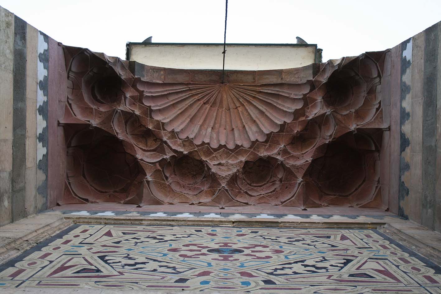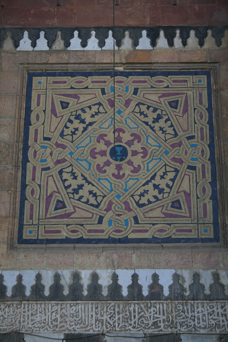 Le tombeau présente une façade en ablaq, restaurée, équipée un riche décor de frises et de médaillons circulaires polychromes (ill.4-6) ; un portail à muqarnas reçoit un panneau géométrique polychrome (ill.7, 8) et un long bandeau inscrit courant sur toute la façade et dans la baie du portail, il contient des verstes du Coran, les titres du gouverneur et son blason (ill.4, 5, 11).