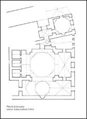 plan en iwan avec cour couverte, salle de prière au sud et le tombeau du