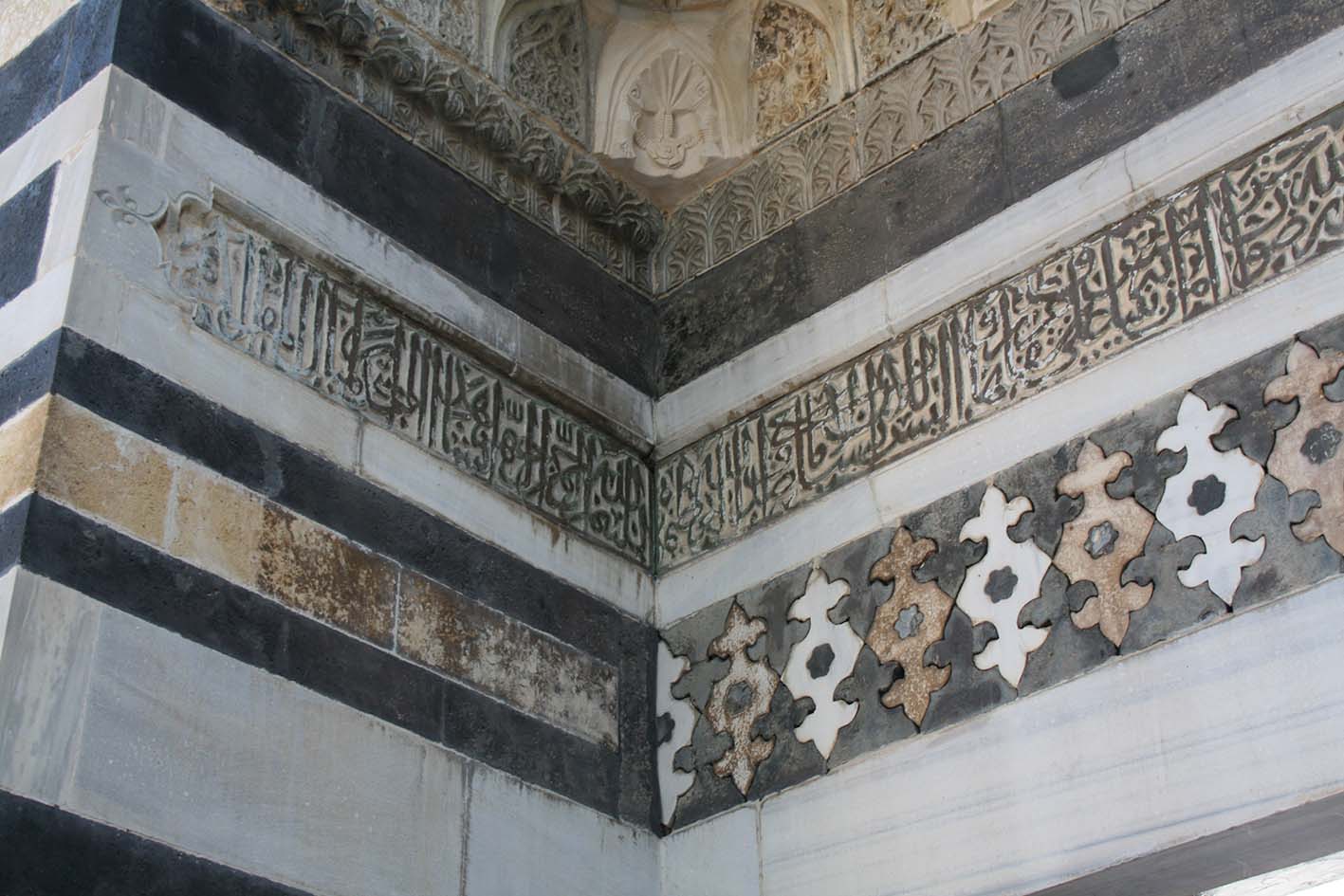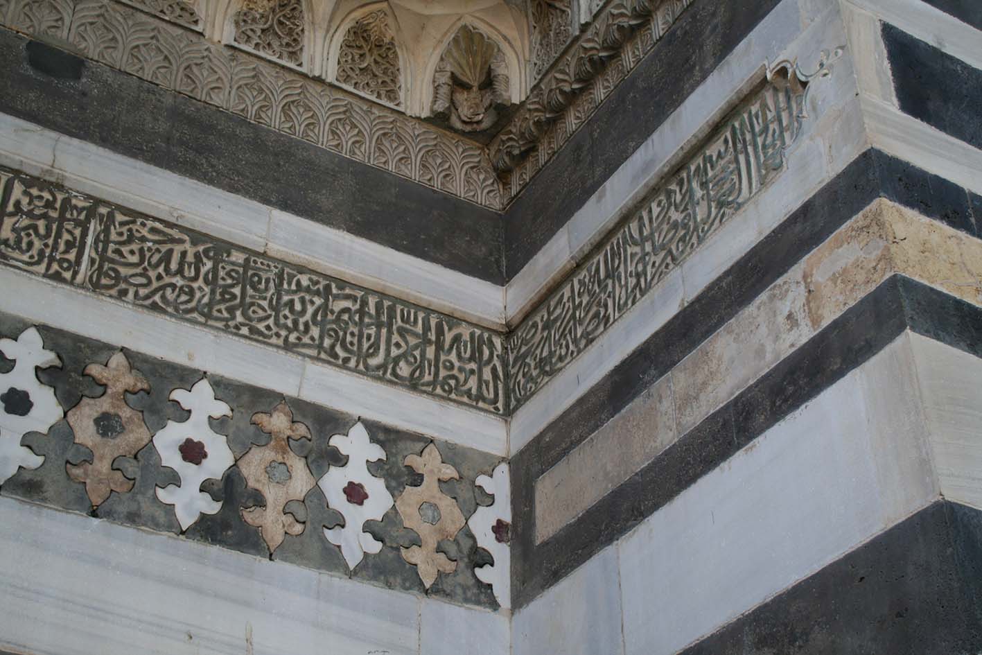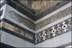 Le deux inscriptions sur les portails est et ouest ainsi que les épitaphes sur les trois sarcophages du tombeau[2] permettent de dater l’ensemble. L’originalité de la mosquée est de présenter trois décors architecturaux distincts :
