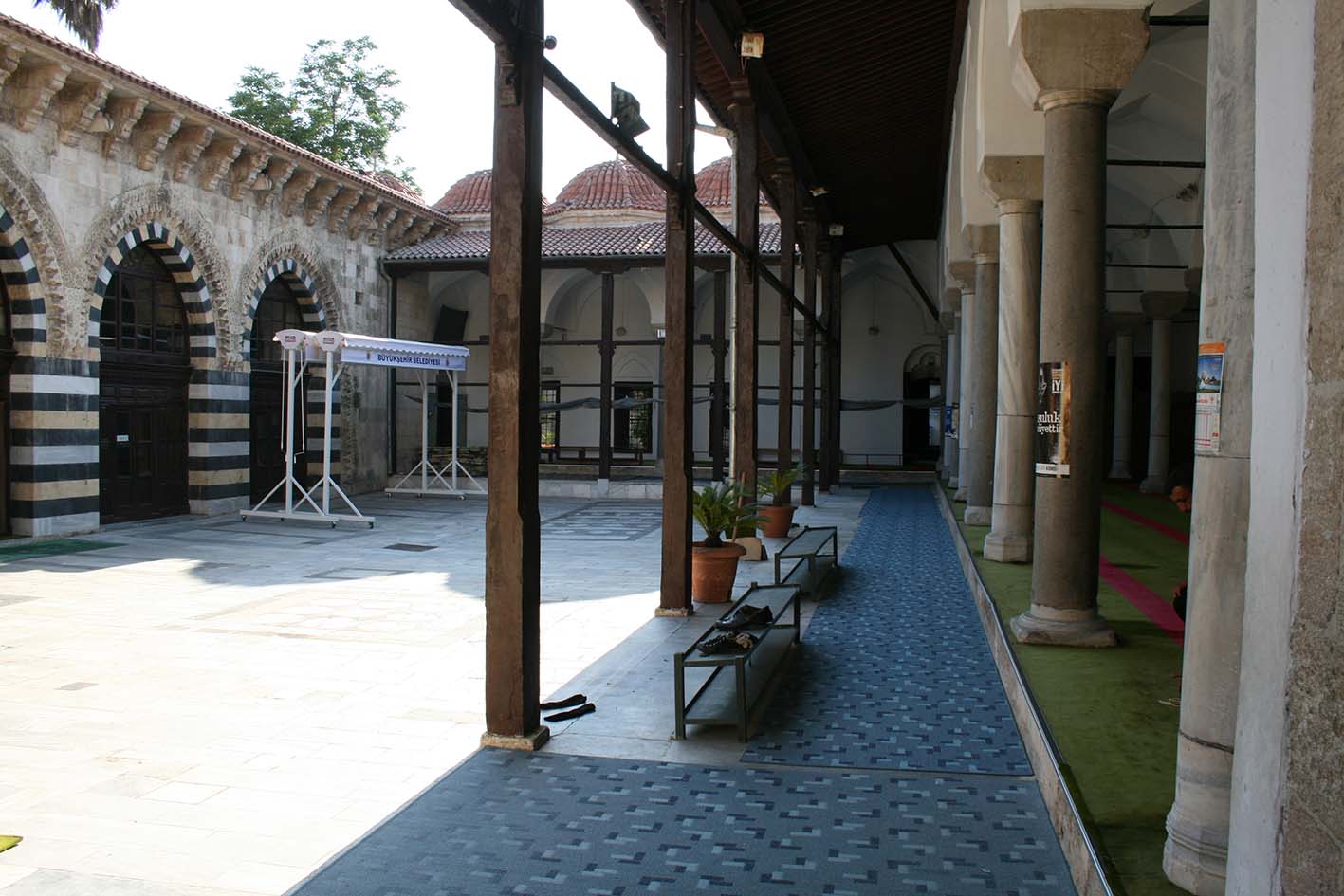 « Chemin faisant, nous passons devant la plus belle mosquée d’Adana, Oulou-Djami, construite par Rhamadan Oglou. Cette mosquée, vraiment élégante, se compose de deux bâtiments, l’un pour l’été, l’autre pour l’hiver. Le premier n’est autre chose qu’une grande galerie couverte, et dont les arcades sont enguirlandées de vignes, tandis que les parois intérieures sont revêtues de superbes faïences de Koutayèh. La mosquée d’hiver est non moins richement ornée de faïences, les plus belles que j’aie vues en Asie Mineure. Elle possède un minaret élevé et une grande porte en assises de marbre noir et blanc alternées d’un très bel effet. »