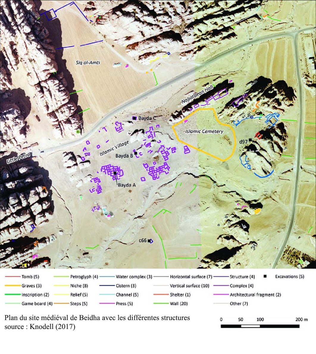 Ces programmes confirment une occupation médiévale du site identifiée comme un village constitué de deux zones densément bâties ou d’abris creusés dans la roche (ill.1-3). Ce village est situé près de la ressource en eau du Jabal al-Sharâh et offre un site propice à l’agriculture. Depuis 2014, le projet Islamic Beidha Project est chargé d’étudier ce village médiéval (ill.3, 7, 8, 10, 12-14).