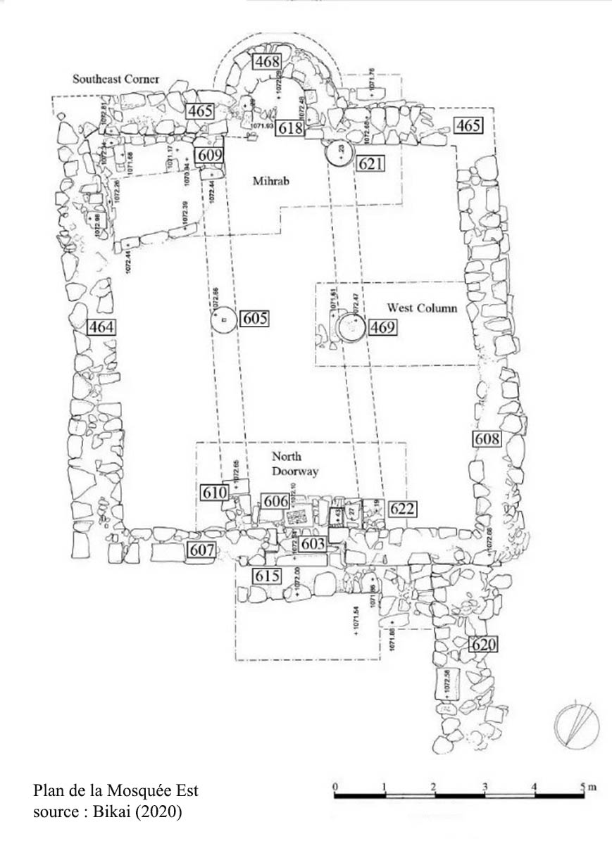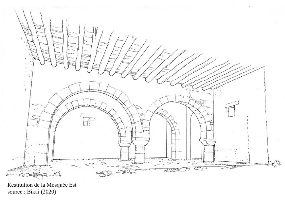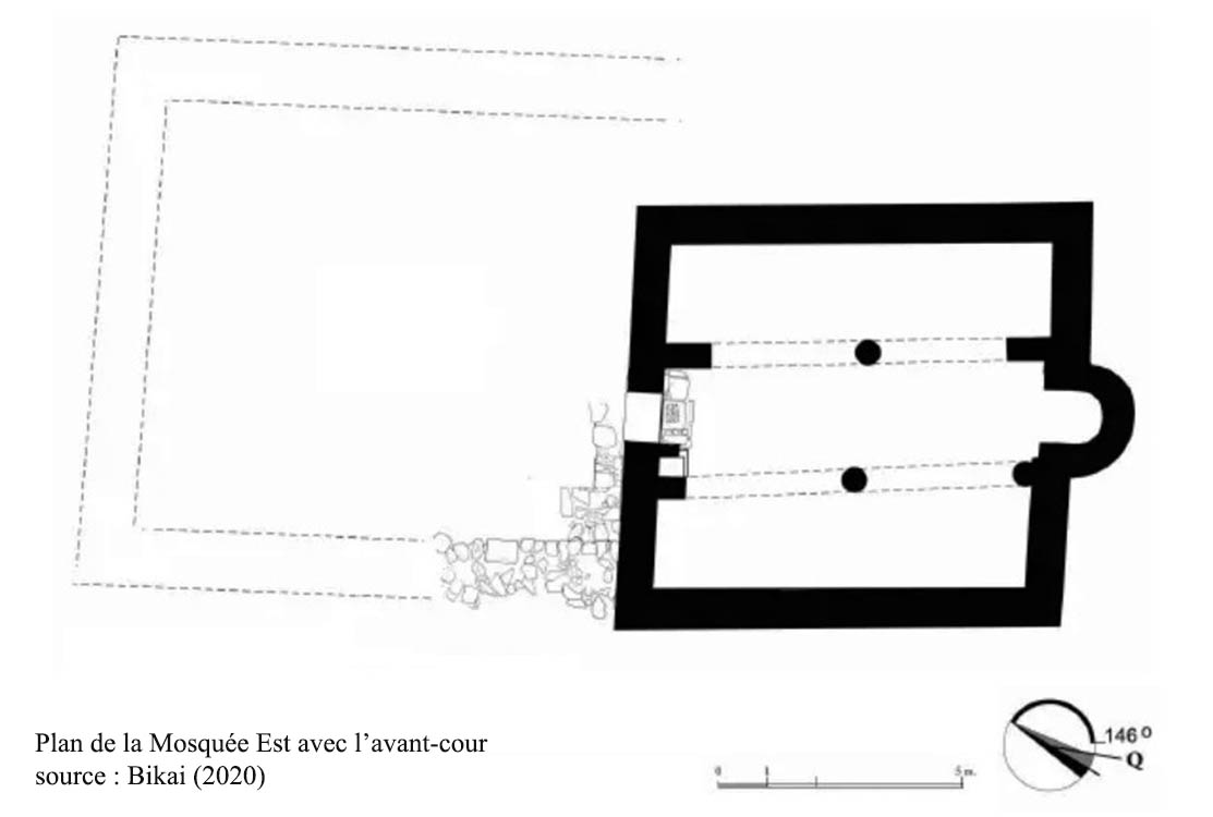 En 2005, les premiers sondages confirment la présence d’une mosquée qui est entièrement excavée en 2018. Cette petite mosquée dite Mosquée Est ou Mosquée 1 mesure environ 9x9m ; elle comprend une salle de prière (7,5x7,5m) avec deux arches intérieures orientées nord-sud[10] reposant sur des pilastres et des colonnes au centre, le mihrâb est surélevé de 20cm par rapport au sol de la salle de prière, les murs ont une épaisseur de 70cm à 1m (ill.22-24). L’accès nord passe par une petite cour entourée d’un muret (11,5x11,5m) avec un banc en pierre extérieur côté nord (ill.23). L’édifice présente des traces de platre peint en rouge et semble reposer sur une structure plus ancienne.[11]