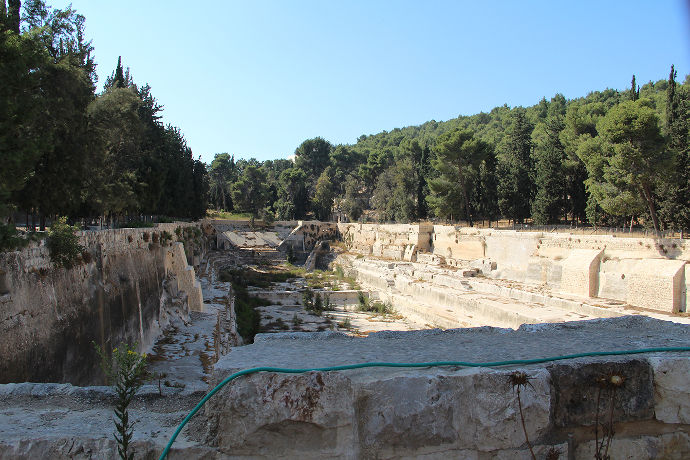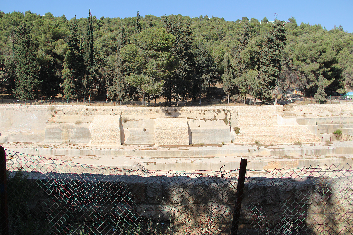 La première, c'est-à-dire la vasque supérieure ou la plus occidentale, mesure cent trente-huit pas de long, sur une largeur de soixante et dix-huit à l'ouest et de quatre-vingt-deux à l'est. En partie creusée dans le roc et en partie construite, elle est soutenue intérieurement par des contre-forts, afin de mieux résister à la poussée des terres. Un seul escalier permet d'y descendre à l'angle sud-est. Le mur, du côté de l'est, a un mètre trente centimètres de large dans sa partie supérieure ; mais il est bien plus épais dans les assises inférieures, que la terre recouvre, et il renferme intérieurement une chambre dans laquelle je n'ai pu pénétrer.
