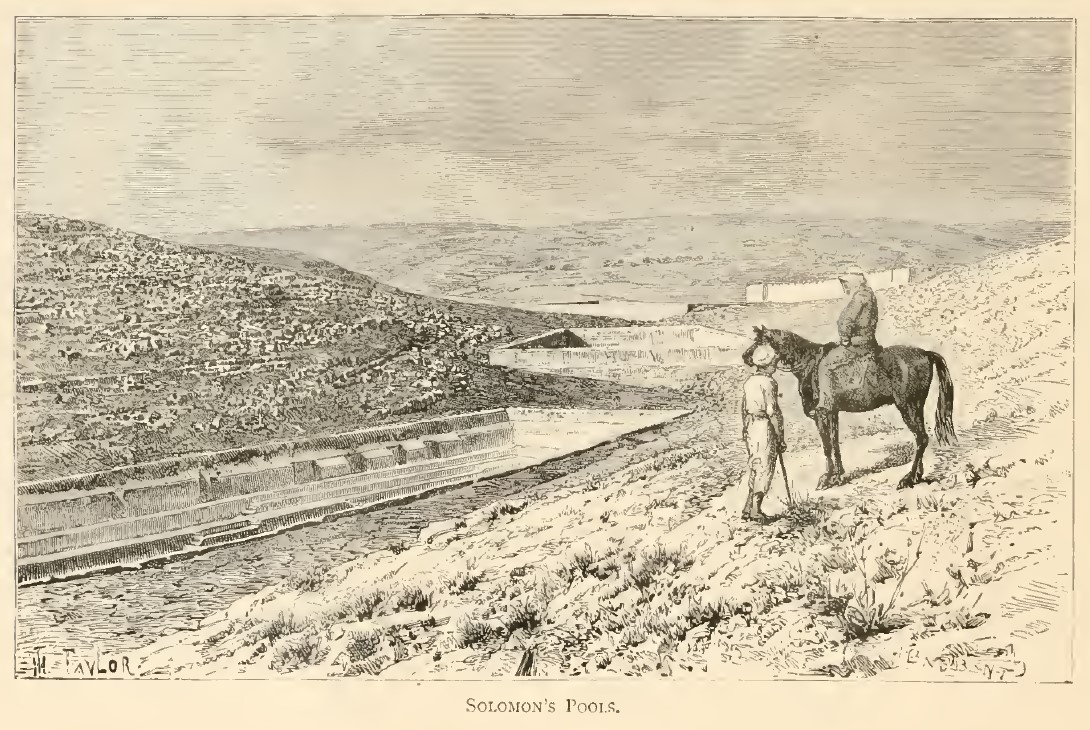 Solomons Pools. - A short ride up the glen from Urtas brings us to a basin-shaped depression in the mountain-range, in the bottom of which lie Solomon's Pools. They are partly excavated in the rocky bed of the vale and partly built of large hewn stones. They are three in number, of great size—each being nearly one hundred and fifty yards long, by half as much in breadth, and about forty feet deep. They are so arranged on the natural slope of the ground that the bottom of the upper pool is higher than the surface of the next, the object evidently being to collect and store the greatest possible quantity of water.