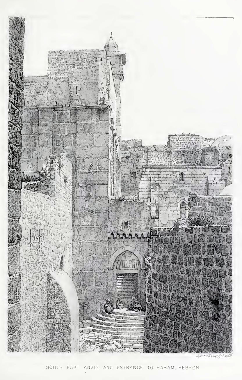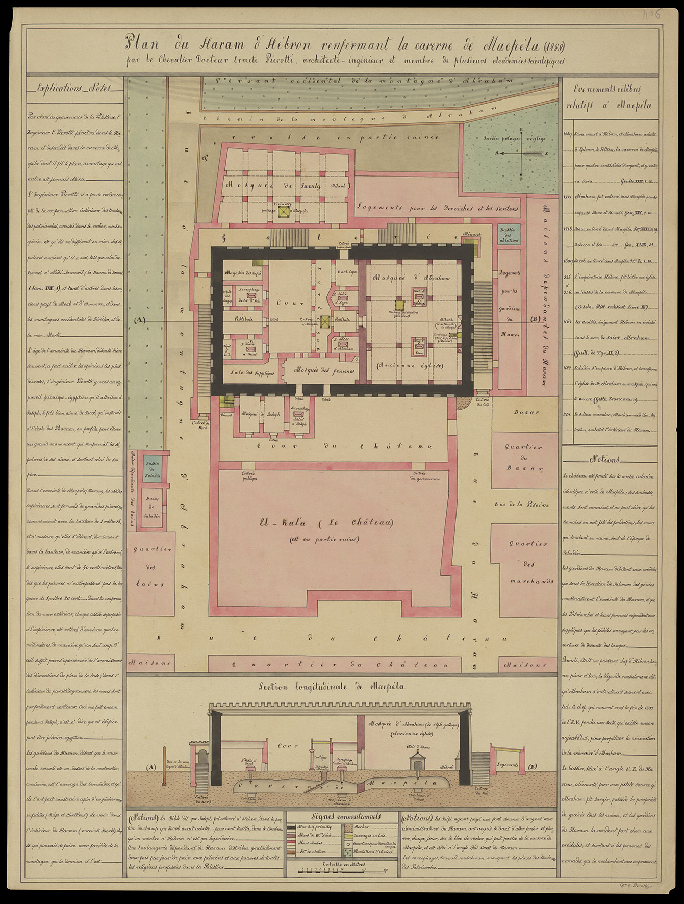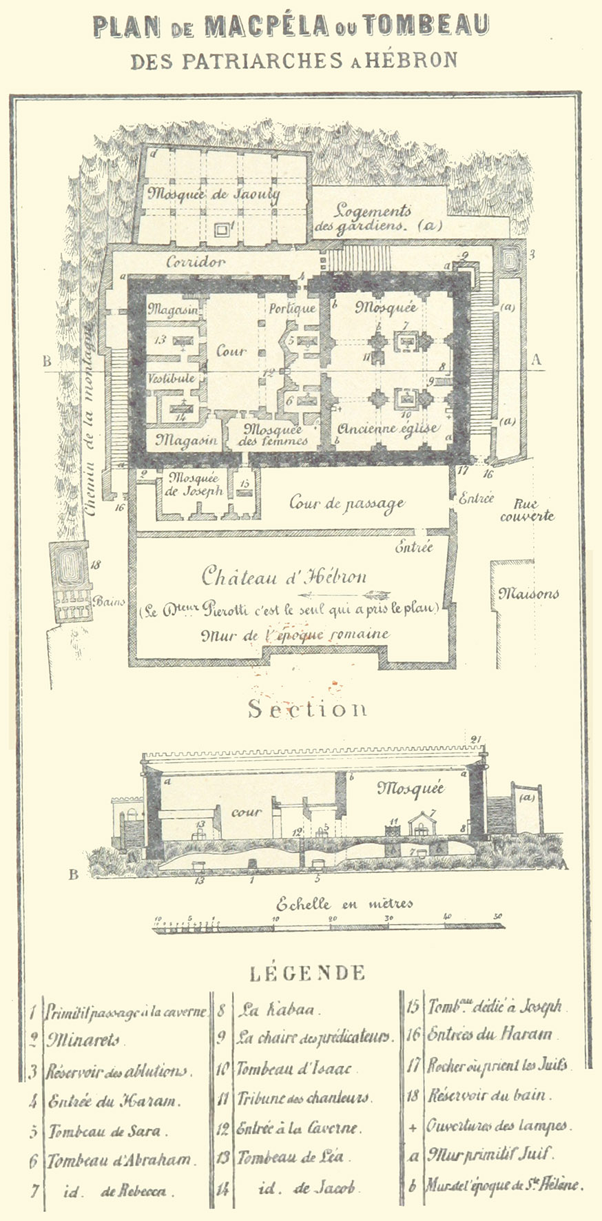 Le château d’Hébron est fondé sur la roche calcaire identique à celle de Macpela ; ses soubassements sont romains et on peut dire avec certitude qu’ils en ont jeté les fondations. Les murs sont actuellement ruinés de tous côtés, cependant ils abritent une petite garnison ; dans peu de temps tout sera ruiné, et ceux qui voudront construire des maisons en prendront les pierres ; la fataliste Sublime Porte ne s’en emeut pas. L’intérieur du château offre un amalgame d’escaliers, d’entrées obscures, de chambres incommodes et mal disposées, voilà pourquoi j’ai trouvé inutile de la reproduire sur mon plan ; tout un est un ouvrage de chagements successifs arabes faits dans les sièvles passés. Bien des voyageurs croient que de la terrasse crevassée ils peuvent satisfaire leur ardente et juste curiosité d’examiner de près l’ancienne enceinte, et de pouvoir même voir quelque chose de l’intérieur ; mais c’est une erreur ; l’observateur est trompé, […].
