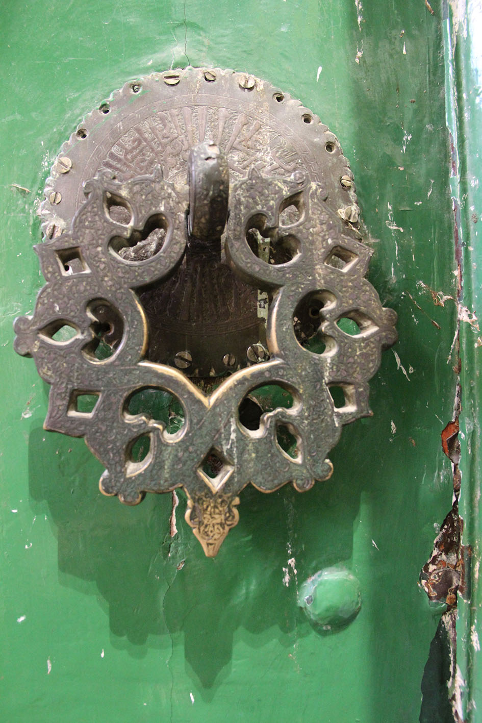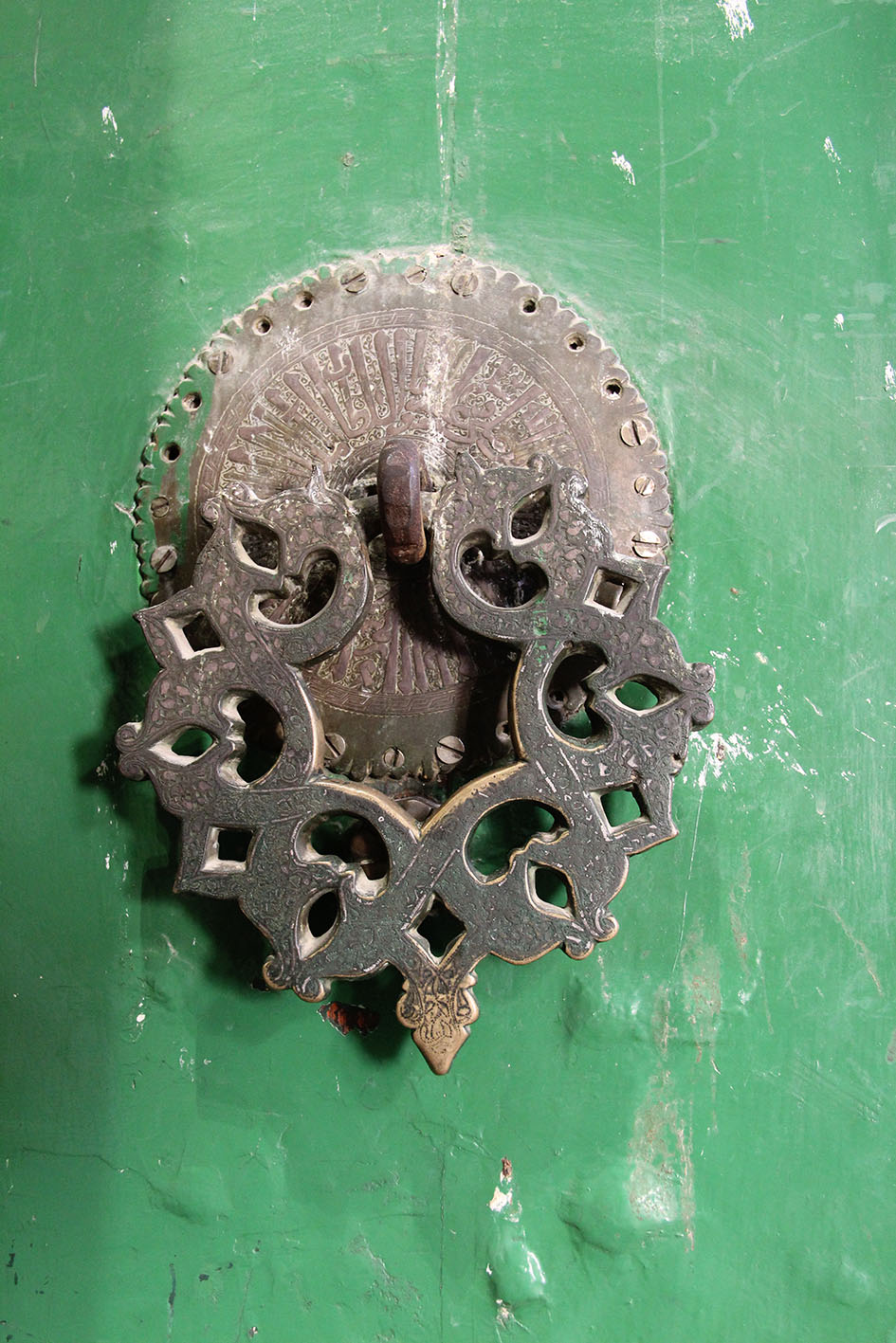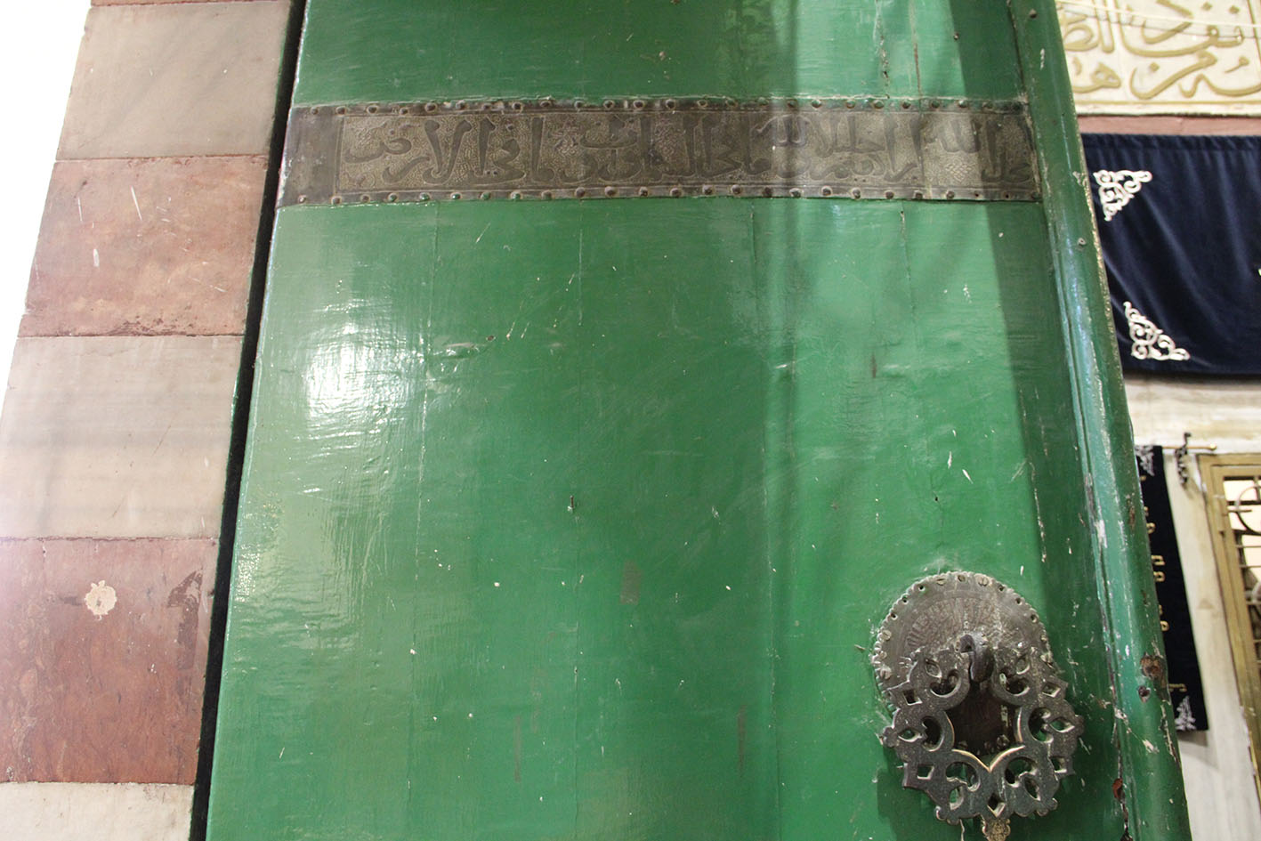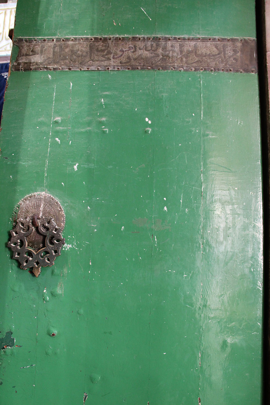 Afin de fournir en eau les visiteurs et pélerins, le sultan al-Mansûr Qala’ûn (r.27 rajab 678/3.XII.1279 – 6 dhu’l-qa’da 689/10.XI.1290) ordonne la construction d’un réservoir, le birket al-Sultan[5], ainsi que la restauration des installations hydrauliques (qui passaient probablement par l’emplacement du futur sabîl al-Tawashî) ; de plus, des annexes de service avec cuisines et boulangeries (simât), moulin, four et entrepôts sont construites sous la supervision de l’intendant des Lieux Saints (nâzir al-haramayn al-sharifayn)[6] Aidughdî al-Ruknî.[7] A l’intérieur, il fait construire les portes armées de bandes de cuivre qui ouvrent sur le vestibule séparant les salles d’Abraham et de Sarah (5 et 5’ sur plan, ill.1). Ces travaux sont avérés et datés 685/1286 par les bandeaux (inscription n°13, ill.14, 16) et les heurtoirs inscrits de la porte (inscription n°14, ill.15, 17), et l’année suivante un placage de marbre est appliqué au sol de la salle d’Abraham, le linteau de la porte d’entrée portant l’inscription datée 686/1287 (inscription n°15) confirmant ses travaux.