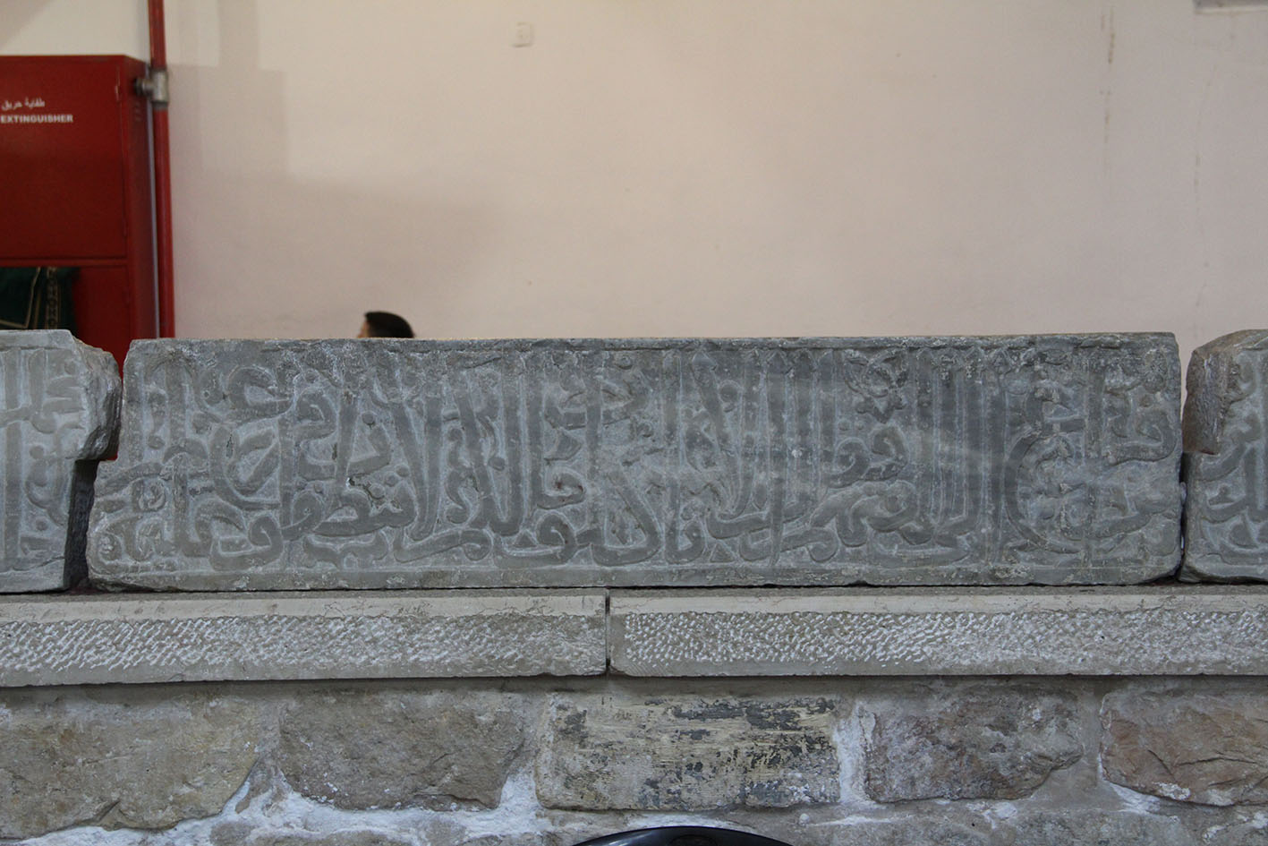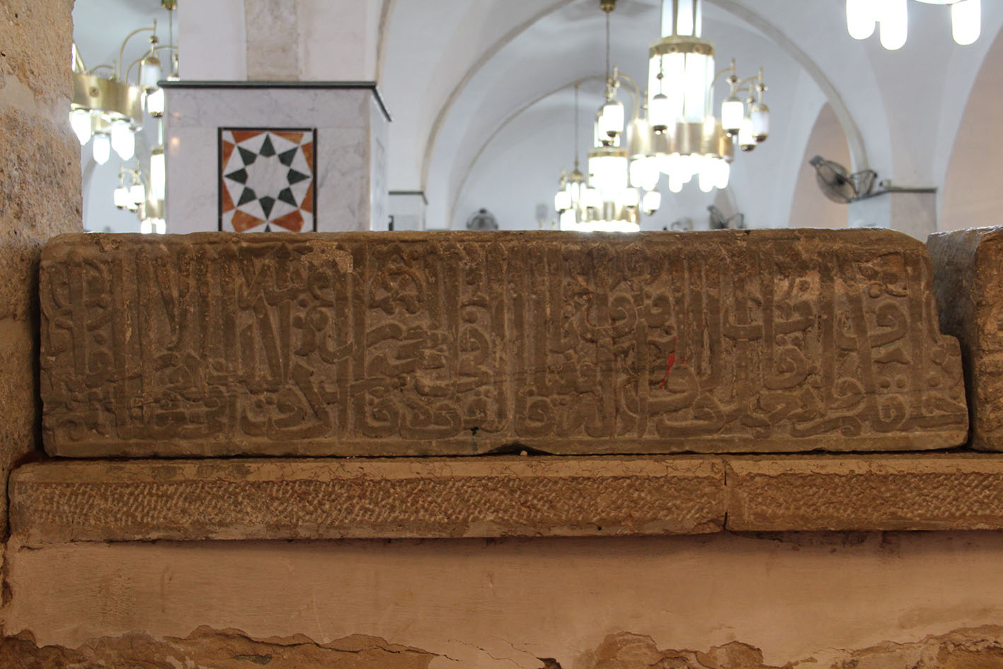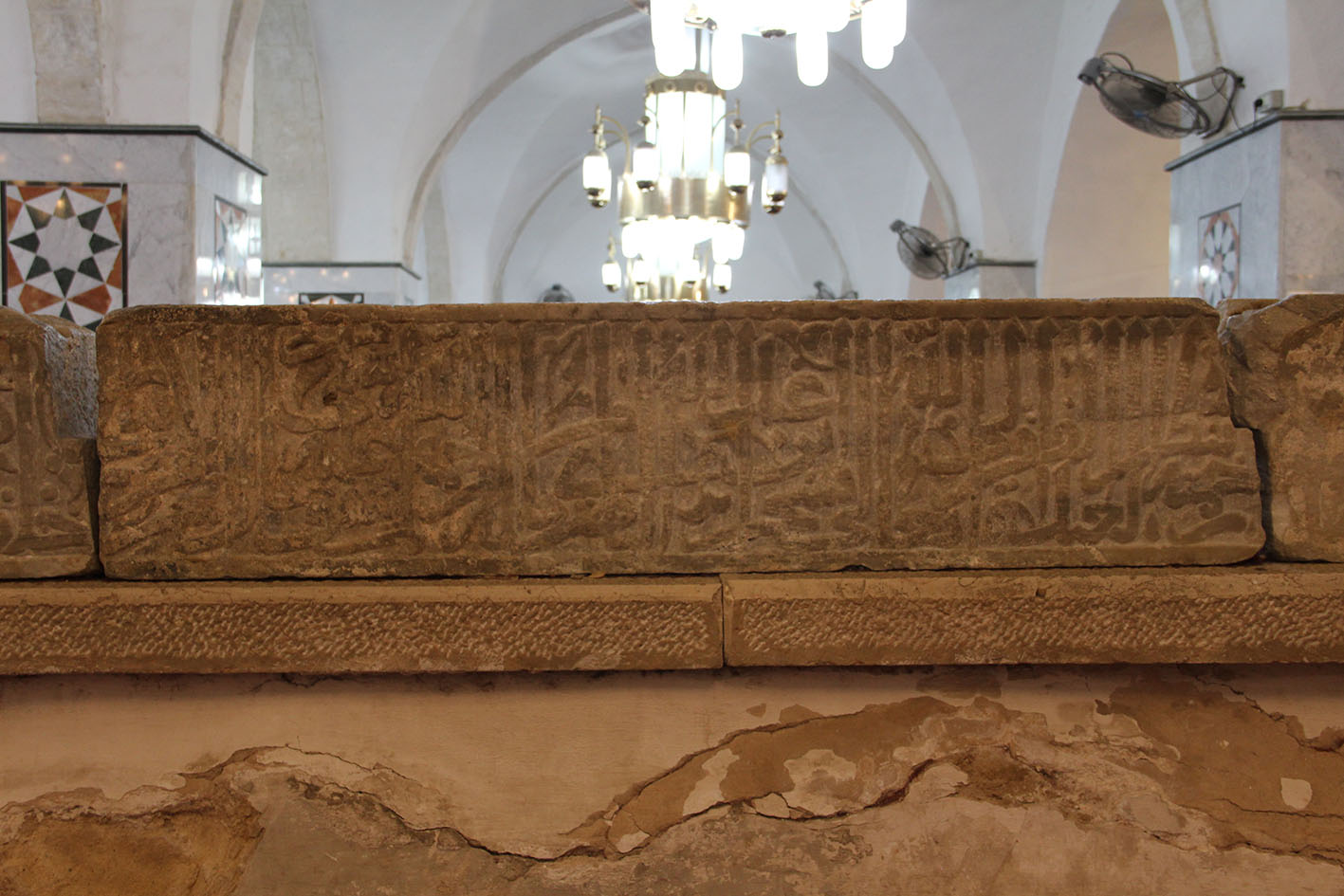 720/1320. Texte de construction, reconstitués d’après 4 fragments (136x33, 113x33, 140x33, 66x33), anciennement sur la porte et les ouvertures du mur ouest face au corridor qui sépare la mosquée du sanctuaire, actuellement exposé sur l’estrade au nord de la salle de prière (inscription n°26, ill.21-27).[12]