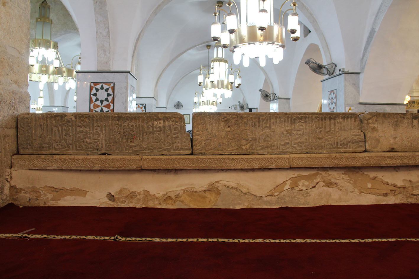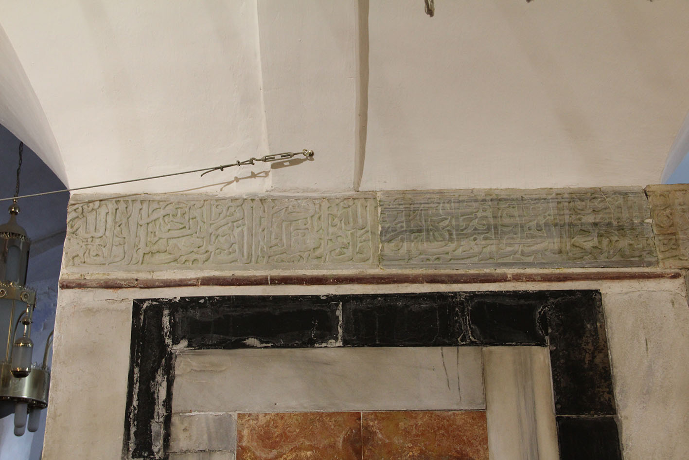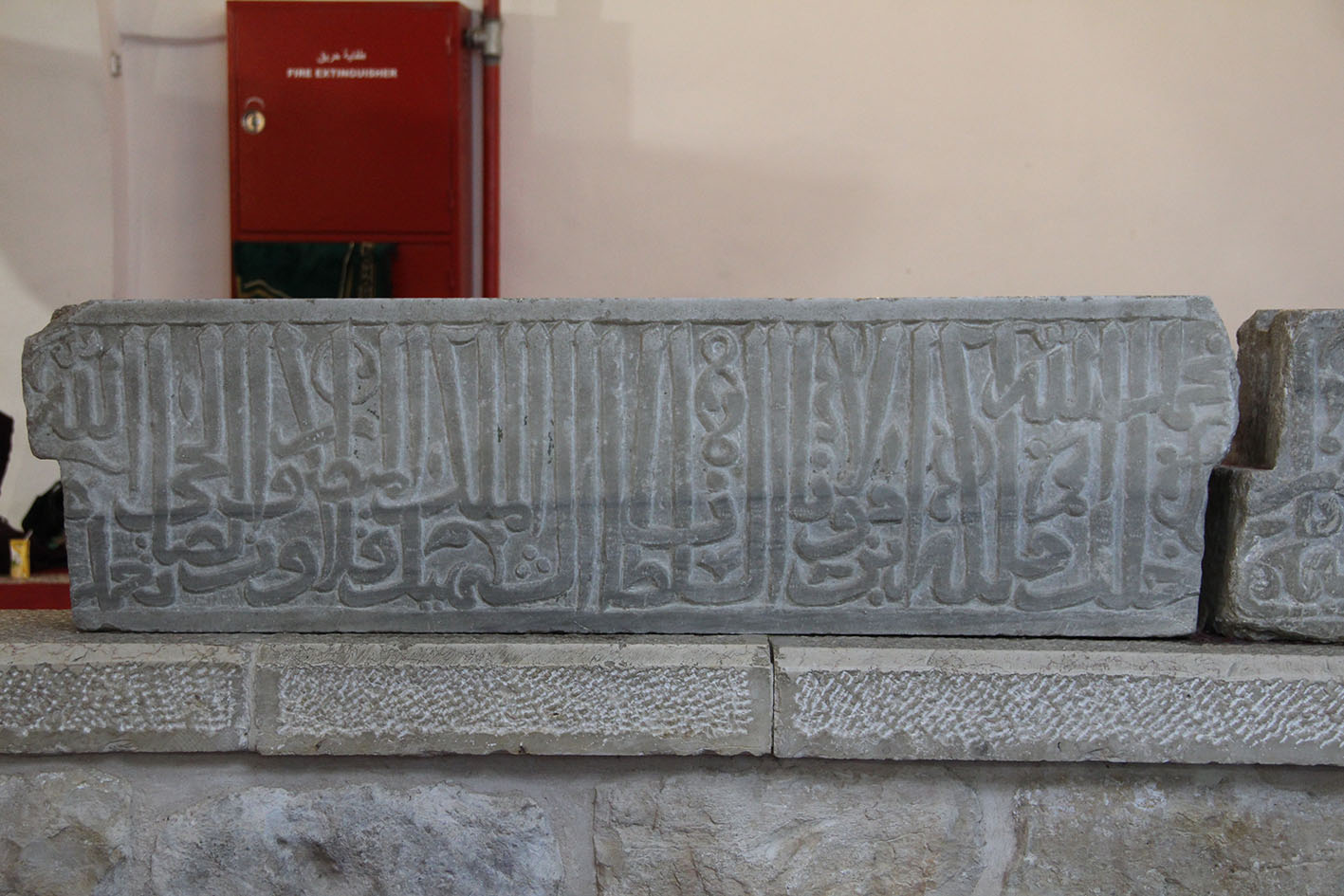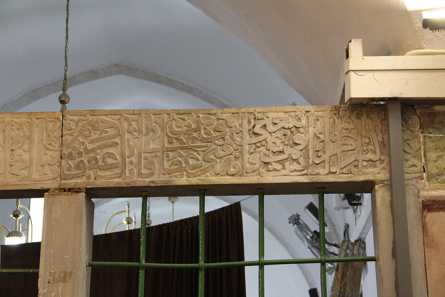 720/1320. Texte de construction, reconstitués d’après 4 fragments (136x33, 113x33, 140x33, 66x33), anciennement sur la porte et les ouvertures du mur ouest face au corridor qui sépare la mosquée du sanctuaire, actuellement exposé sur l’estrade au nord de la salle de prière (inscription n°26, ill.21-27).[12]