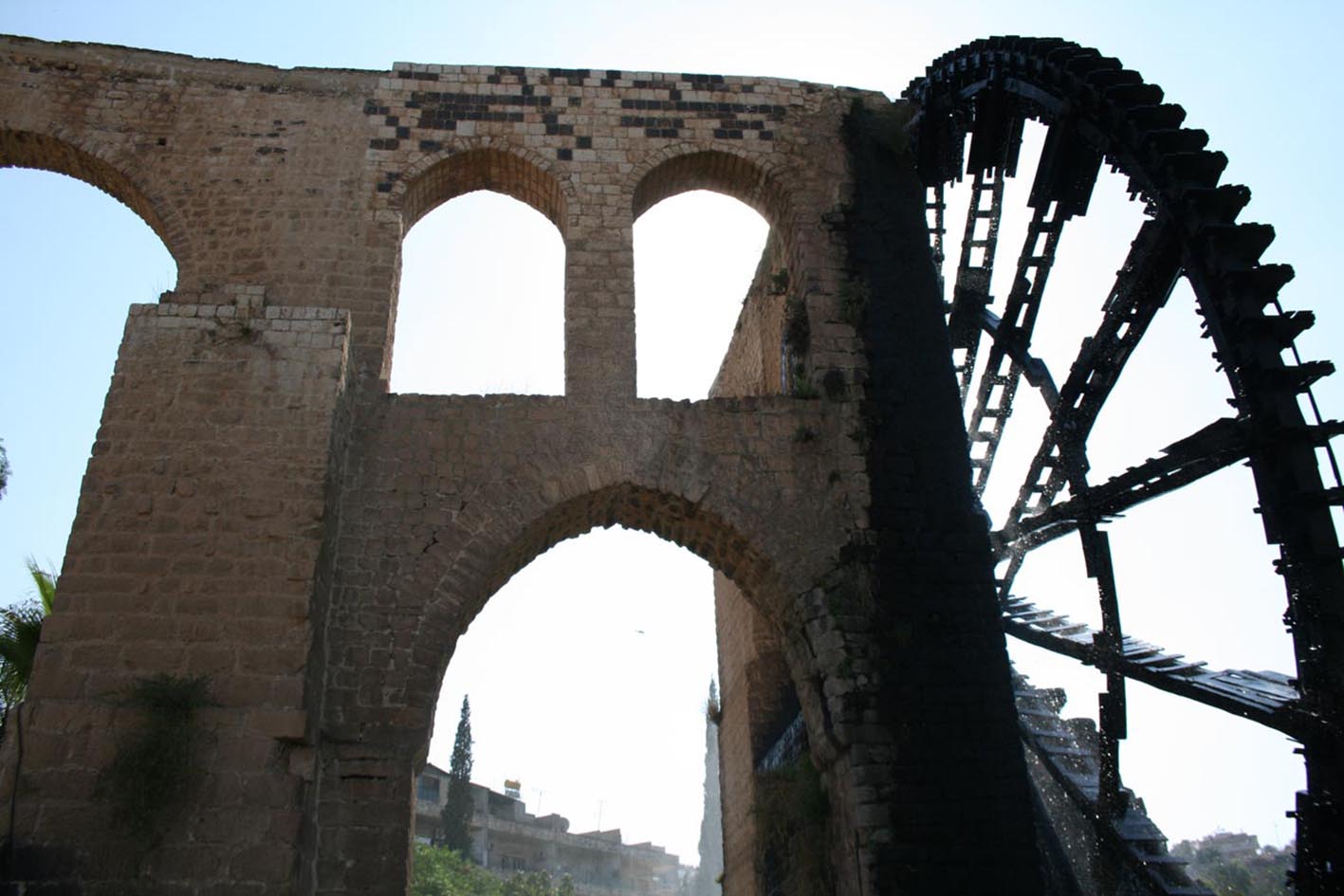 Il reste une importante partie de l’aqueduc qui desservait la Grande Mosquée à quelques 200m de la rive gauche du fleuve (ill.1, 2, 7), c’est aussi la plus grande roue hydraulique de la ville avec plus de 20m de diamètre (ill.3, 4).