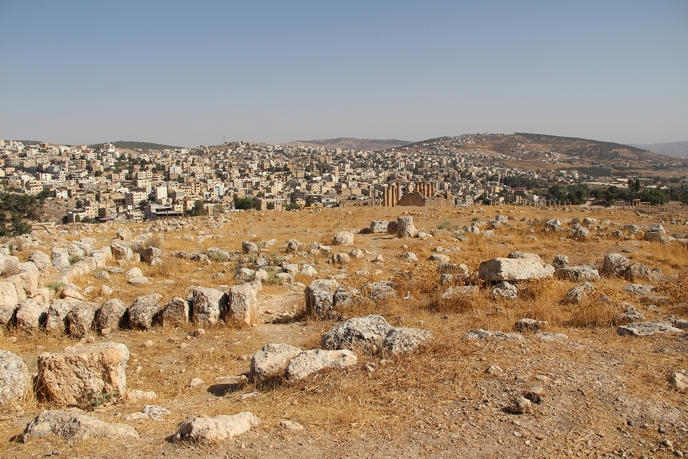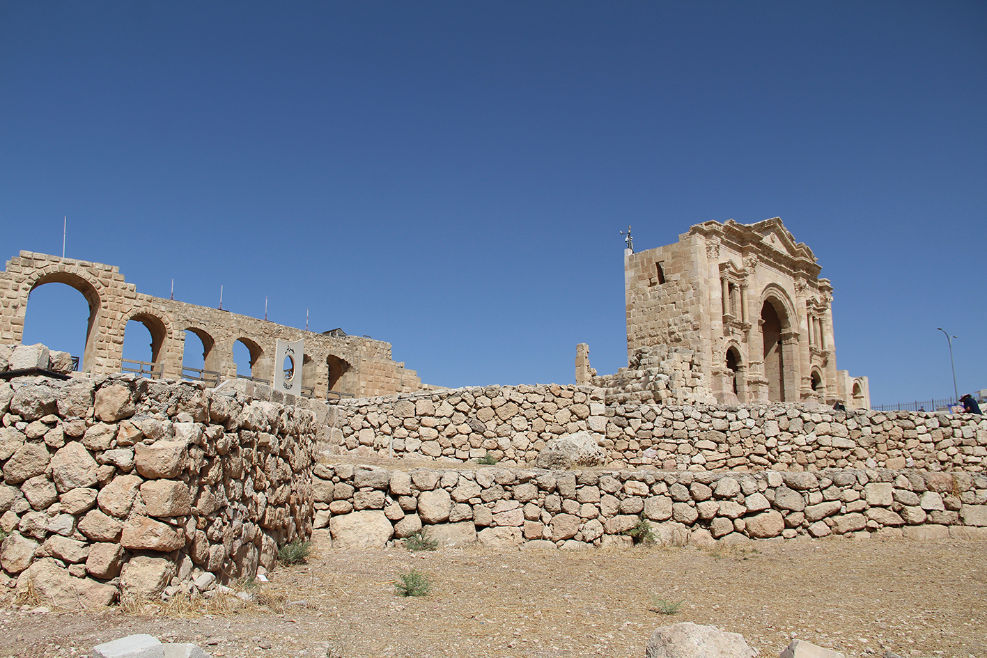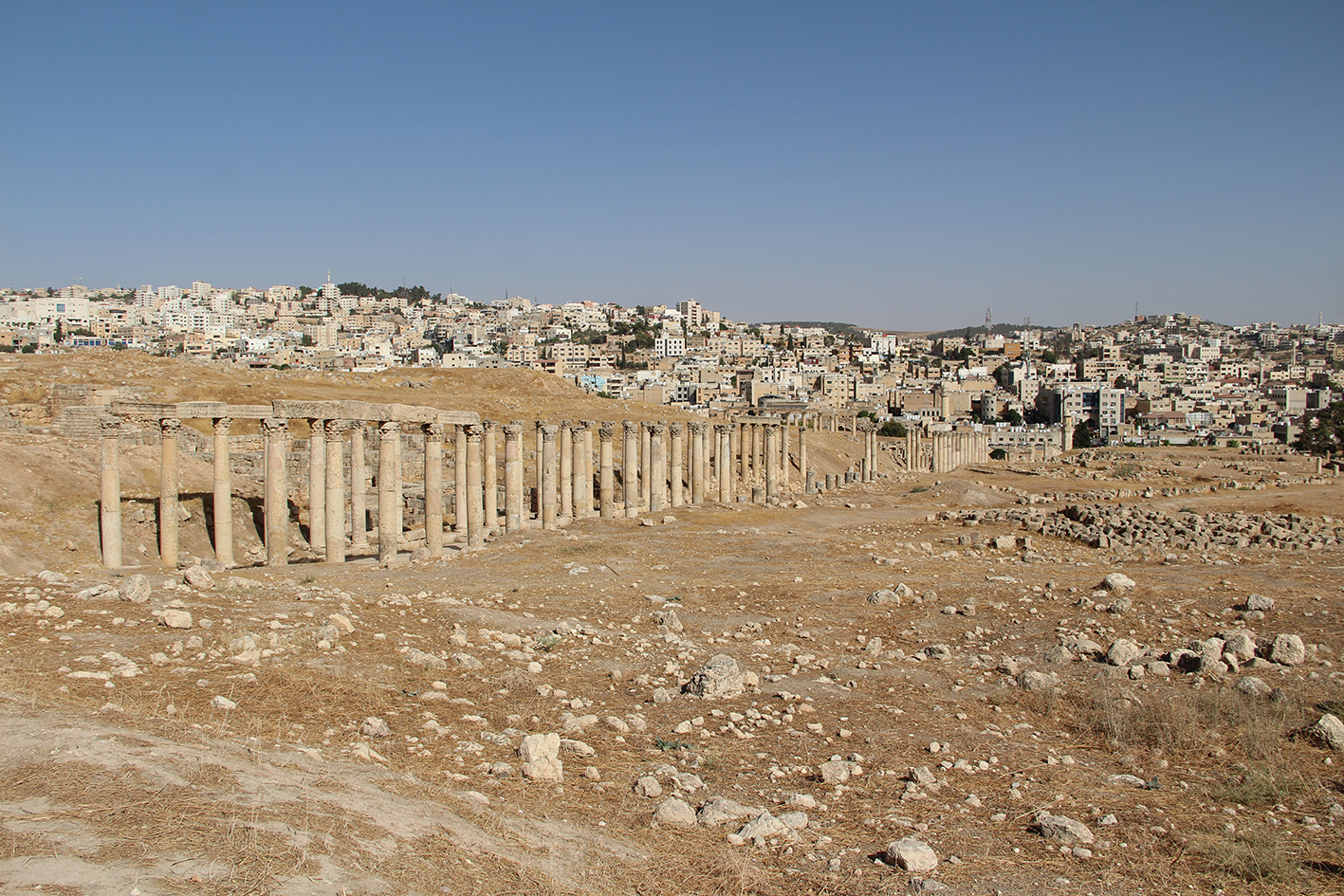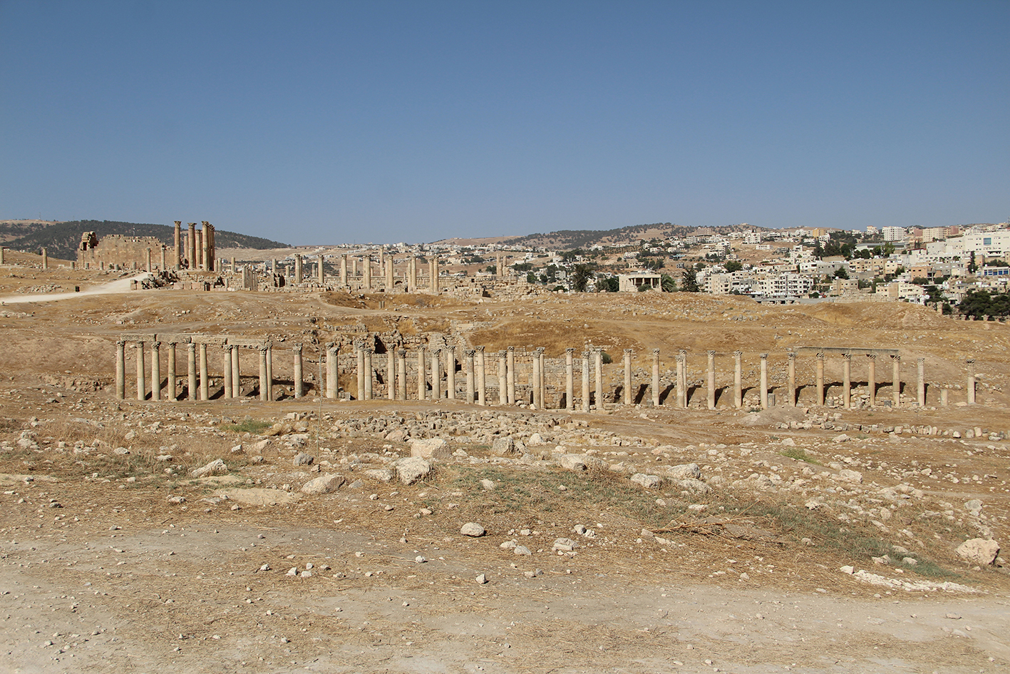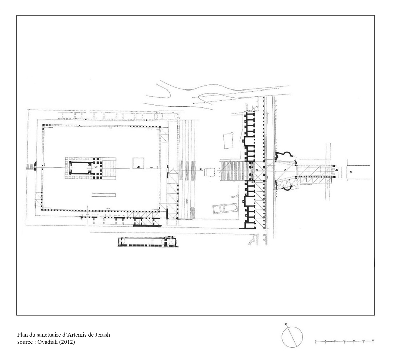 L’antique cité de Jerash/Gerasa qui fait partie des Decapoles s’étend sur les deux rives du wadî Jerash/Chrysorrhoas. La cité a conservé les principaux monuments d’une ville Hellénistique et Romaine : un arc monumental (ill.3, 4), un hippodrôme (ill.7-10), deux théâtres au sud (ill.19, 20) et au nord (ill.38, 39), un sanctuaire dédié à Zeus (ill.13-18) et un autre à Artemis (ill.33-36) ; une Place Ovale d’où part un cardo avec ses portes et ses tétrapyles (ill.21-29), deux decumanus (ill.66, 67), un marché (macellum) avec latrines, un Nymphée, des thermes, une cathédrale et plusieurs églises paléochrétiennes, des quartiers d’habitations, le tout entouré d’un mur d’enceinte de 4,2km.[1]