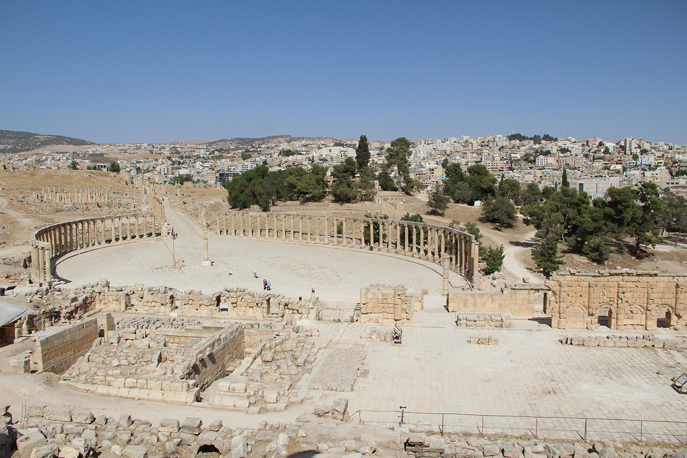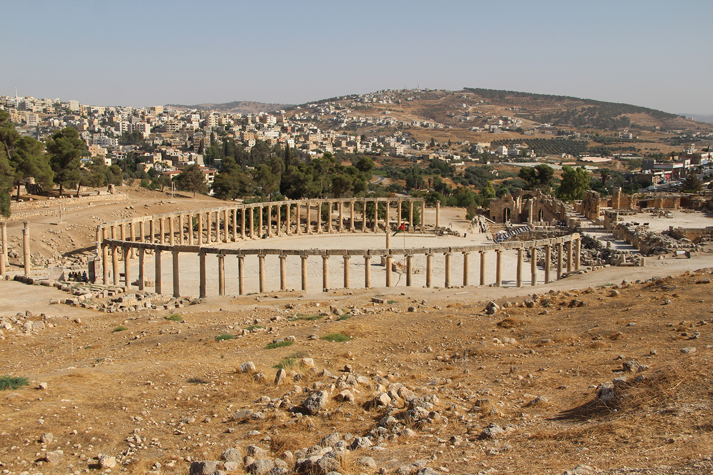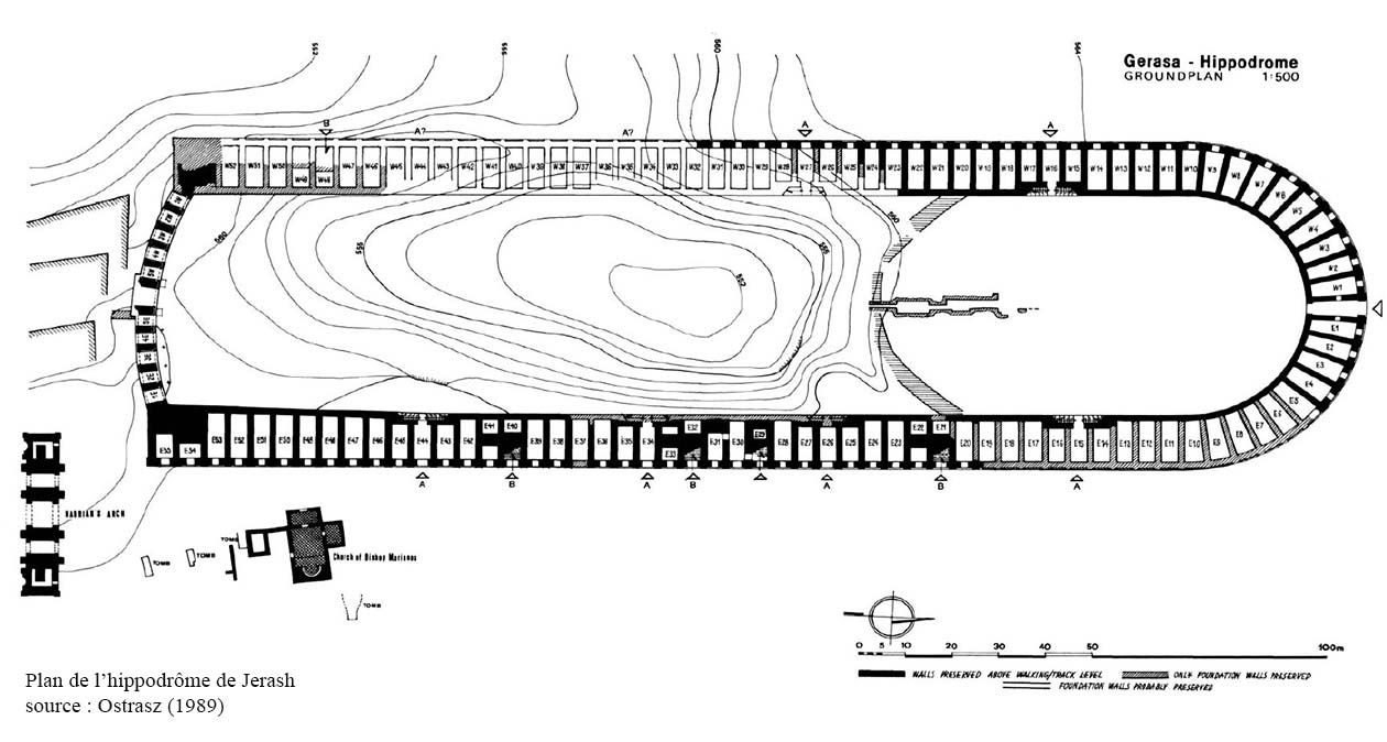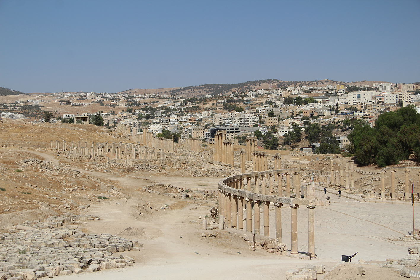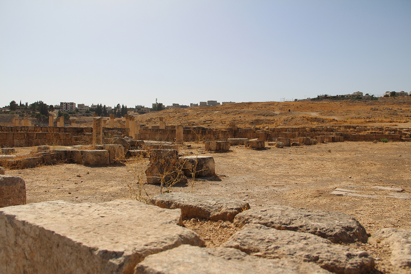 L’antique cité de Jerash/Gerasa qui fait partie des Decapoles s’étend sur les deux rives du wadî Jerash/Chrysorrhoas. La cité a conservé les principaux monuments d’une ville Hellénistique et Romaine : un arc monumental (ill.3, 4), un hippodrôme (ill.7-10), deux théâtres au sud (ill.19, 20) et au nord (ill.38, 39), un sanctuaire dédié à Zeus (ill.13-18) et un autre à Artemis (ill.33-36) ; une Place Ovale d’où part un cardo avec ses portes et ses tétrapyles (ill.21-29), deux decumanus (ill.66, 67), un marché (macellum) avec latrines, un Nymphée, des thermes, une cathédrale et plusieurs églises paléochrétiennes, des quartiers d’habitations, le tout entouré d’un mur d’enceinte de 4,2km.[1]