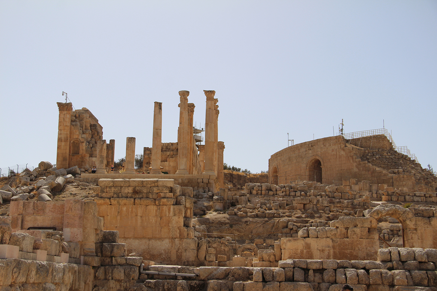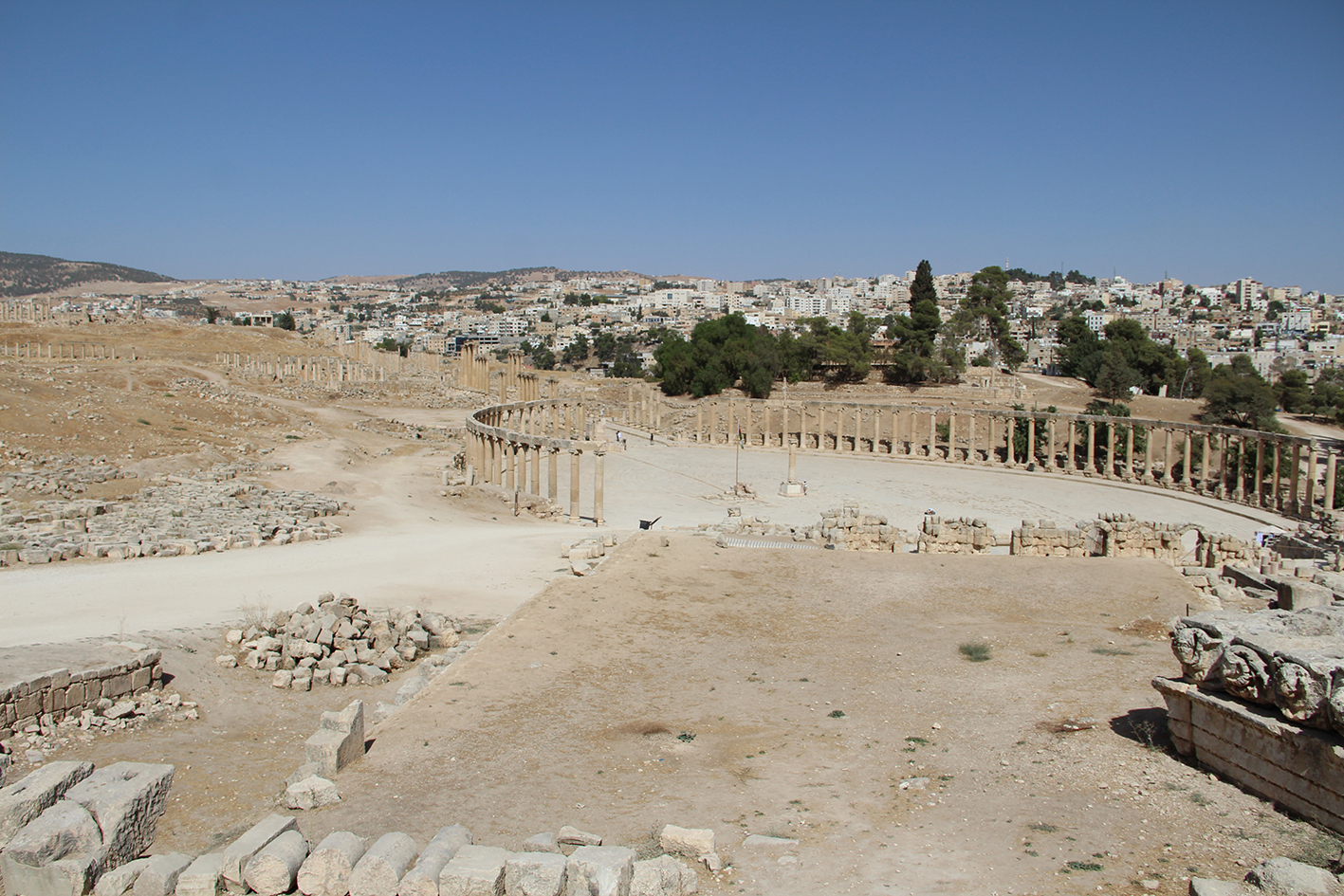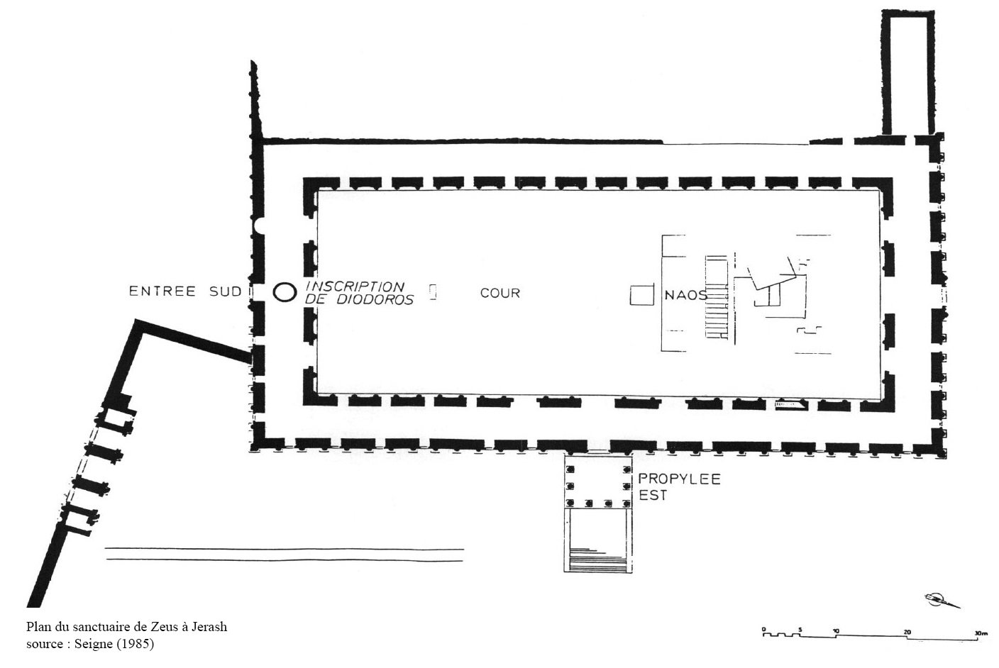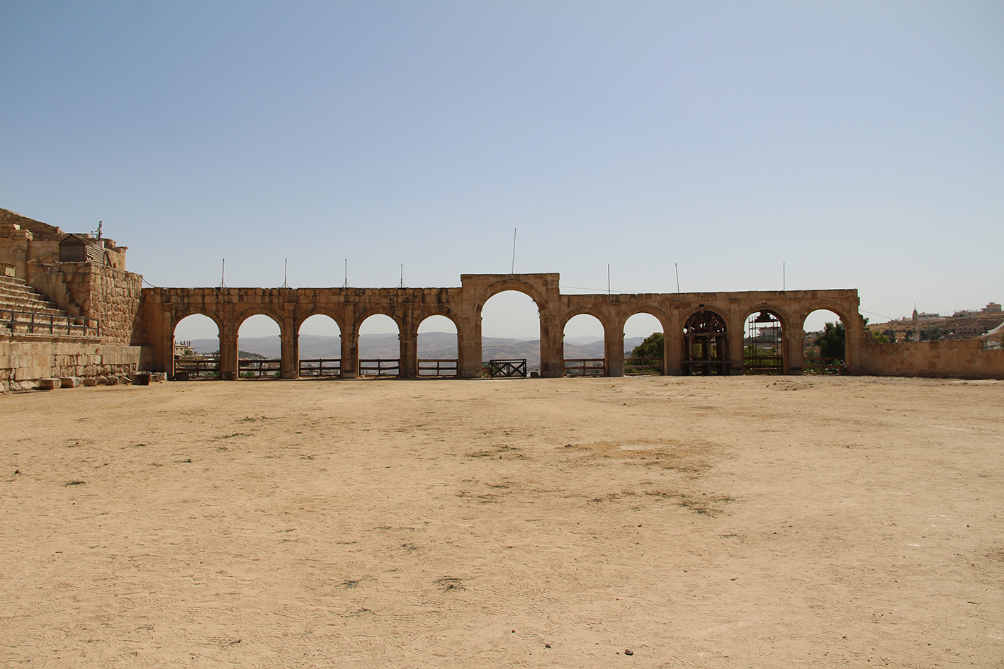 L’antique cité de Jerash/Gerasa qui fait partie des Decapoles s’étend sur les deux rives du wadî Jerash/Chrysorrhoas. La cité a conservé les principaux monuments d’une ville Hellénistique et Romaine : un arc monumental (ill.3, 4), un hippodrôme (ill.7-10), deux théâtres au sud (ill.19, 20) et au nord (ill.38, 39), un sanctuaire dédié à Zeus (ill.13-18) et un autre à Artemis (ill.33-36) ; une Place Ovale d’où part un cardo avec ses portes et ses tétrapyles (ill.21-29), deux decumanus (ill.66, 67), un marché (macellum) avec latrines, un Nymphée, des thermes, une cathédrale et plusieurs églises paléochrétiennes, des quartiers d’habitations, le tout entouré d’un mur d’enceinte de 4,2km.[1]