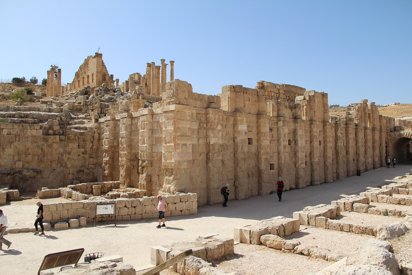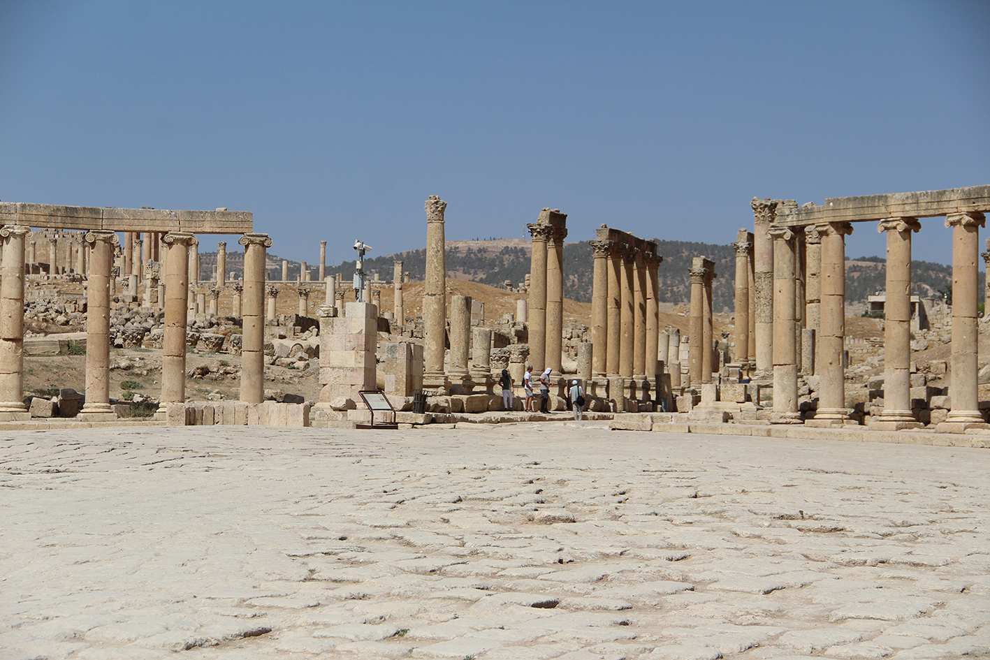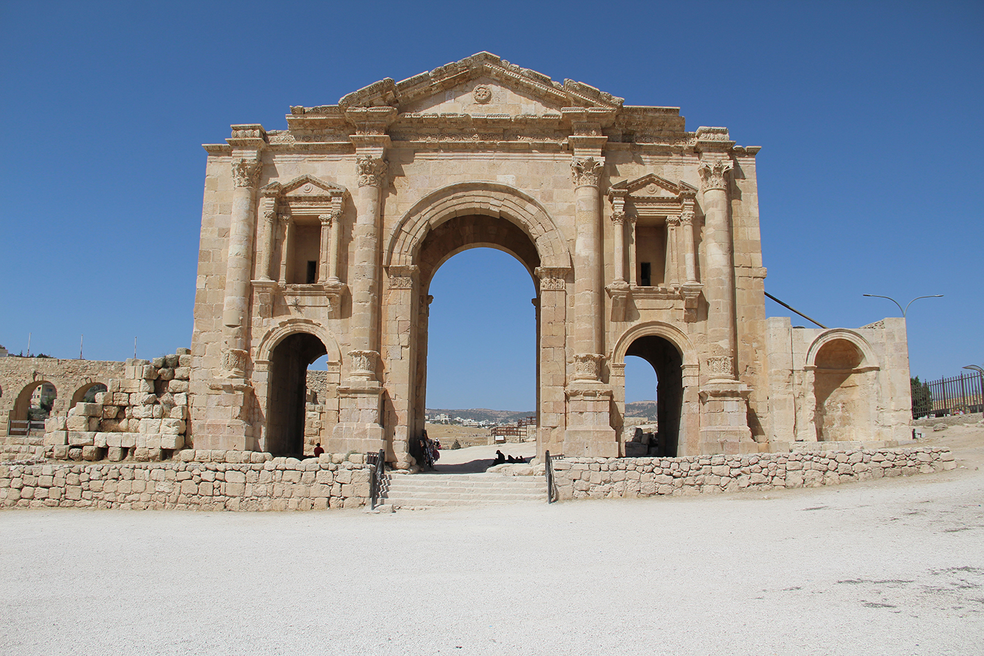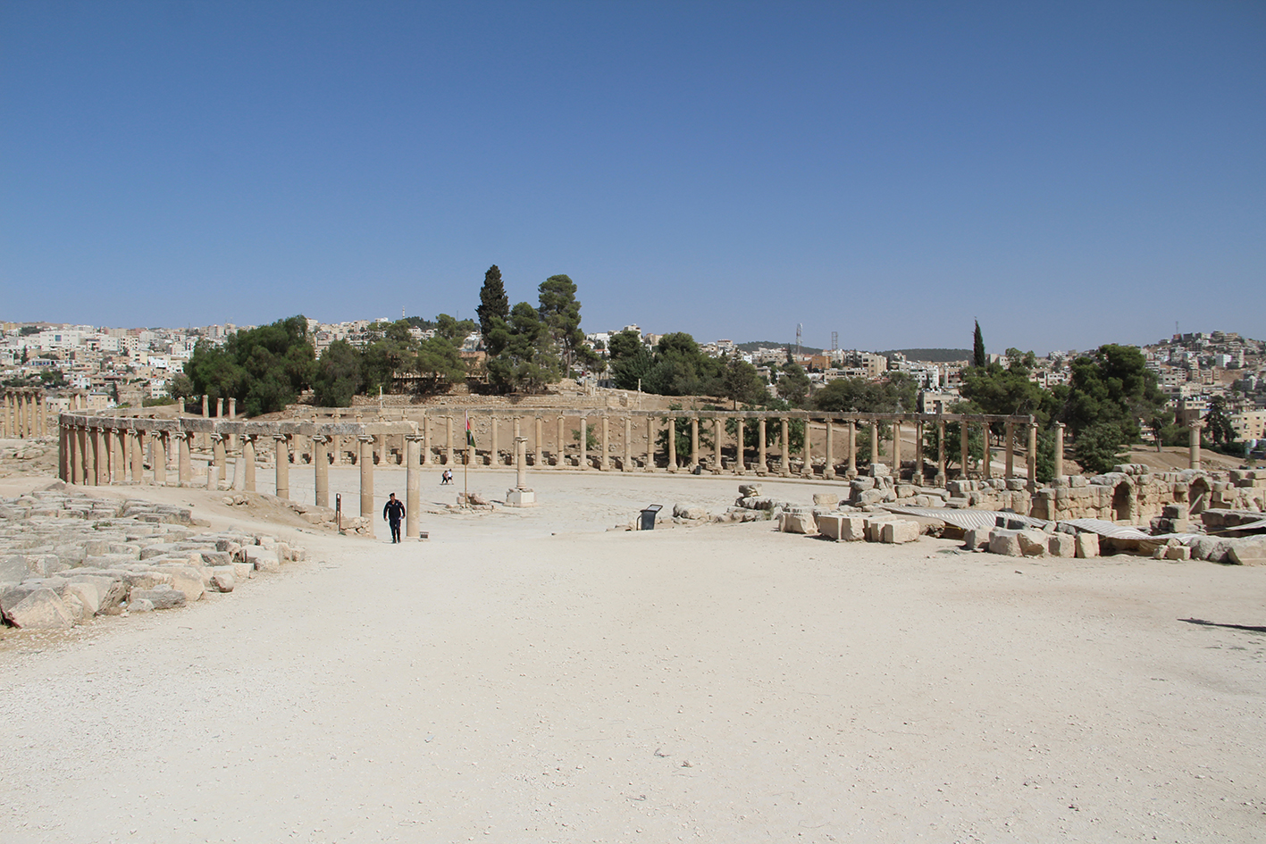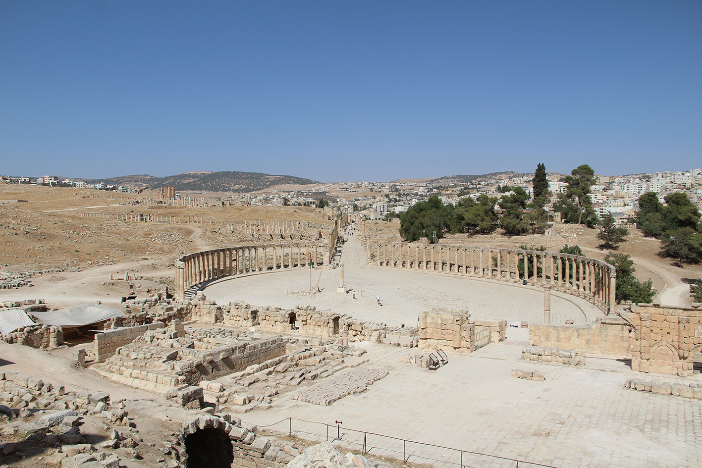 L’antique cité de Jerash/Gerasa qui fait partie des Decapoles s’étend sur les deux rives du wadî Jerash/Chrysorrhoas. La cité a conservé les principaux monuments d’une ville Hellénistique et Romaine : un arc monumental (ill.3, 4), un hippodrôme (ill.7-10), deux théâtres au sud (ill.19, 20) et au nord (ill.38, 39), un sanctuaire dédié à Zeus (ill.13-18) et un autre à Artemis (ill.33-36) ; une Place Ovale d’où part un cardo avec ses portes et ses tétrapyles (ill.21-29), deux decumanus (ill.66, 67), un marché (macellum) avec latrines, un Nymphée, des thermes, une cathédrale et plusieurs églises paléochrétiennes, des quartiers d’habitations, le tout entouré d’un mur d’enceinte de 4,2km.[1]