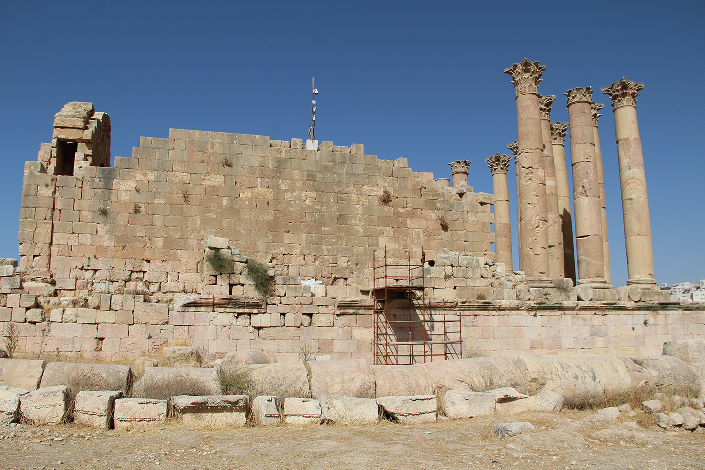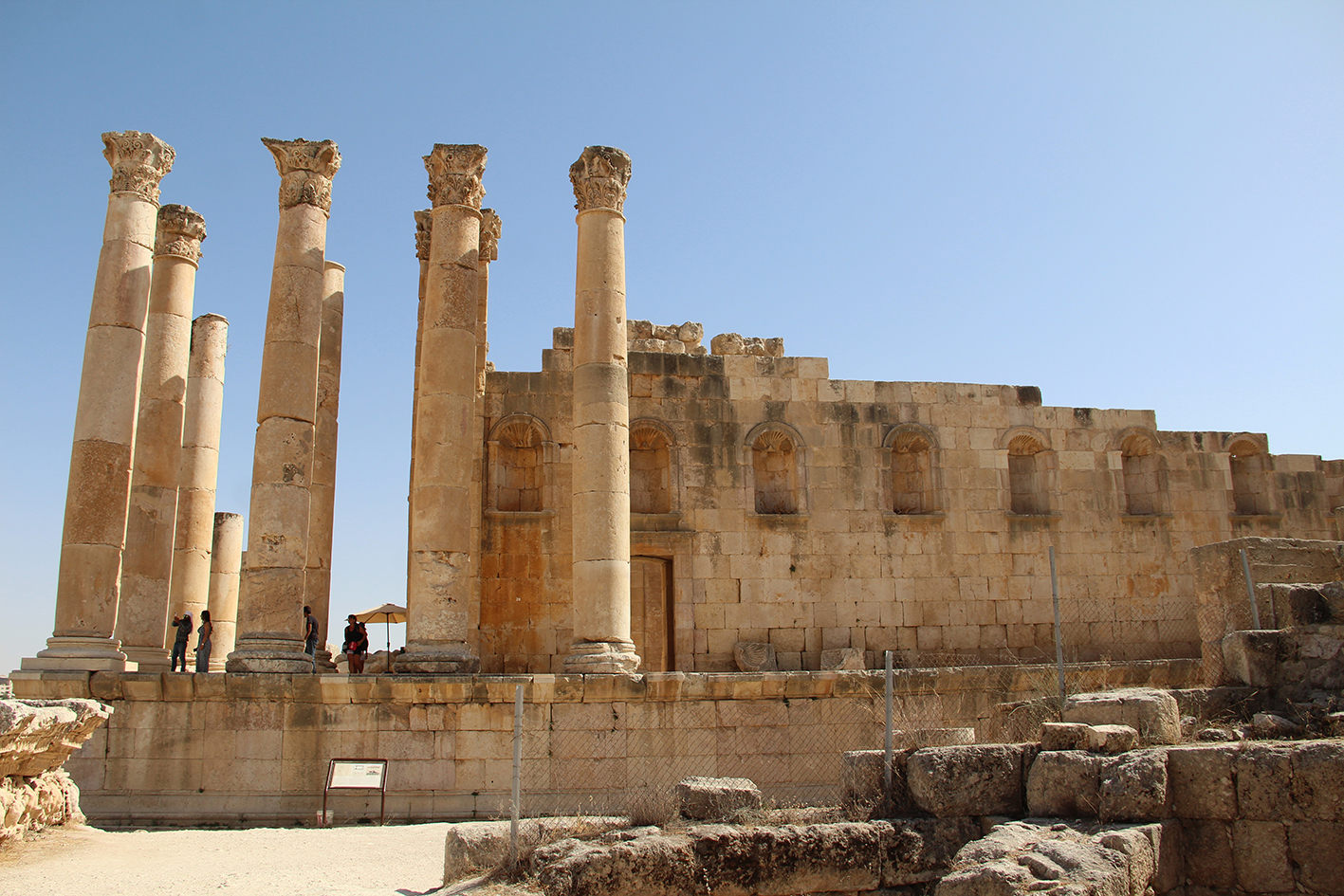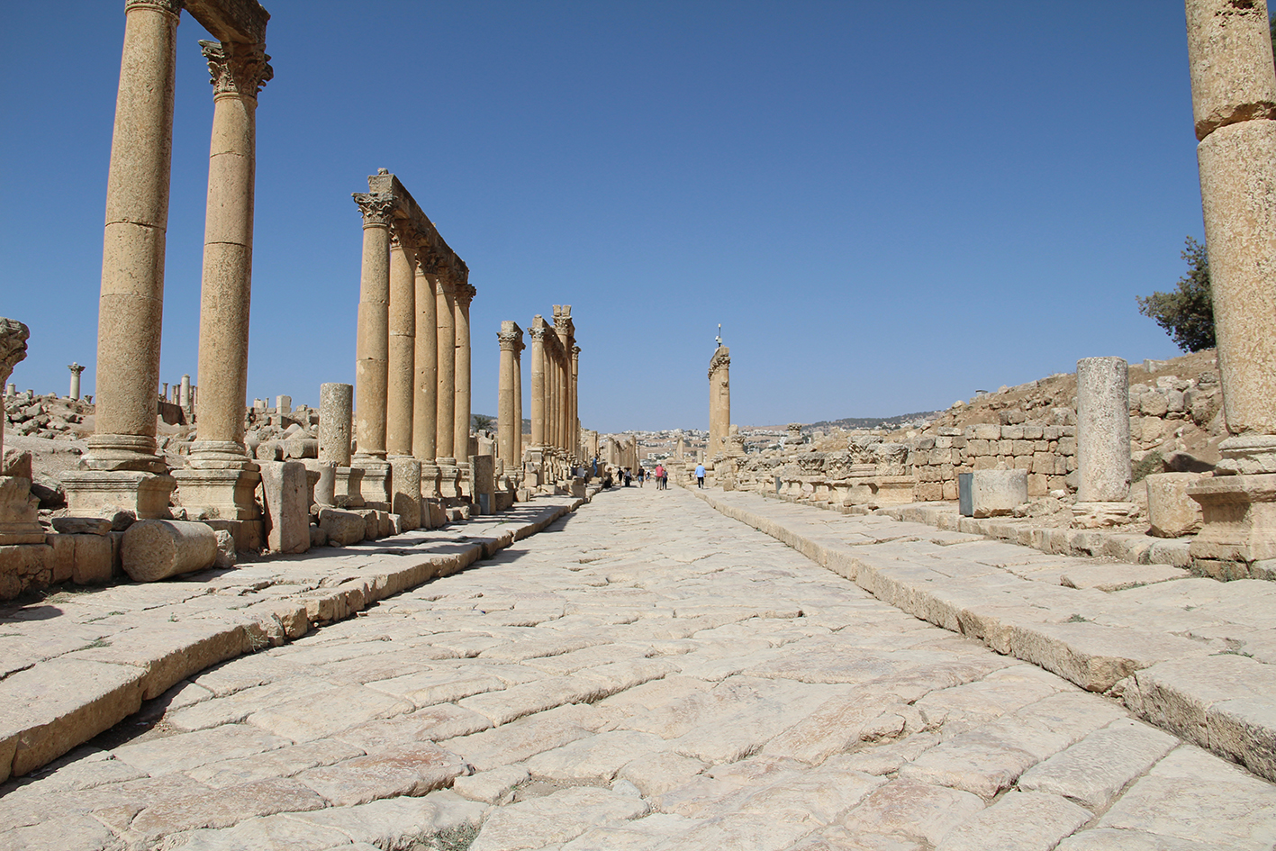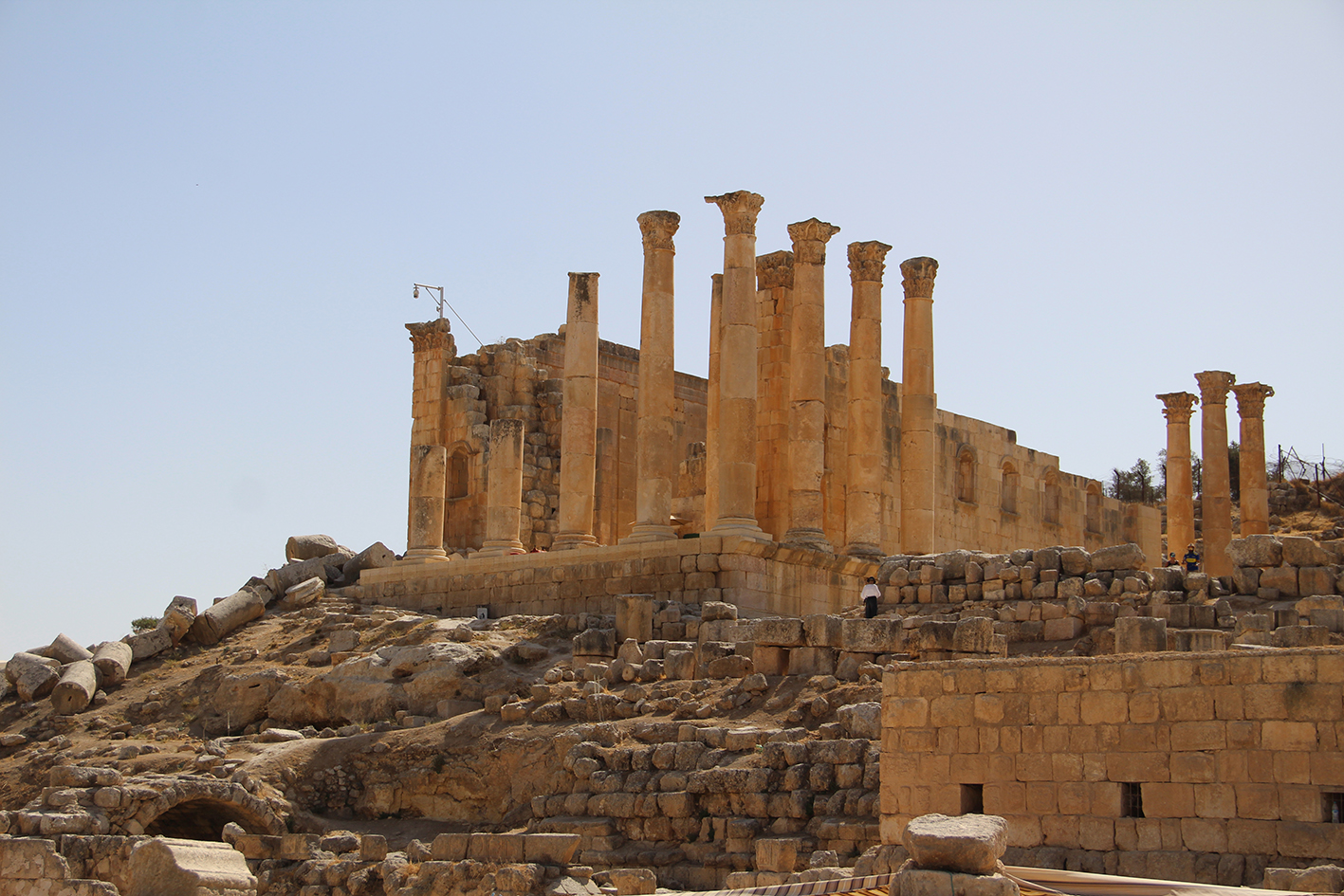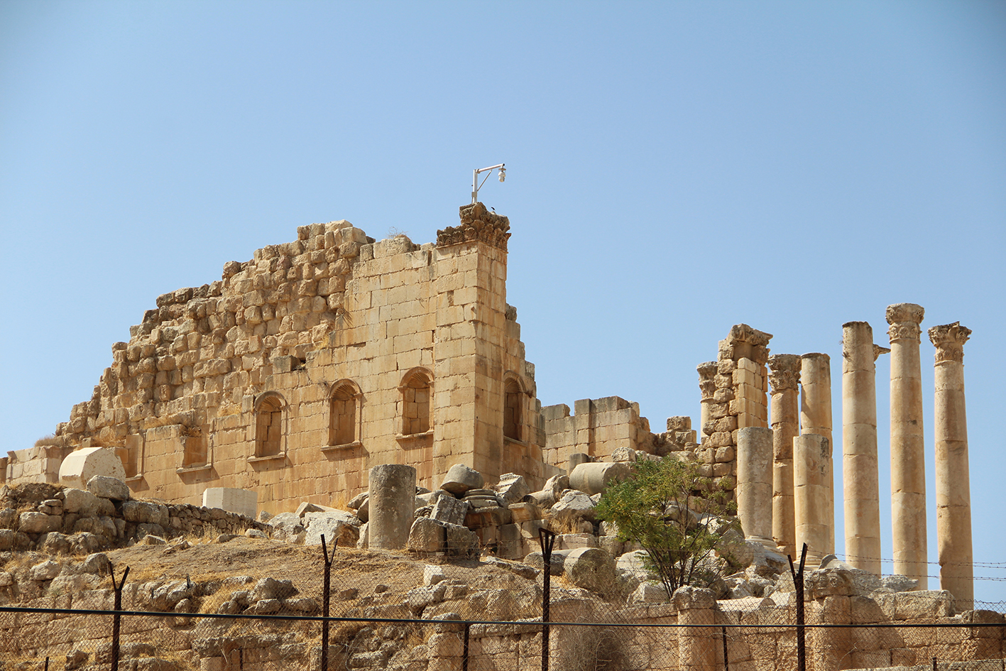 L’antique cité de Jerash/Gerasa qui fait partie des Decapoles s’étend sur les deux rives du wadî Jerash/Chrysorrhoas. La cité a conservé les principaux monuments d’une ville Hellénistique et Romaine : un arc monumental (ill.3, 4), un hippodrôme (ill.7-10), deux théâtres au sud (ill.19, 20) et au nord (ill.38, 39), un sanctuaire dédié à Zeus (ill.13-18) et un autre à Artemis (ill.33-36) ; une Place Ovale d’où part un cardo avec ses portes et ses tétrapyles (ill.21-29), deux decumanus (ill.66, 67), un marché (macellum) avec latrines, un Nymphée, des thermes, une cathédrale et plusieurs églises paléochrétiennes, des quartiers d’habitations, le tout entouré d’un mur d’enceinte de 4,2km.[1]