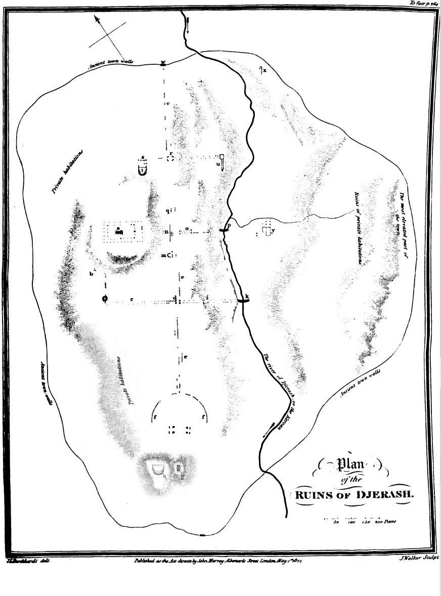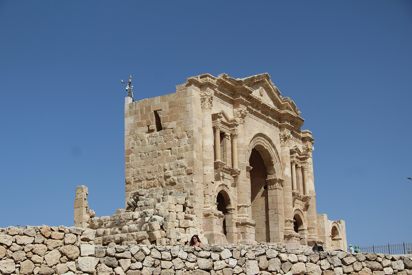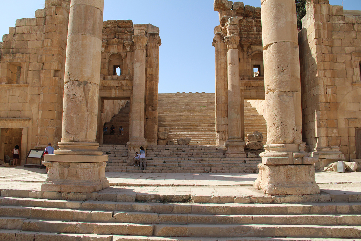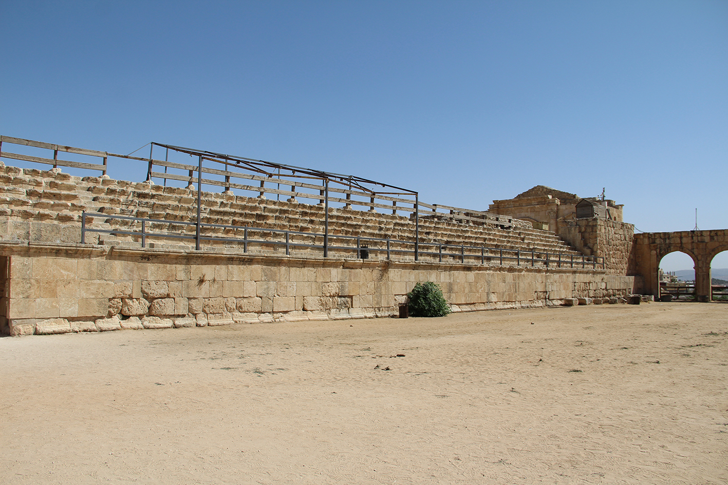 L’antique cité de Jerash/Gerasa qui fait partie des Decapoles s’étend sur les deux rives du wadî Jerash/Chrysorrhoas. La cité a conservé les principaux monuments d’une ville Hellénistique et Romaine : un arc monumental (ill.3, 4), un hippodrôme (ill.7-10), deux théâtres au sud (ill.19, 20) et au nord (ill.38, 39), un sanctuaire dédié à Zeus (ill.13-18) et un autre à Artemis (ill.33-36) ; une Place Ovale d’où part un cardo avec ses portes et ses tétrapyles (ill.21-29), deux decumanus (ill.66, 67), un marché (macellum) avec latrines, un Nymphée, des thermes, une cathédrale et plusieurs églises paléochrétiennes, des quartiers d’habitations, le tout entouré d’un mur d’enceinte de 4,2km.[1]