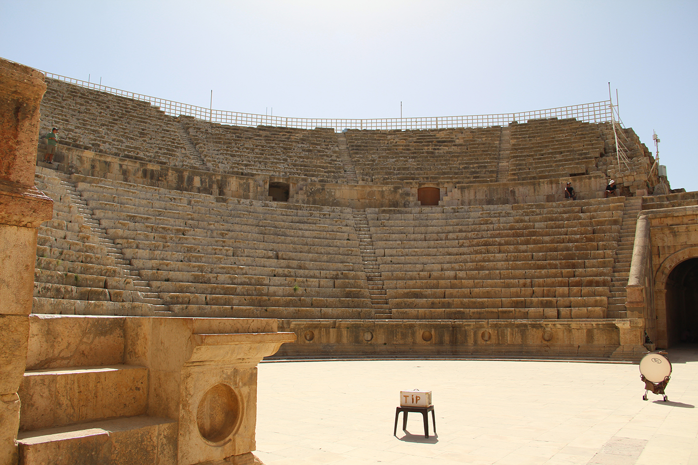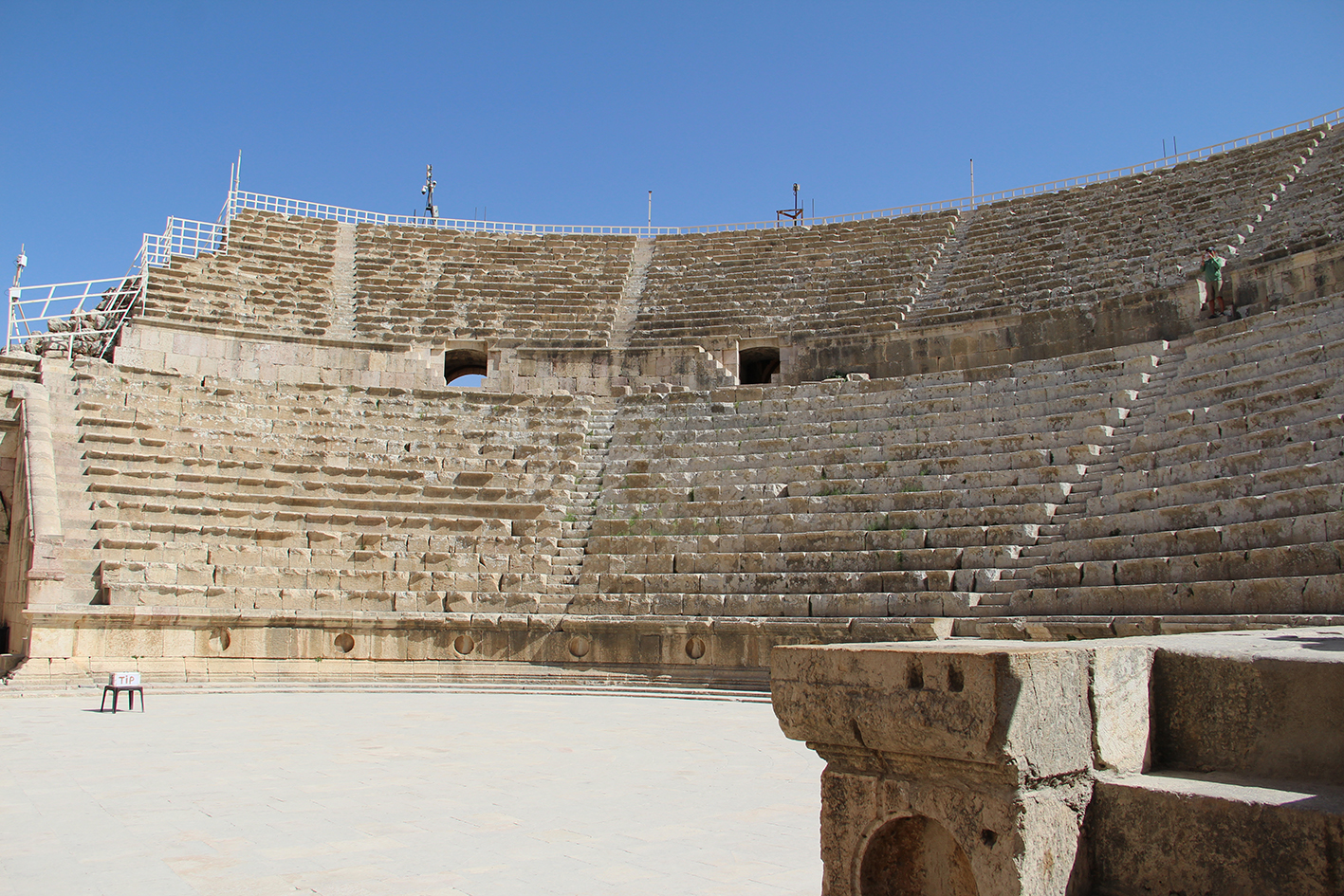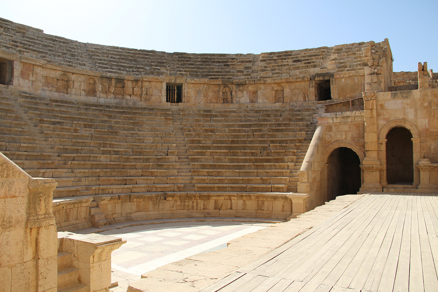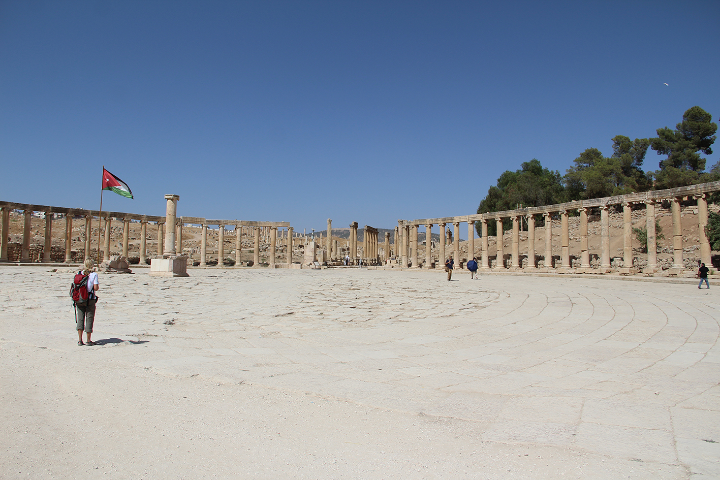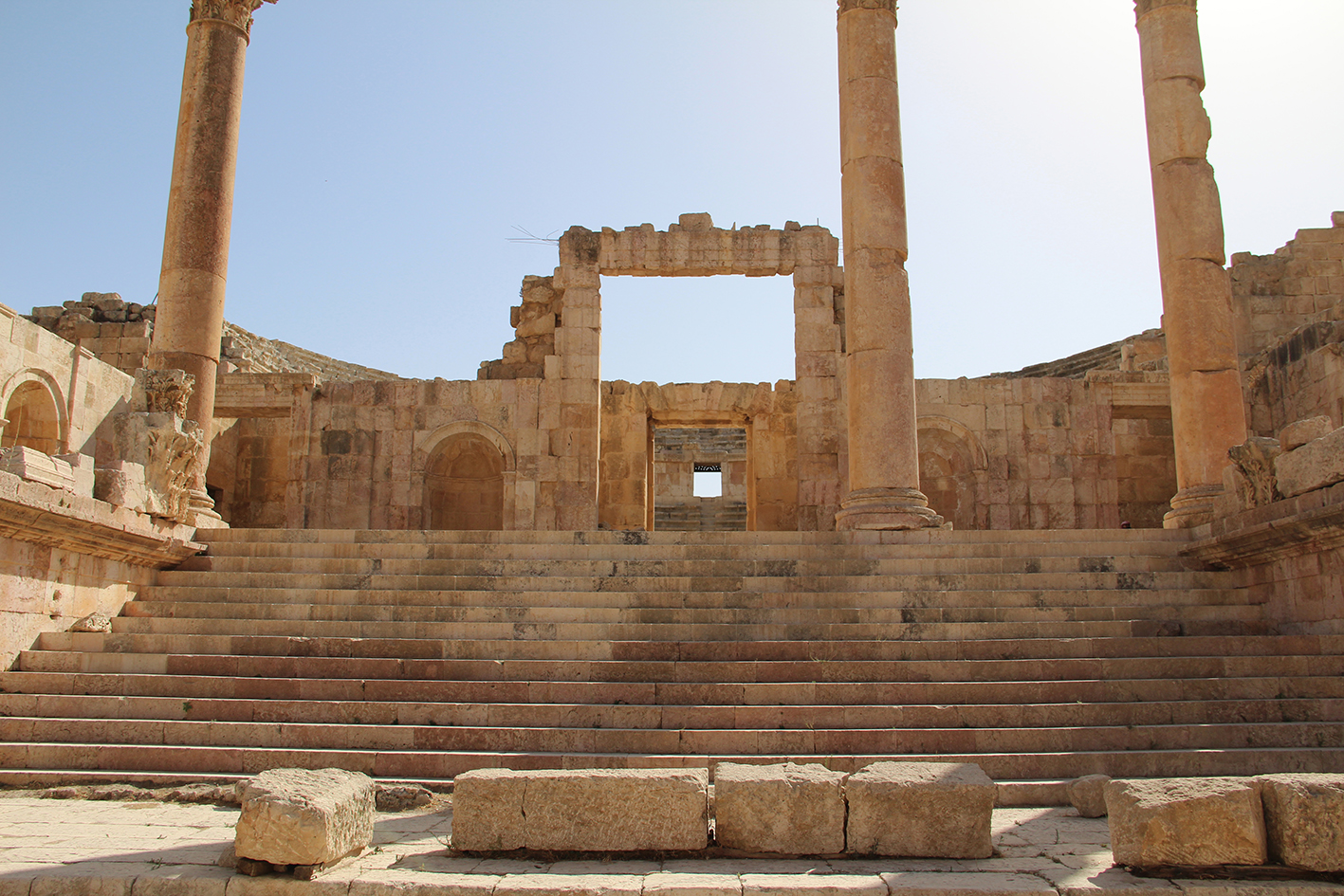 L’antique cité de Jerash/Gerasa qui fait partie des Decapoles s’étend sur les deux rives du wadî Jerash/Chrysorrhoas. La cité a conservé les principaux monuments d’une ville Hellénistique et Romaine : un arc monumental (ill.3, 4), un hippodrôme (ill.7-10), deux théâtres au sud (ill.19, 20) et au nord (ill.38, 39), un sanctuaire dédié à Zeus (ill.13-18) et un autre à Artemis (ill.33-36) ; une Place Ovale d’où part un cardo avec ses portes et ses tétrapyles (ill.21-29), deux decumanus (ill.66, 67), un marché (macellum) avec latrines, un Nymphée, des thermes, une cathédrale et plusieurs églises paléochrétiennes, des quartiers d’habitations, le tout entouré d’un mur d’enceinte de 4,2km.[1]