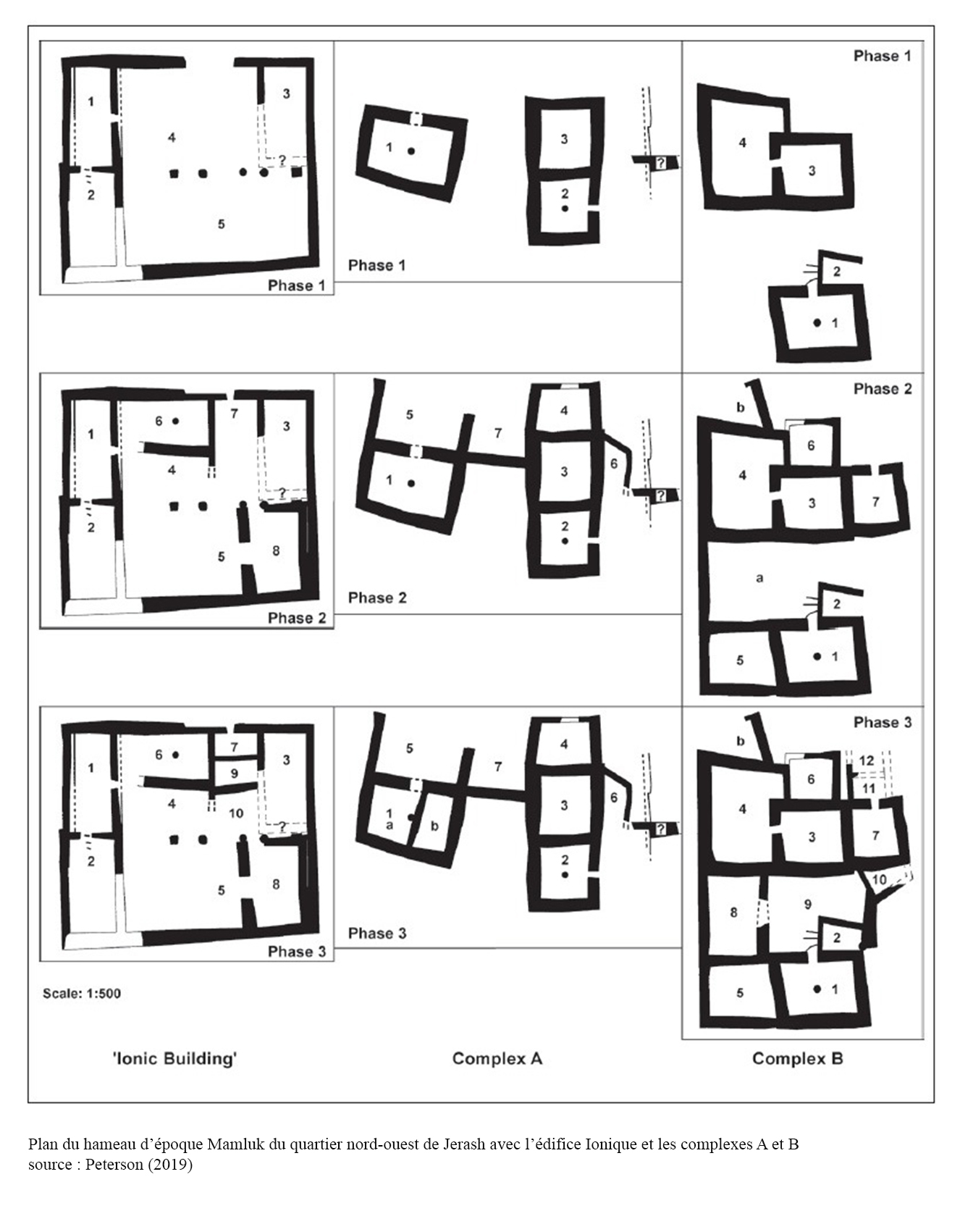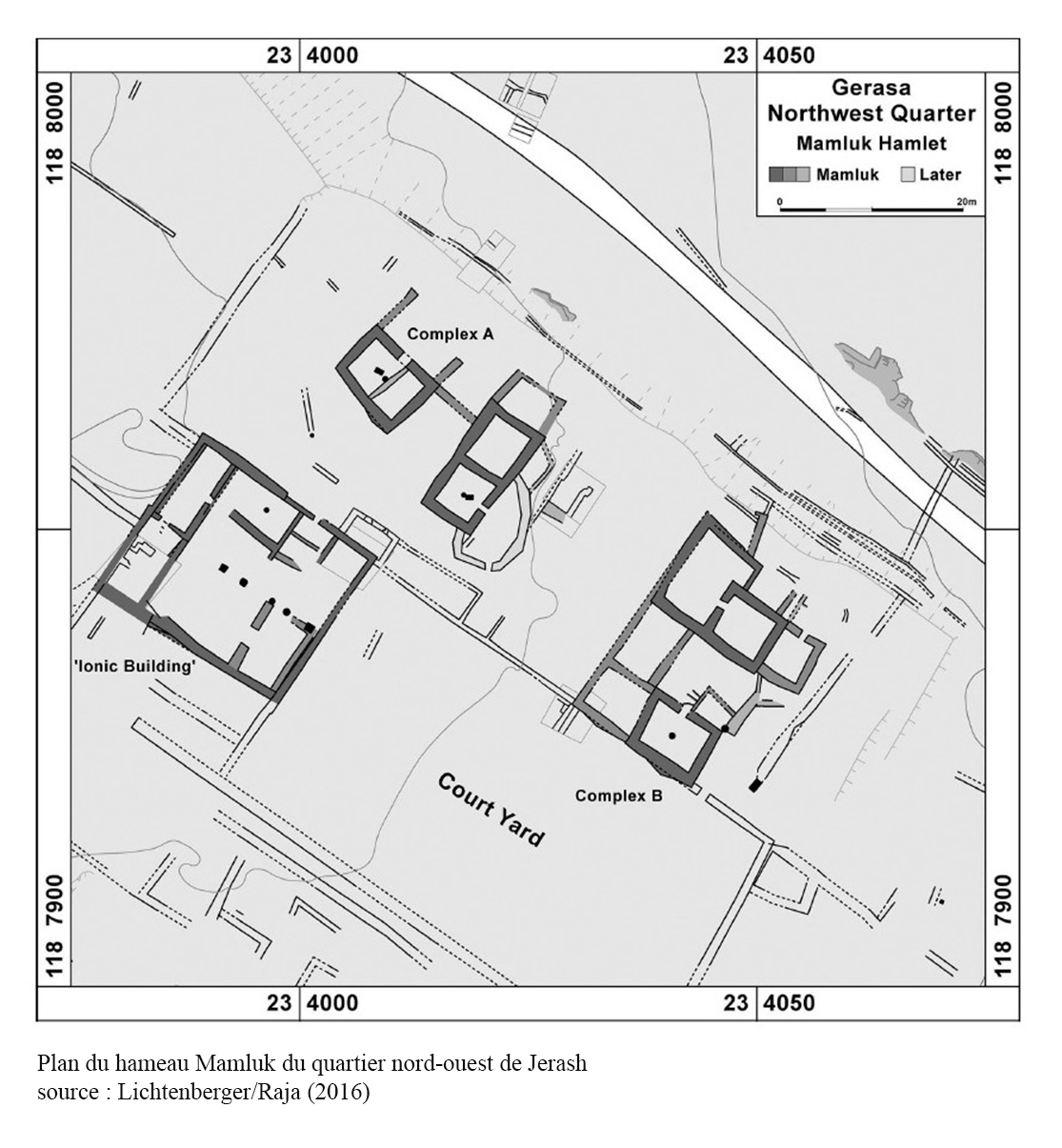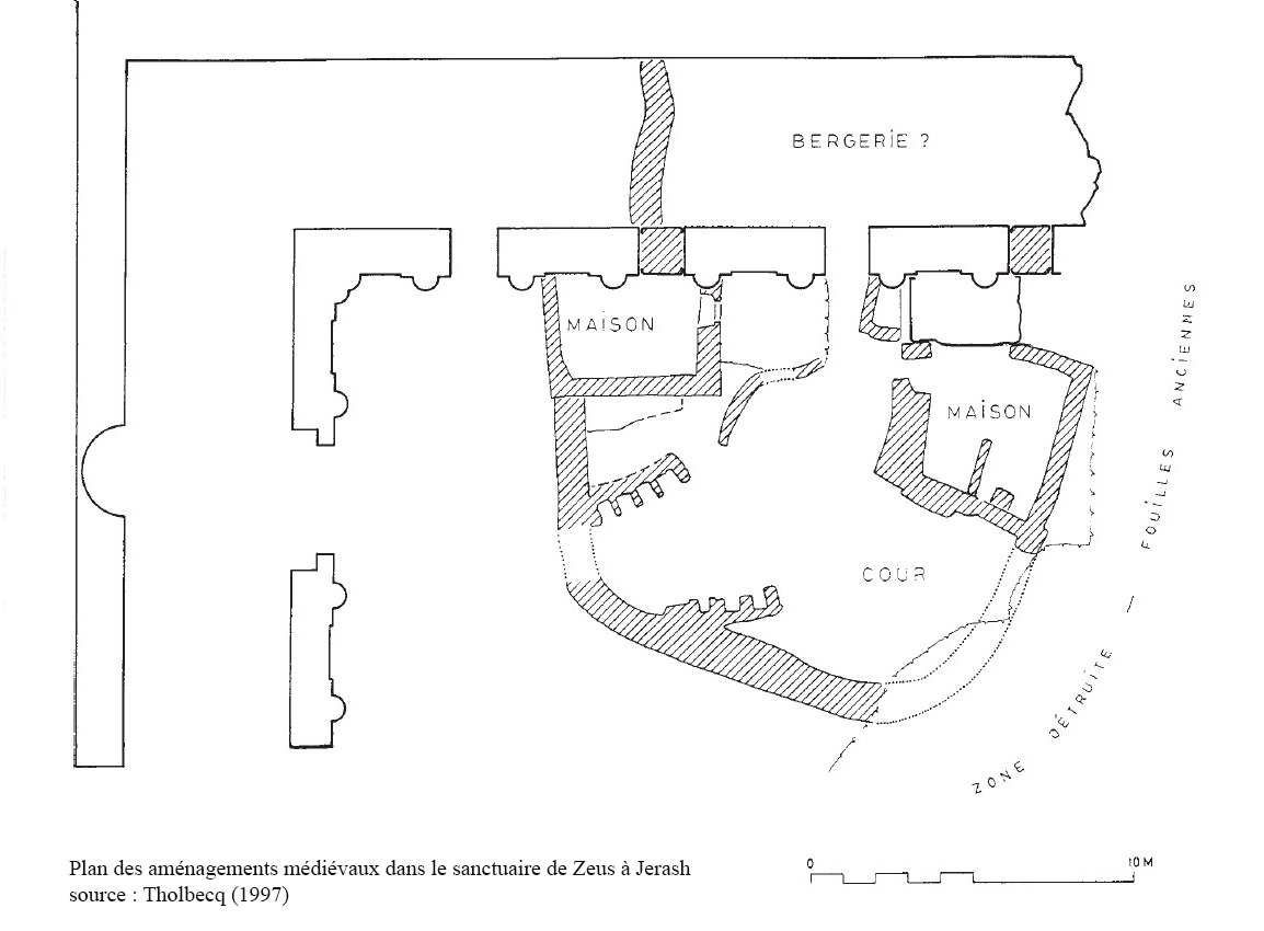 Les constructions d’époque Omeyyades ont donc été rasées, remblayées puis nivellées afin de servir de fondations aux nouvelles constructions sous les Ayyûbides/Mamluk, certains murs antérieurs sont aussi conservés et réutilisés. Ces habitats agglomérés ressemblent à ceux découverts à l’angle sud-ouest de la cour du sanctuaire de Zeus, à ceux du Tell Hisban et en plus imposants à ceux de Nahal Haggit.[30]