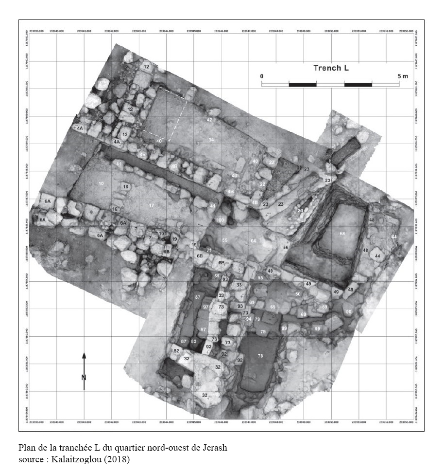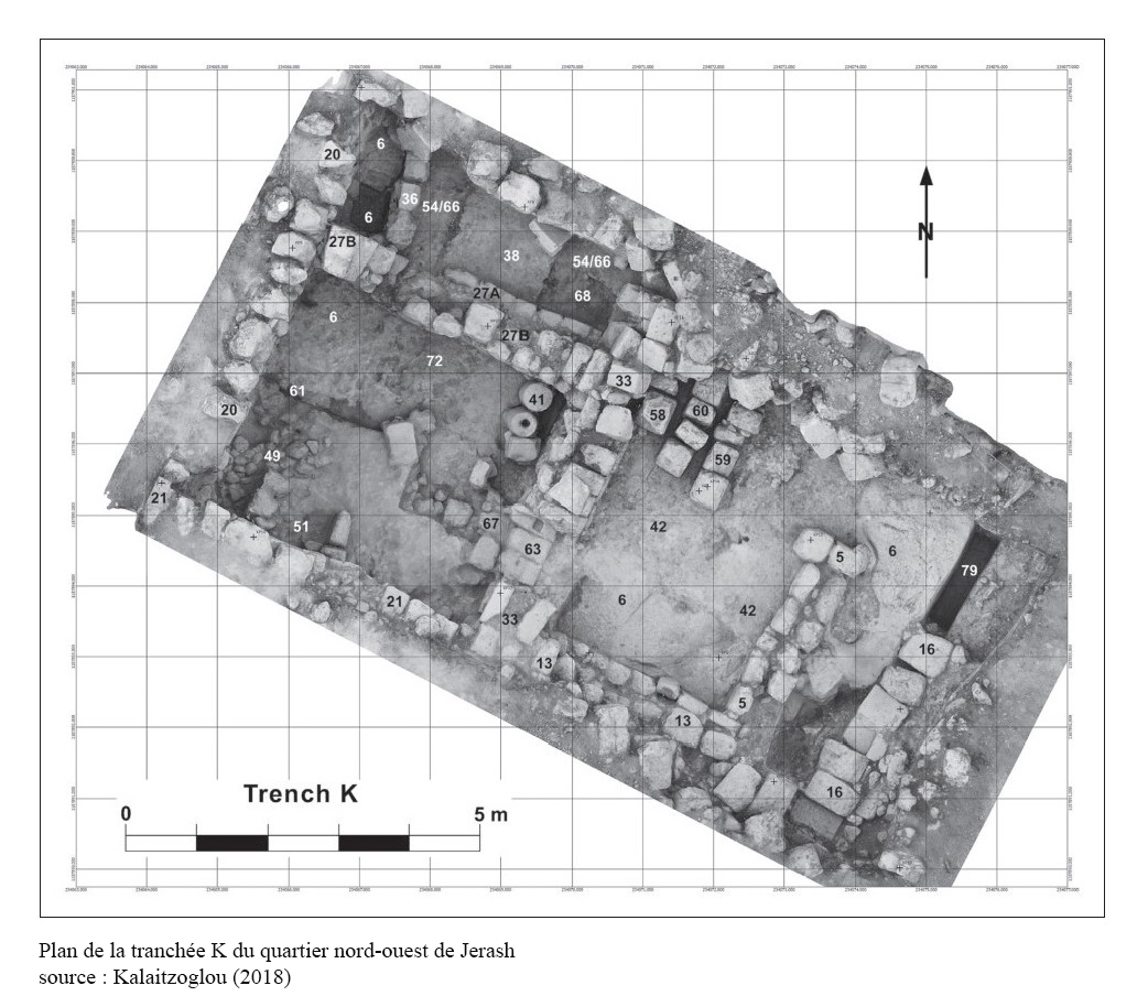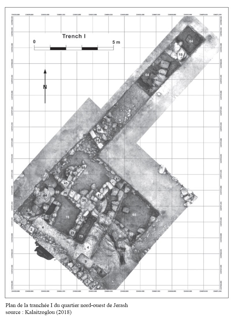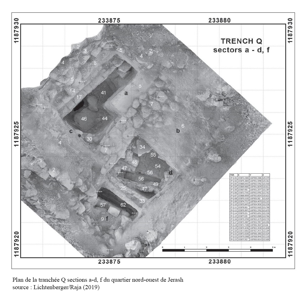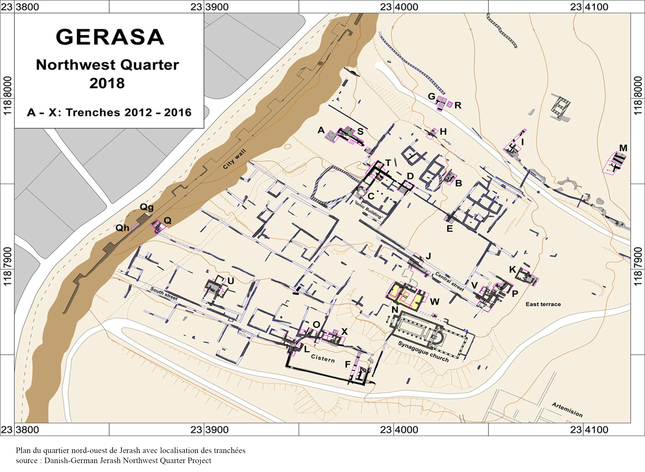 Le quartier nord-ouest de Jerash est fouillé par la mission Germano-Danoise (fouilles en 2012, 2013, 2014, 2015, 2016). Les tranchées effectuées lors de ces missions permettent de se faire une idée sur l’occupation de ce quartier à l’écart du reste de la ville.
