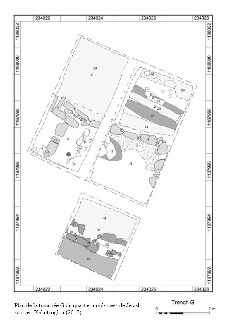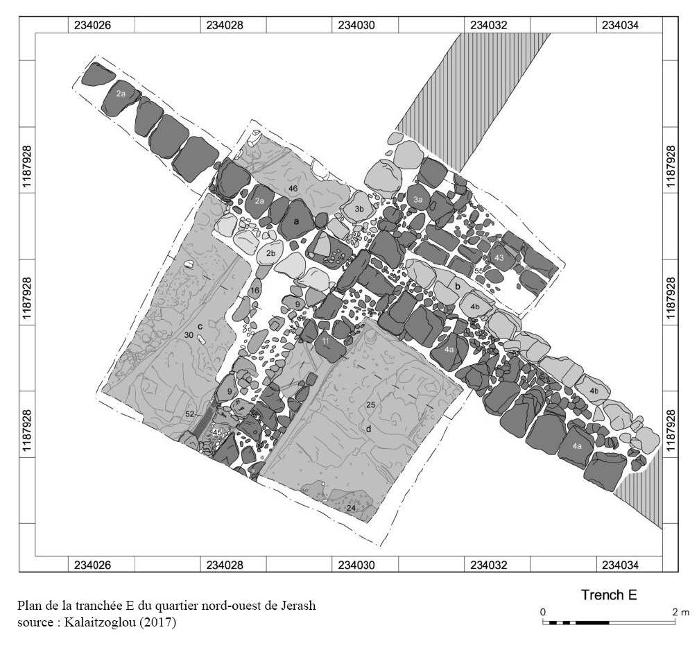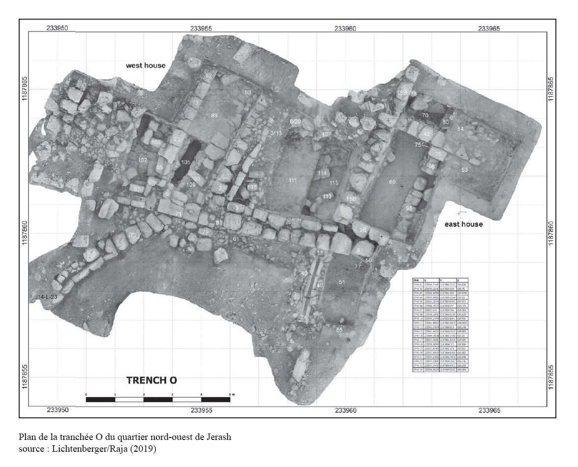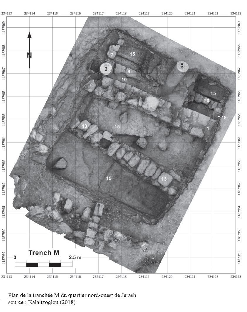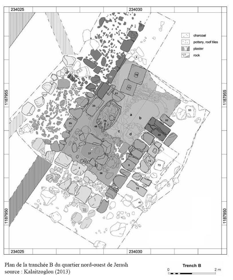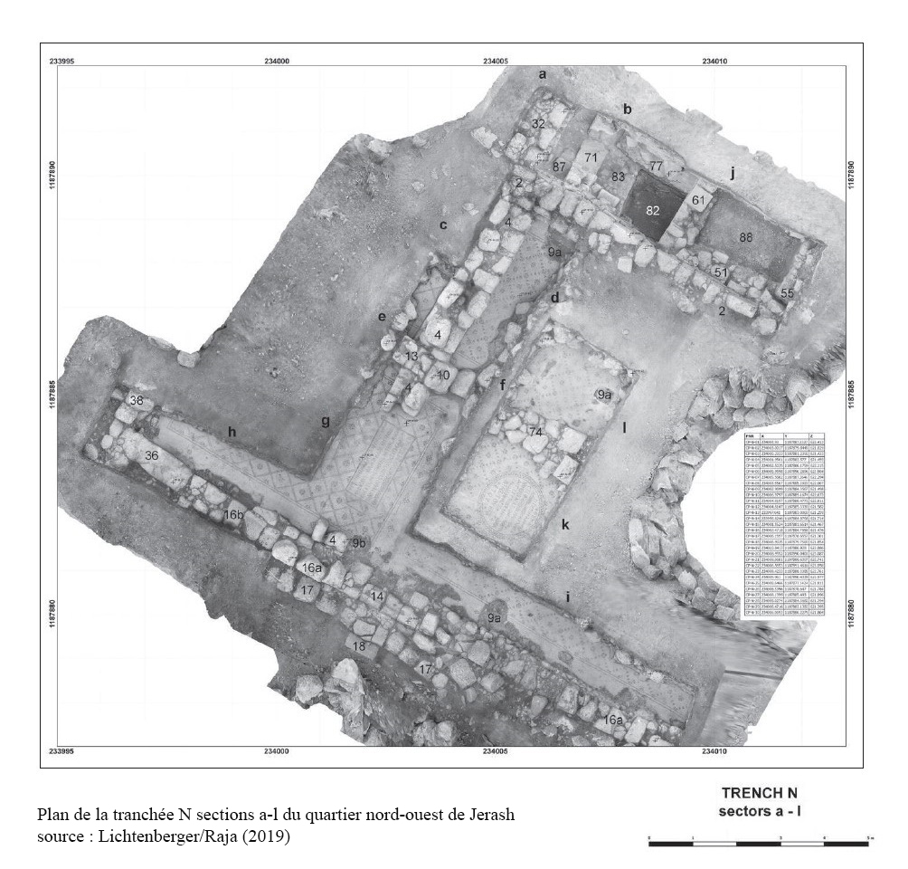 Le quartier nord-ouest de Jerash est fouillé par la mission Germano-Danoise (fouilles en 2012, 2013, 2014, 2015, 2016). Les tranchées effectuées lors de ces missions permettent de se faire une idée sur l’occupation de ce quartier à l’écart du reste de la ville.