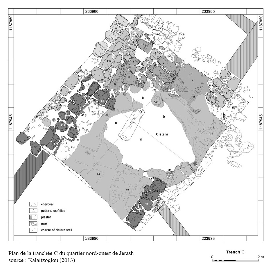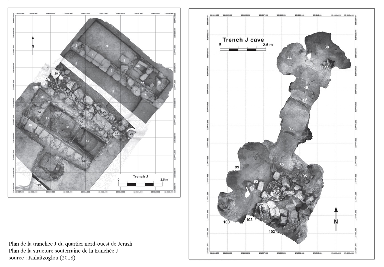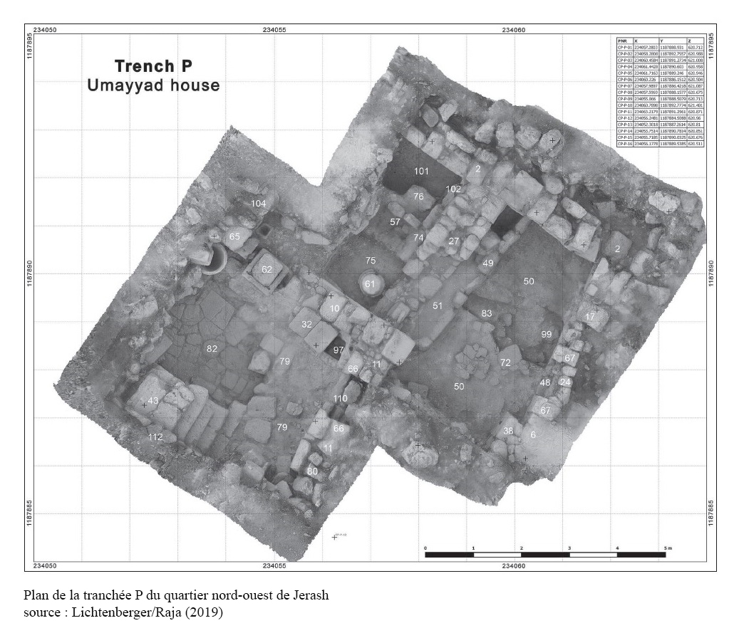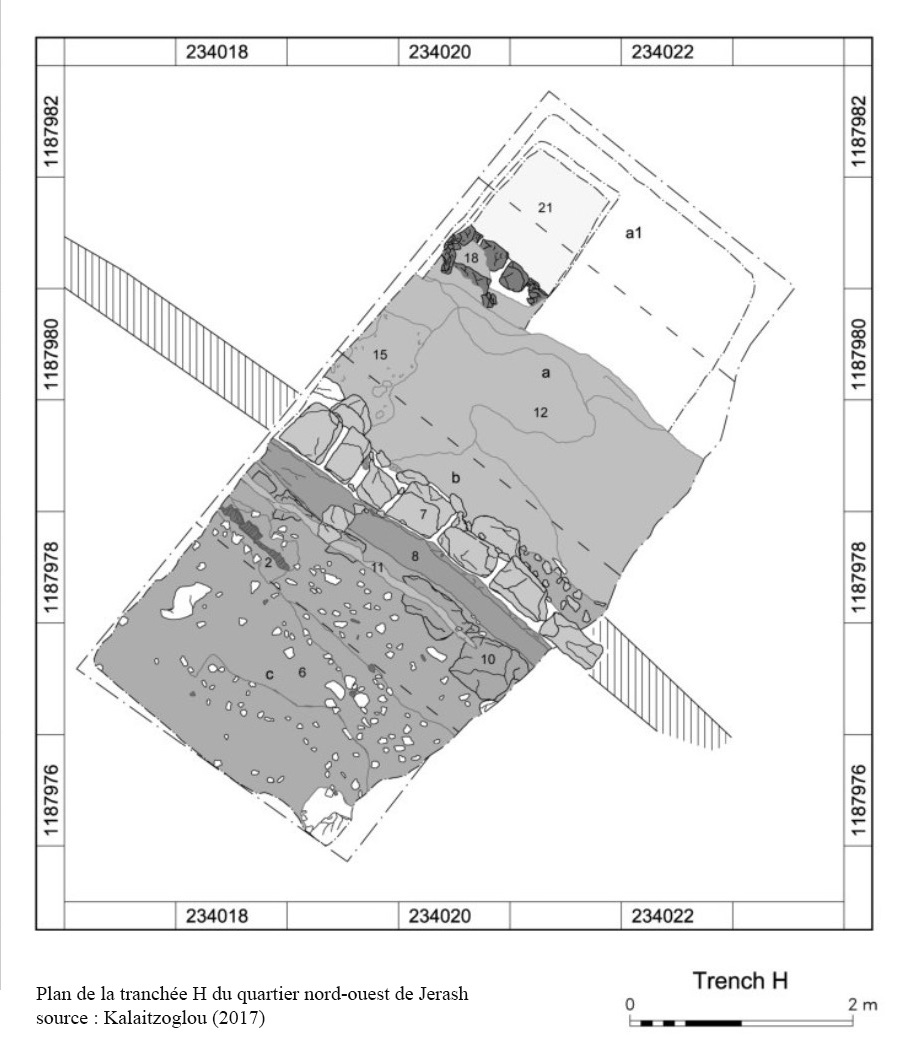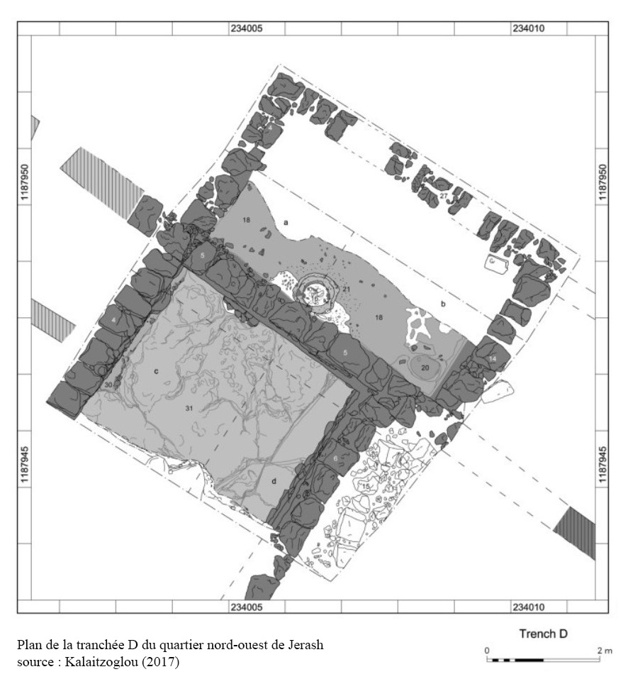 Le quartier nord-ouest de Jerash est fouillé par la mission Germano-Danoise (fouilles en 2012, 2013, 2014, 2015, 2016). Les tranchées effectuées lors de ces missions permettent de se faire une idée sur l’occupation de ce quartier à l’écart du reste de la ville.