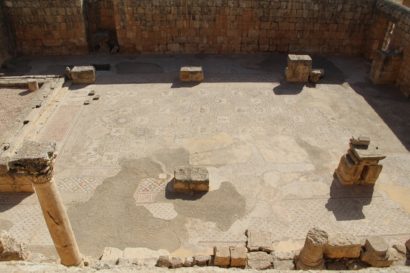 Tranchée N (ill.54)[23] : à l’ouest de la synagogue, dans la continuité de la tranchée J sur le côté sud et avec un accès aux salles souterraines. Découverte d’une salle souterraine avec sol en mosaïque et inscriptions grecques datées 576 et 591 A.D peut-être en lien avec la synagogue convertie en église. Les salles sont divisées en plus petites avec l’érection de murs au début de la période Islamique.