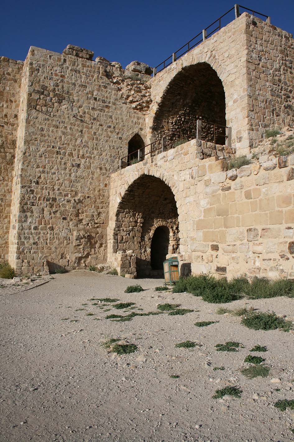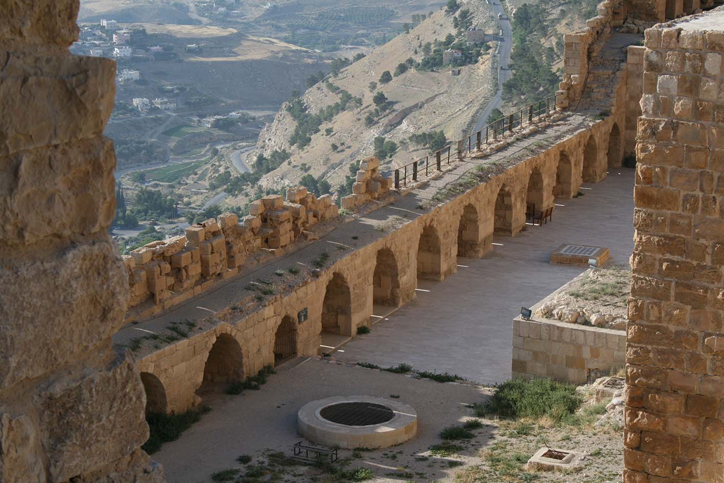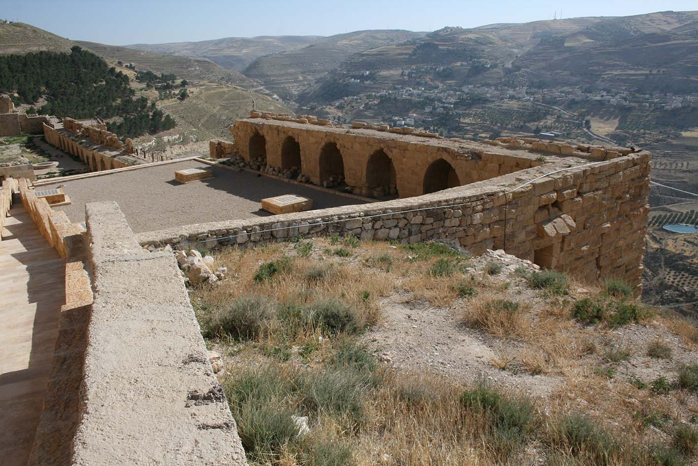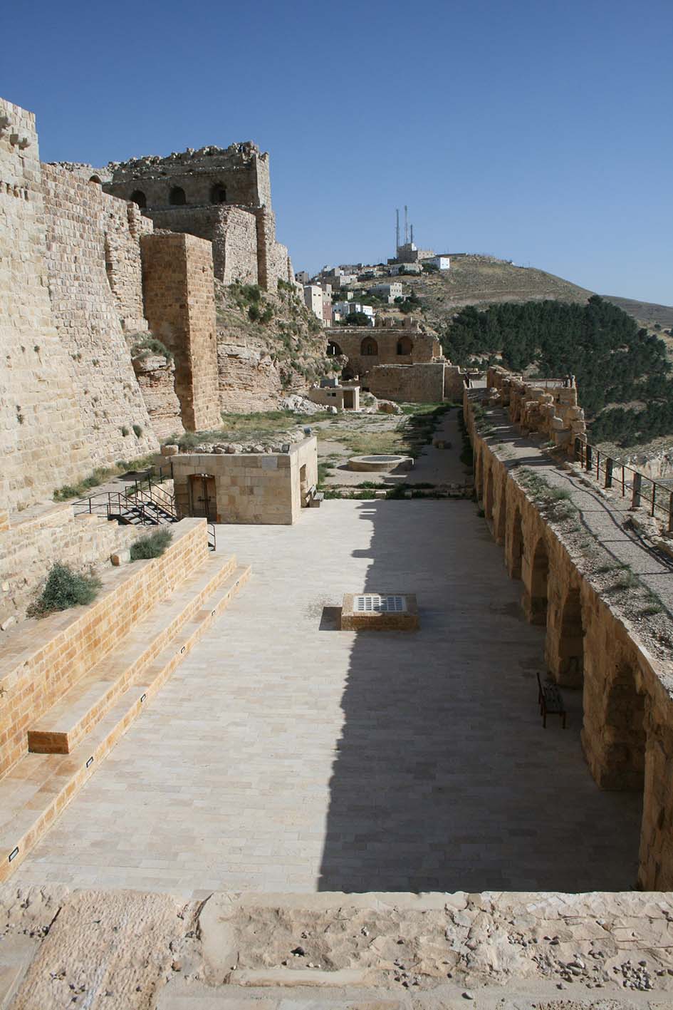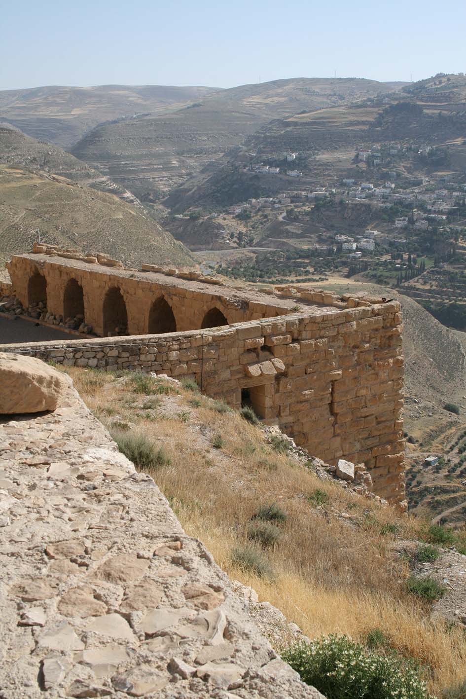 The most interesting building at Kerak is the huge Castle (now barracks) on the S. side. It is separated from the adjoining hill on the S. by a large artificial moat, and is provided with a reservoir. A moat also skirts the N. side of the fortress, and on the E. side the wall has a sloped or battered base. The walls are very thick and well preserved. The extensive galleries, corridors, and colonnades constitute it an admirable example of a Crusader's castle. The upper stories are in ruins, but the approaches to them are still in good preservation. A staircase descends into a subterranean chapel, where traces of frescoes are still visible. In the interior of the fortress are numerous cisterns. Although the springs are situated immediately outside the town, large cisterns have been constructed within the town (particularly by the tower of Beibars). The view from the top of the castle embraces the Dead Sea and the surrounding mountains. In the distance the Mt. of Olives, and even the Russian buildings beyond it, are visible. A survey of the valley of Jordan as far as the heights of Jericho is also obtained .