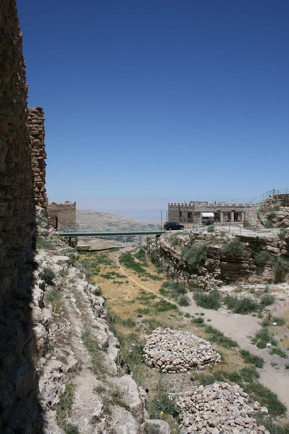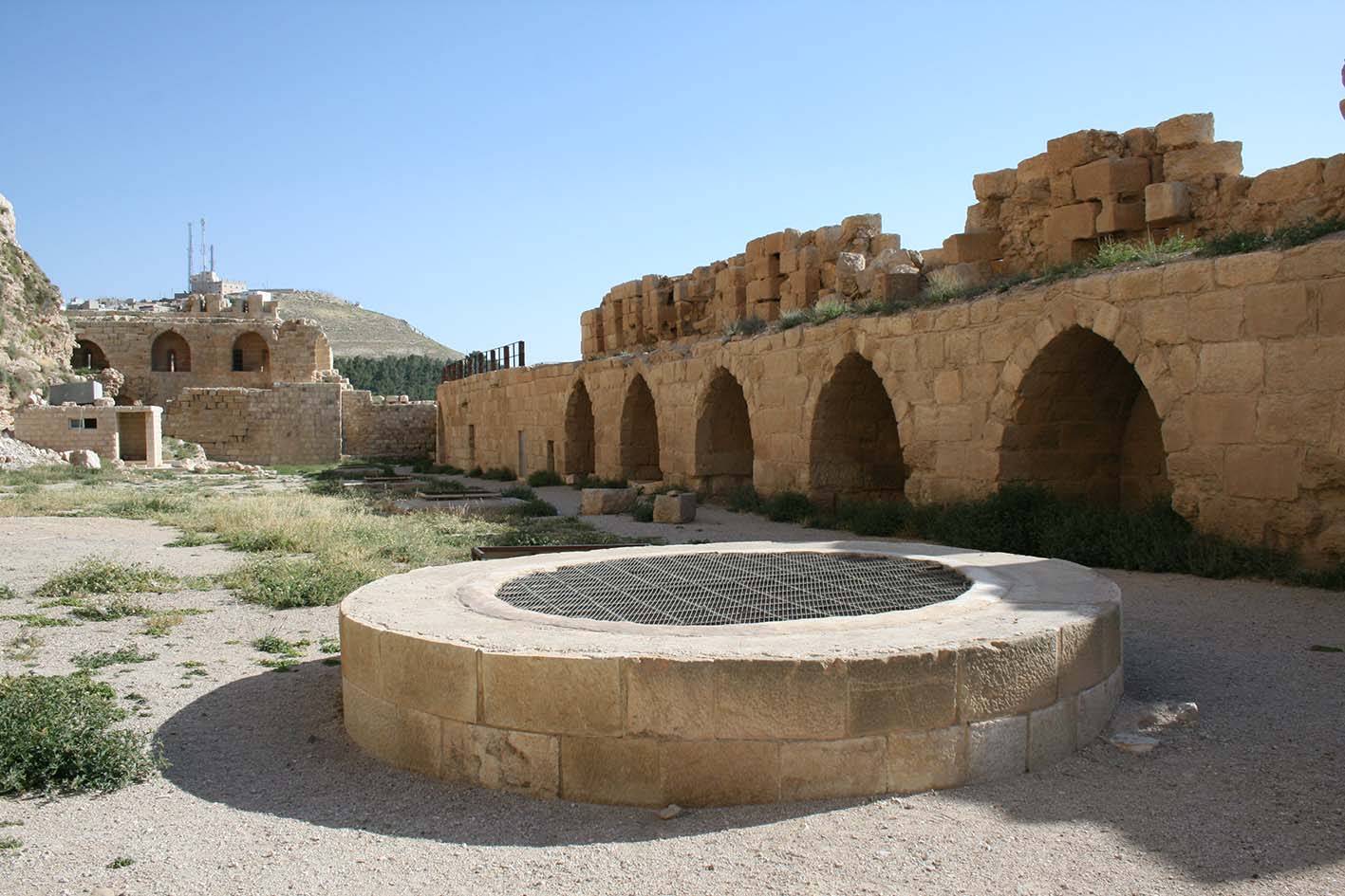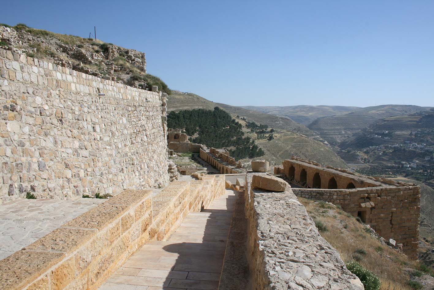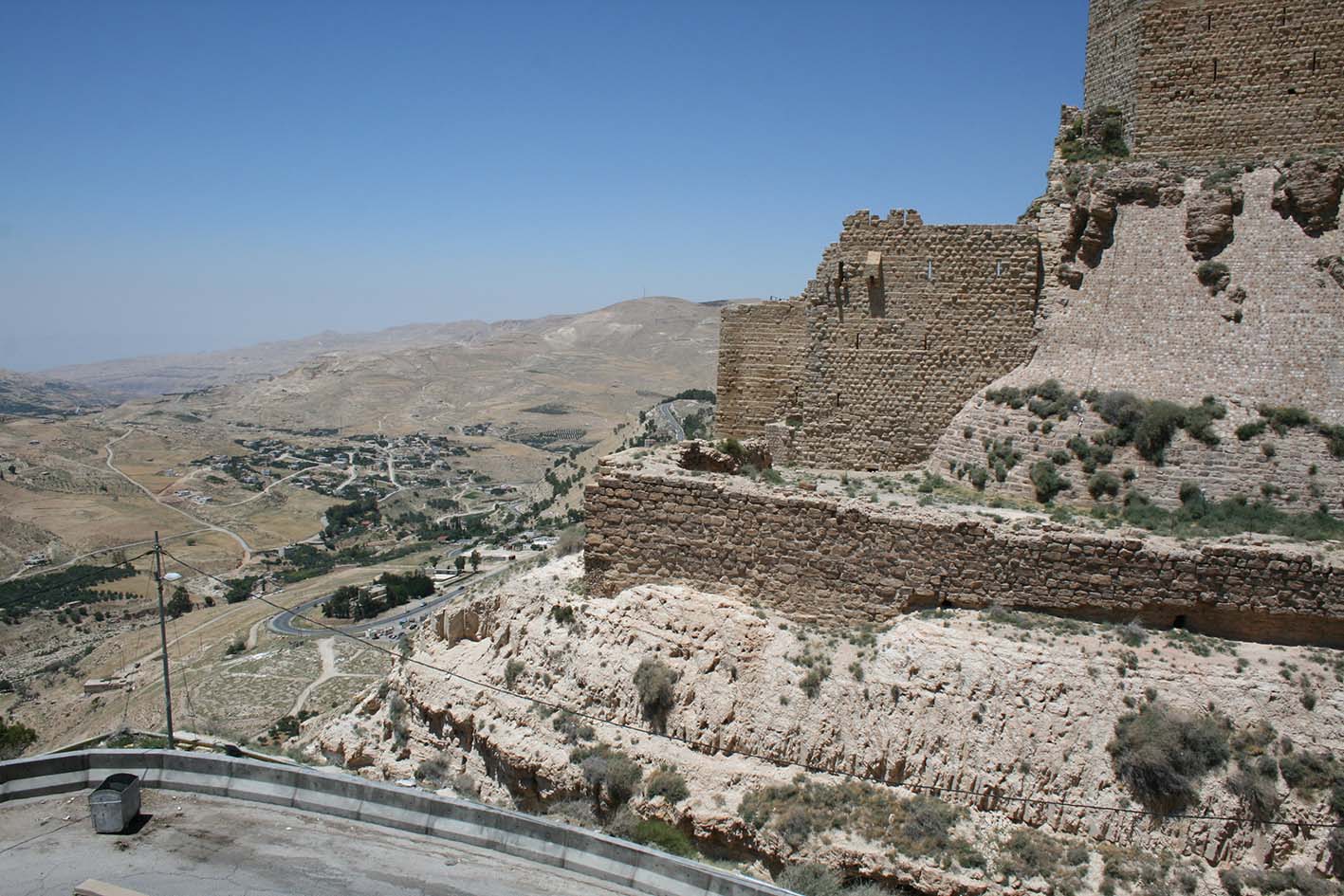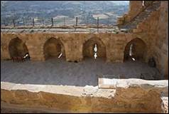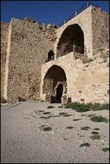 The most interesting building at Kerak is the huge Castle (now barracks) on the S. side. It is separated from the adjoining hill on the S. by a large artificial moat, and is provided with a reservoir. A moat also skirts the N. side of the fortress, and on the E. side the wall has a sloped or battered base. The walls are very thick and well preserved. The extensive galleries, corridors, and colonnades constitute it an admirable example of a Crusader's castle. The upper stories are in ruins, but the approaches to them are still in good preservation. A staircase descends into a subterranean chapel, where traces of frescoes are still visible. In the interior of the fortress are numerous cisterns. Although the springs are situated immediately outside the town, large cisterns have been constructed within the town (particularly by the tower of Beibars). The view from the top of the castle embraces the Dead Sea and the surrounding mountains. In the distance the Mt. of Olives, and even the Russian buildings beyond it, are visible. A survey of the valley of Jordan as far as the heights of Jericho is also obtained .