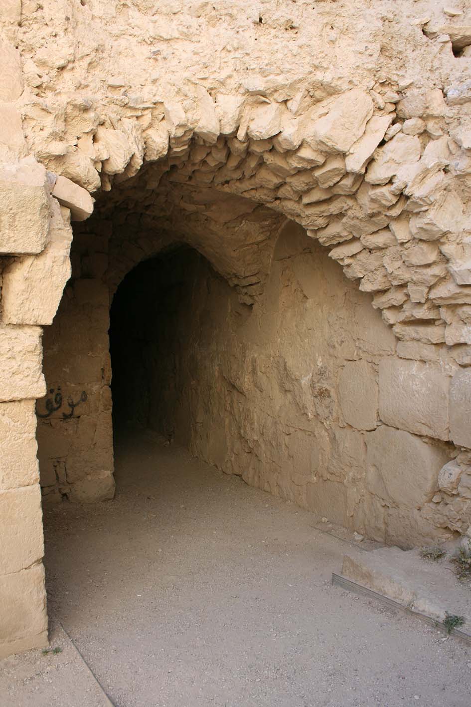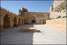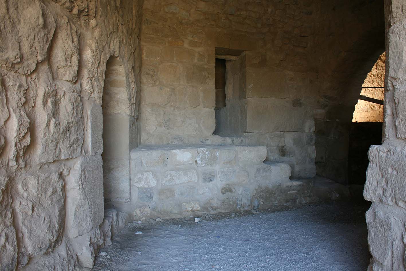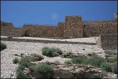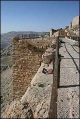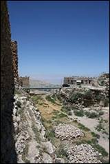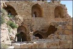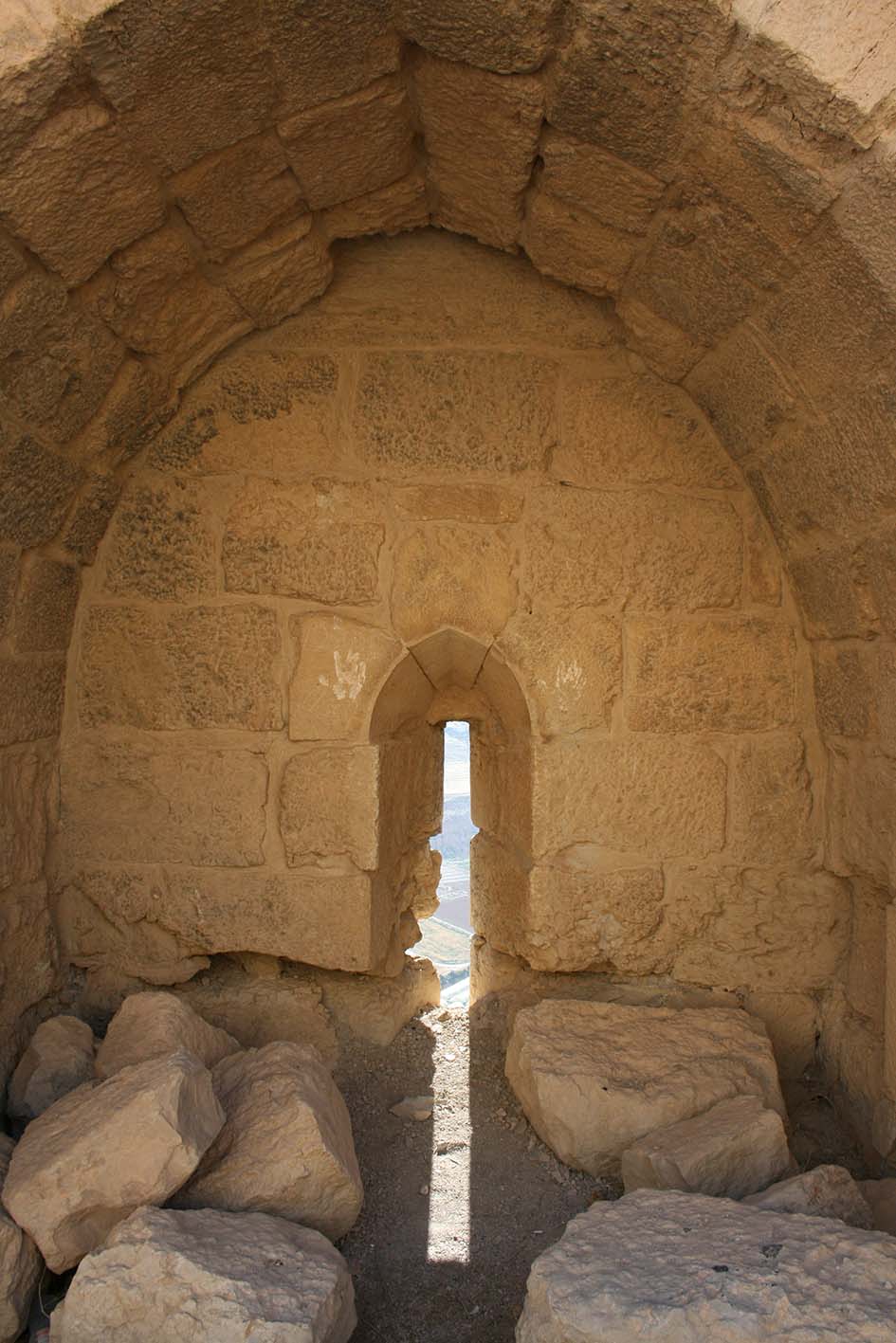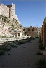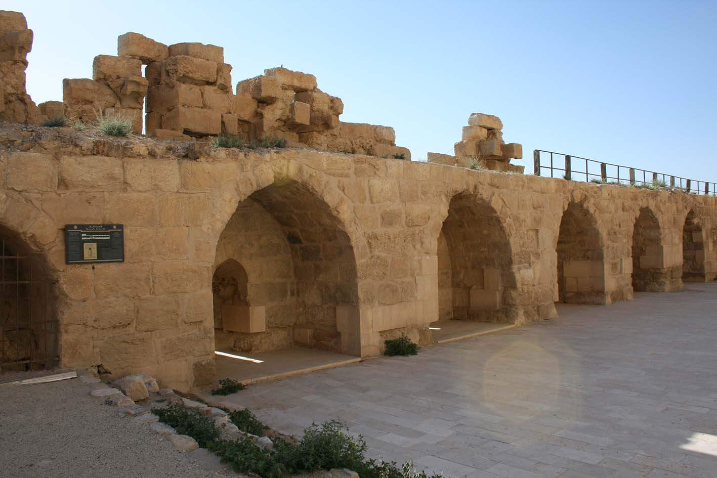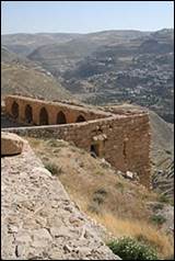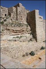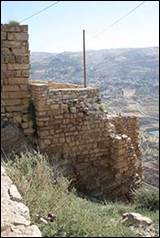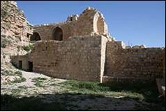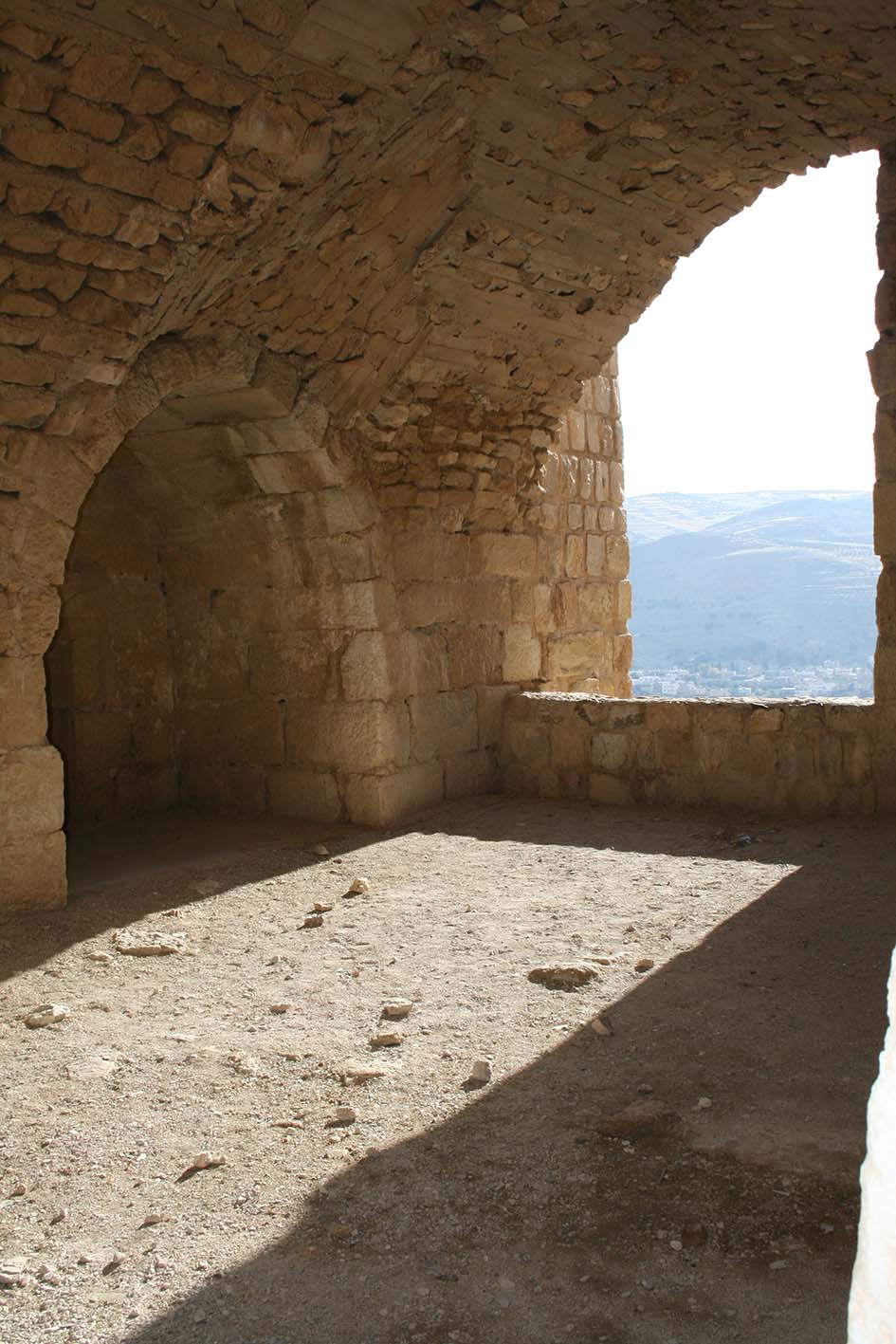 The most interesting building at Kerak is the huge Castle (now barracks) on the S. side. It is separated from the adjoining hill on the S. by a large artificial moat, and is provided with a reservoir. A moat also skirts the N. side of the fortress, and on the E. side the wall has a sloped or battered base. The walls are very thick and well preserved. The extensive galleries, corridors, and colonnades constitute it an admirable example of a Crusader's castle. The upper stories are in ruins, but the approaches to them are still in good preservation. A staircase descends into a subterranean chapel, where traces of frescoes are still visible. In the interior of the fortress are numerous cisterns. Although the springs are situated immediately outside the town, large cisterns have been constructed within the town (particularly by the tower of Beibars). The view from the top of the castle embraces the Dead Sea and the surrounding mountains. In the distance the Mt. of Olives, and even the Russian buildings beyond it, are visible. A survey of the valley of Jordan as far as the heights of Jericho is also obtained .