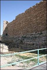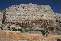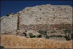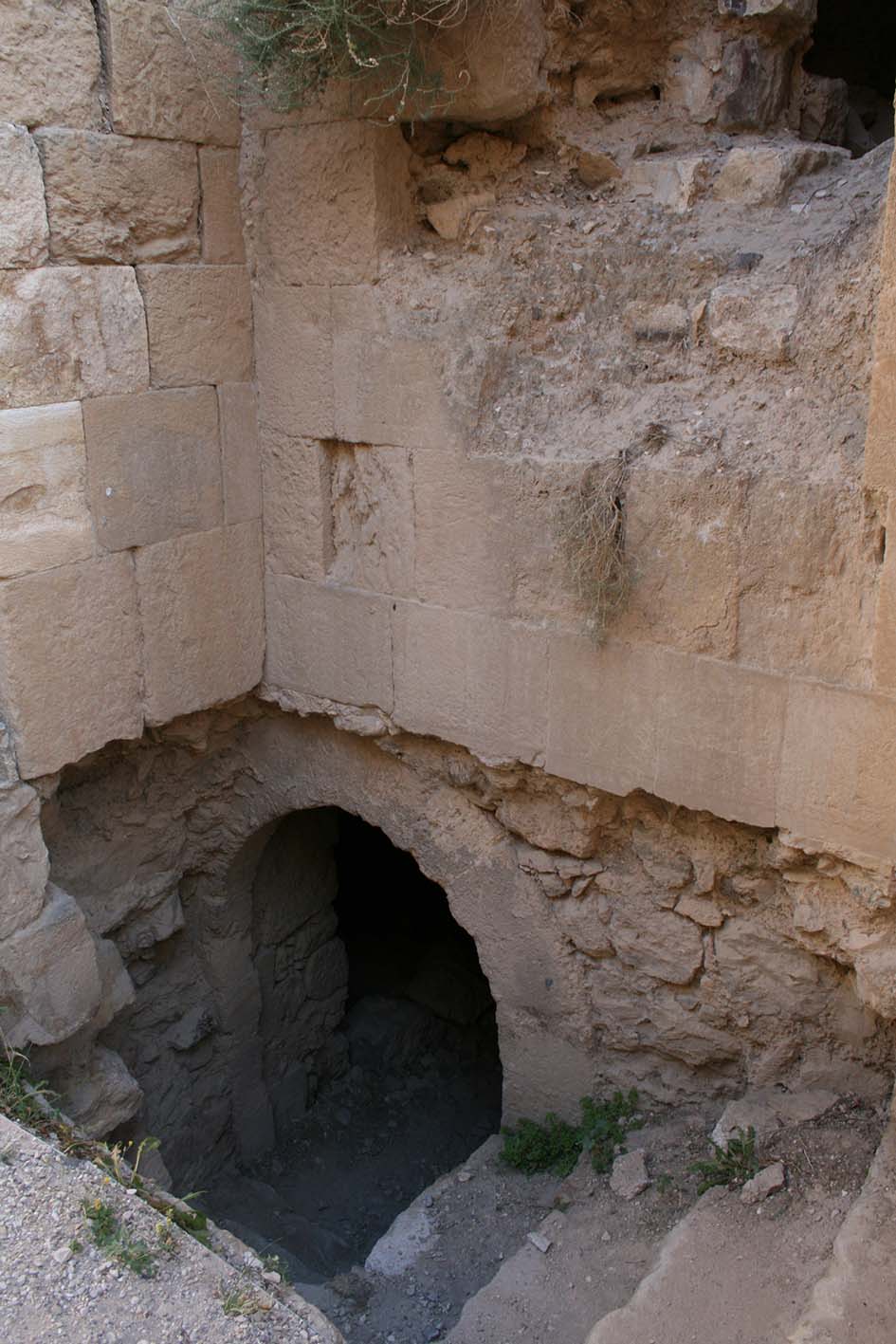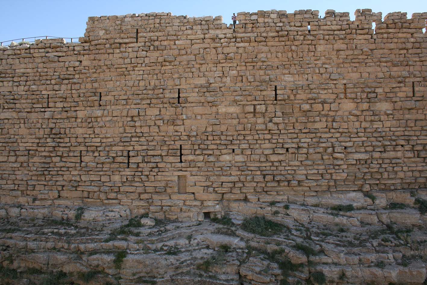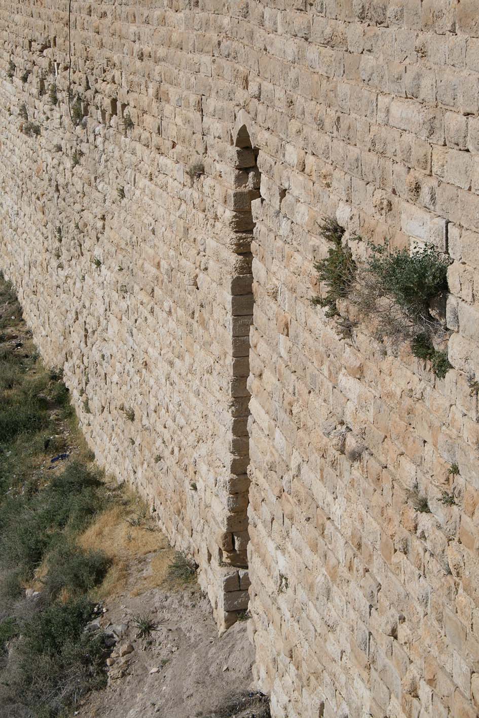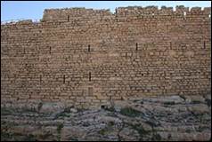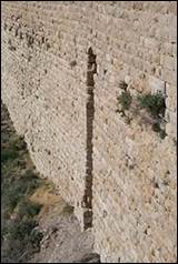 is cut off from the shoulder of the adjoining hill by an immense scarped ditch, just as is the other castle; but there is no passage this way, and a wall of native rock has been left at each end, so as to form, in fact, a gigantic cistern. Beside this, there is an immense hewn ditch 100 feet wide. The outer wall of this castle is constructed on the same principle as the north-west tower, but of much greater thickness and