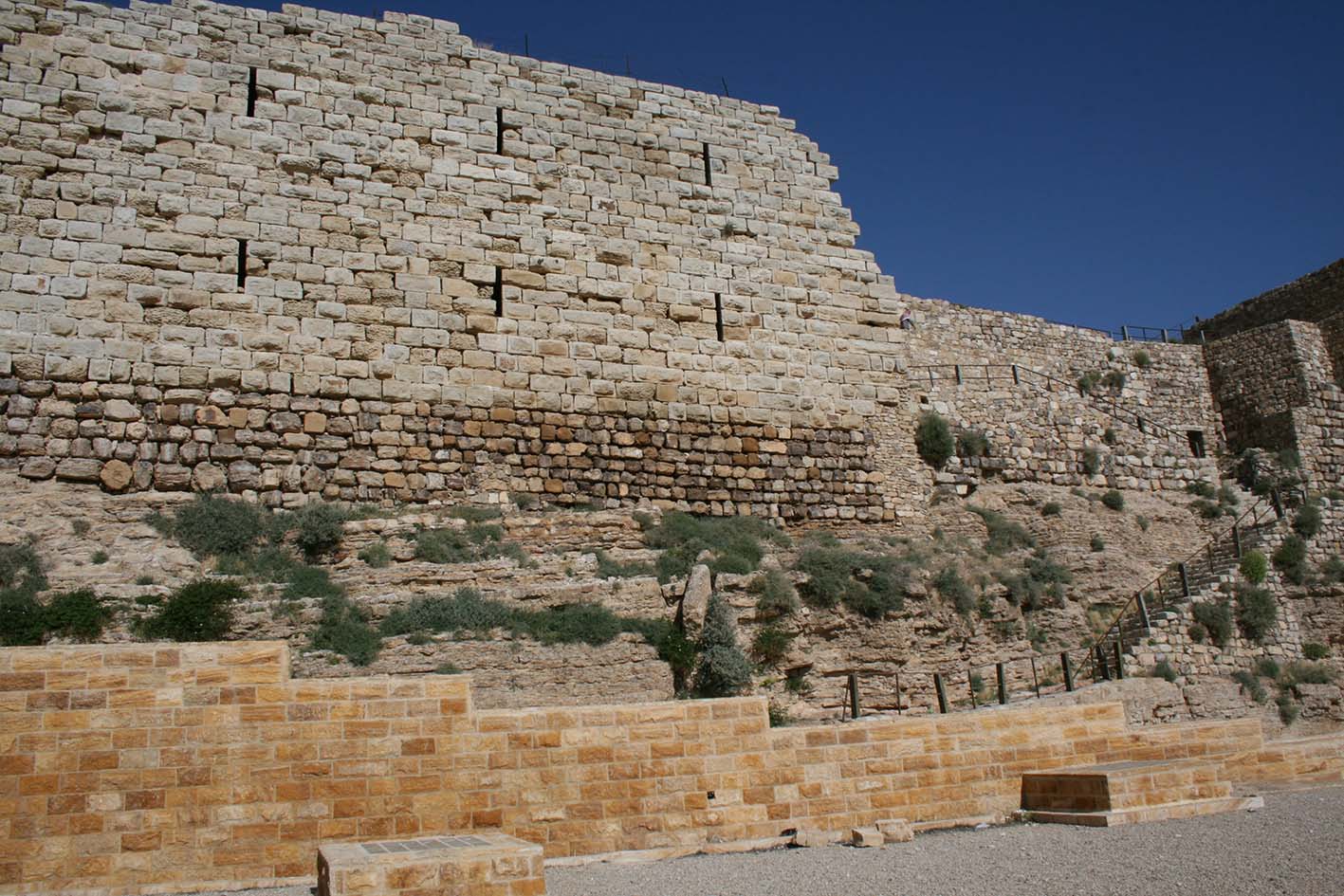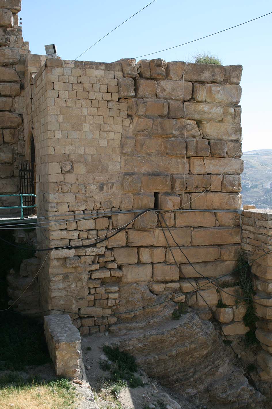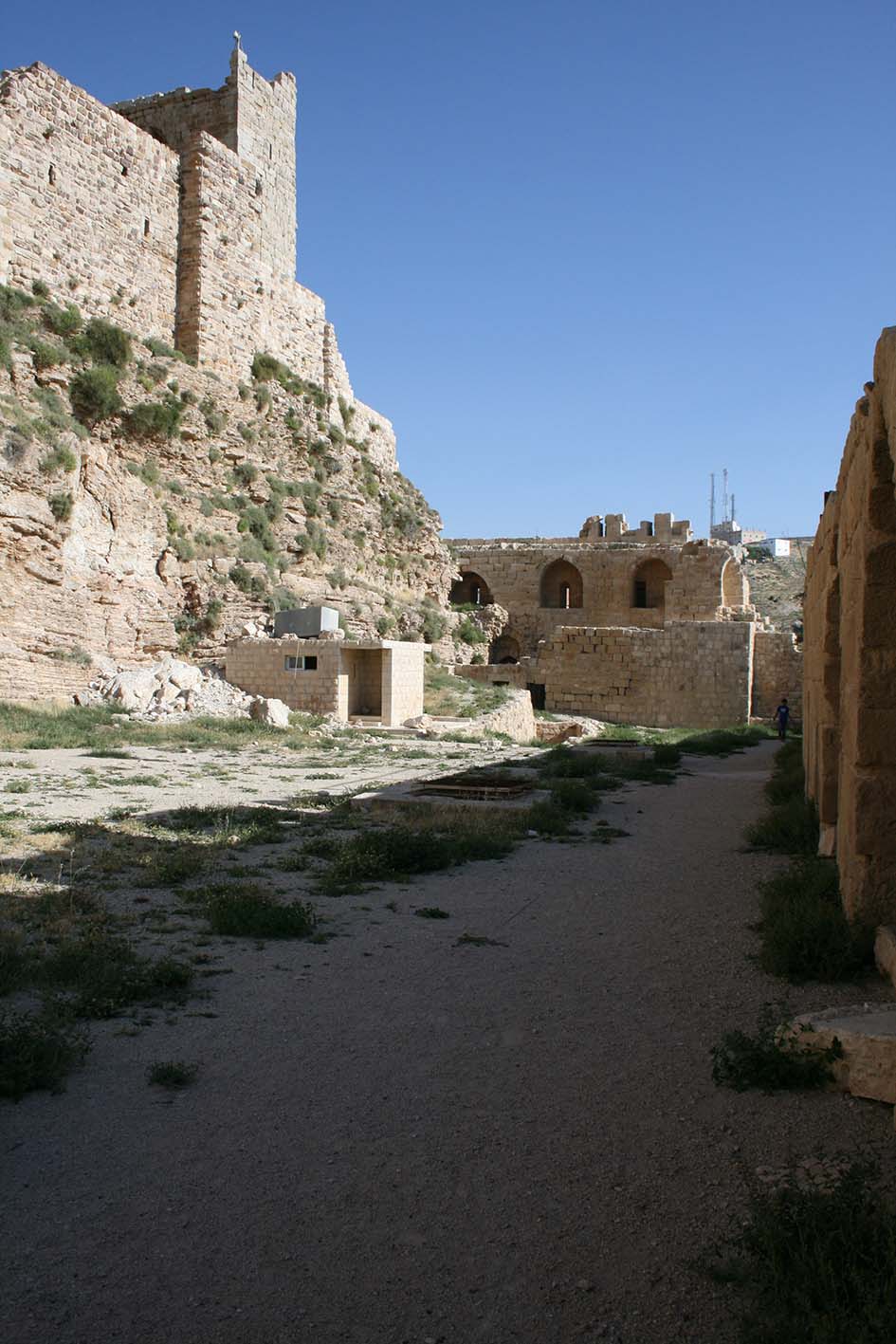 Le pied des murailles est défendu par de puissants talus qui devaient arrêter facilement les attaques de l’ennemi. Ces talus, construits en maçonnerie, existent surtout à l’est et au sud-est. Ils étaient moins nécessaires du côté de l’ouest, parce que l’escarpement de la colline forme un talus naturel qui devait être à peu près impossible à franchir. L’intérieur de la forteresse renferme encore de nombreuses citernes, des magasins immenses construits avec le plus grand soin. Ces magasins, qui forment jusqu’à 5 ou 6 étages superposés, sont aujourd’hui en partie comblés, mais ils donnent l’idée des approvisionnements énormes que pouvaient contenir une place de cette importance. Au nord, la forteresse était défendue par un château à plusieurs étages de galeries, dont il subsiste encore toute la face septentrionale. C’est cette masse imposante qu’on apreçoit sur la droite en arrivant à Kerak.