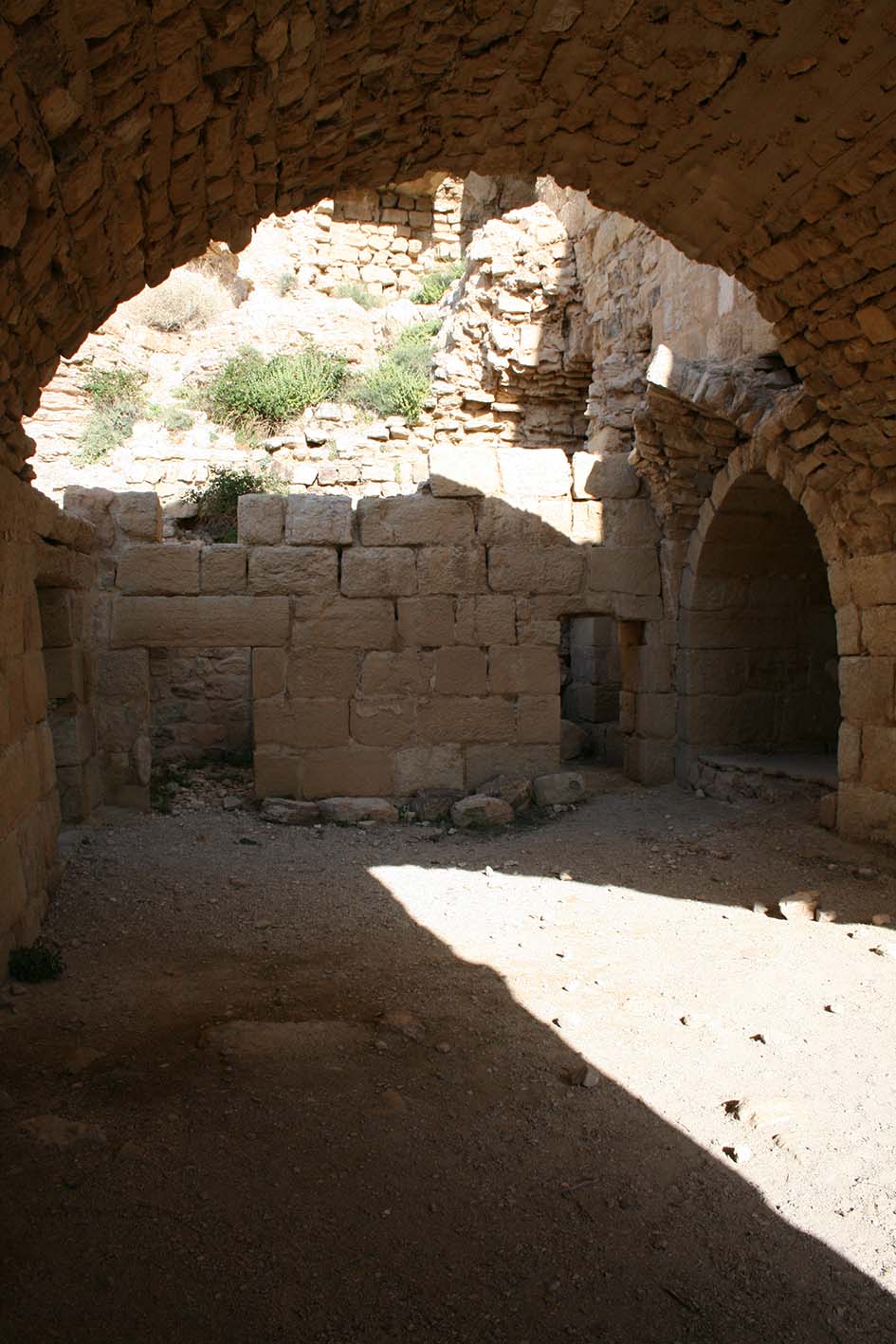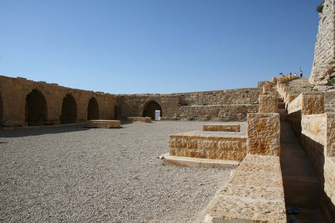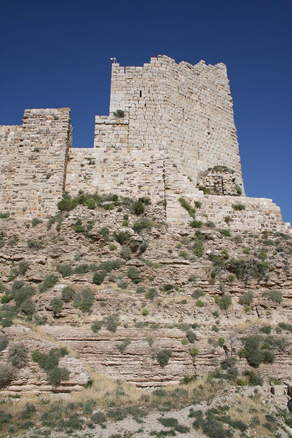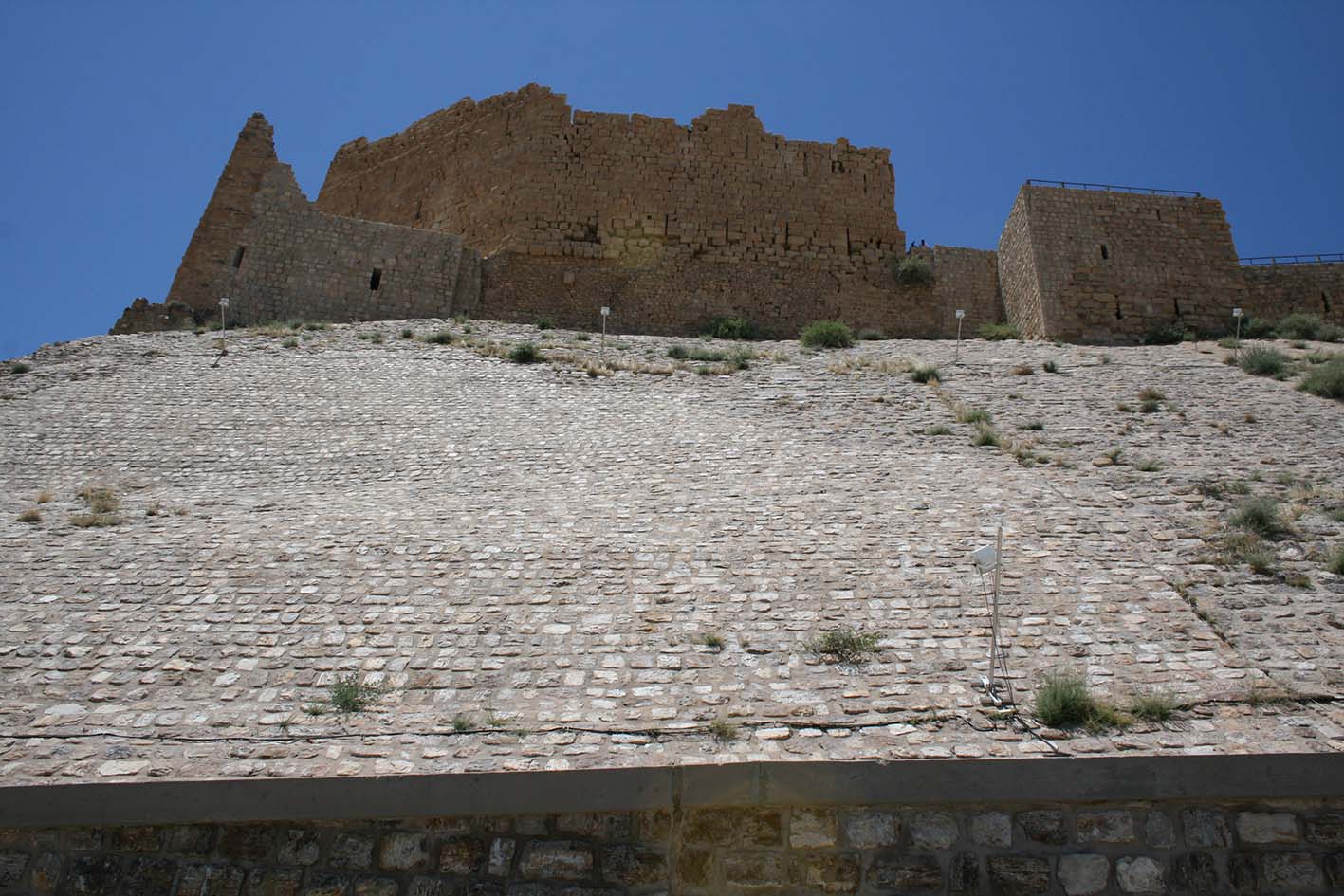 Le pied des murailles est défendu par de puissants talus qui devaient arrêter facilement les attaques de l’ennemi. Ces talus, construits en maçonnerie, existent surtout à l’est et au sud-est. Ils étaient moins nécessaires du côté de l’ouest, parce que l’escarpement de la colline forme un talus naturel qui devait être à peu près impossible à franchir. L’intérieur de la forteresse renferme encore de nombreuses citernes, des magasins immenses construits avec le plus grand soin. Ces magasins, qui forment jusqu’à 5 ou 6 étages superposés, sont aujourd’hui en partie comblés, mais ils donnent l’idée des approvisionnements énormes que pouvaient contenir une place de cette importance. Au nord, la forteresse était défendue par un château à plusieurs étages de galeries, dont il subsiste encore toute la face septentrionale. C’est cette masse imposante qu’on apreçoit sur la droite en arrivant à Kerak.